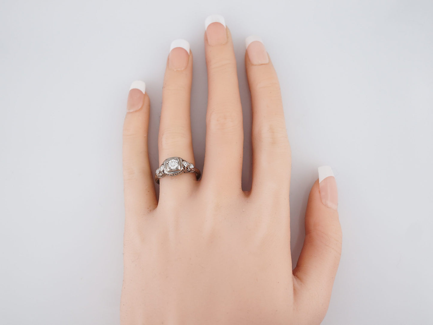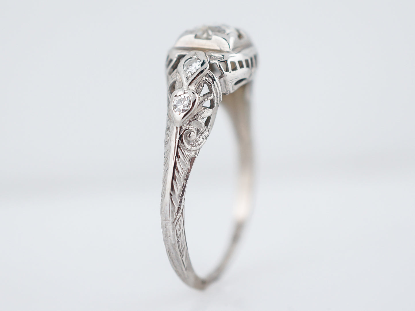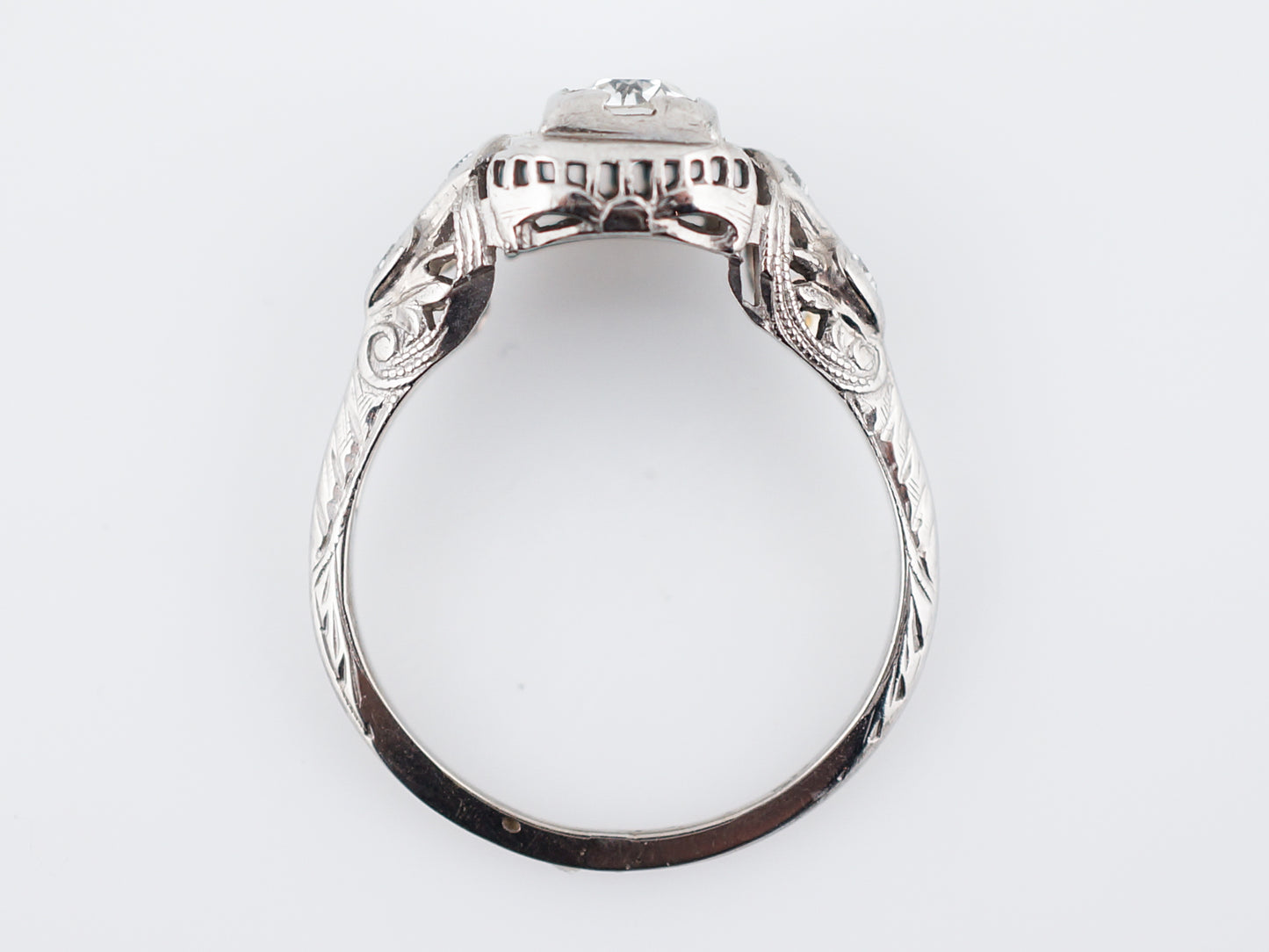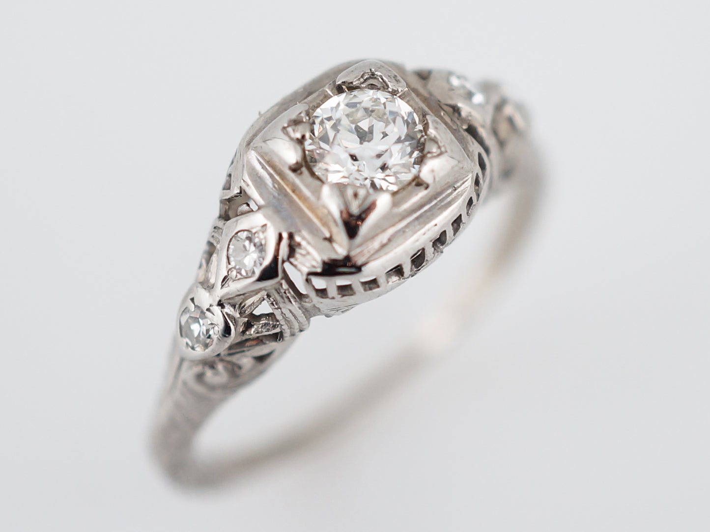 This original antique art deco engagement ring features a .31 carat transitional cut diamond set in an 18 karat white gold mounting. The center stone is prong set and has a low profile appearance. The center stone is accented by four (4) single cut diamonds adding additional scintillation and brilliance. The 18 karat white gold mounting features beautiful swirling filigree details which cascade down the shank of the ring. Gentle milgrain detailing rounds out this wonderful art deco era ring.