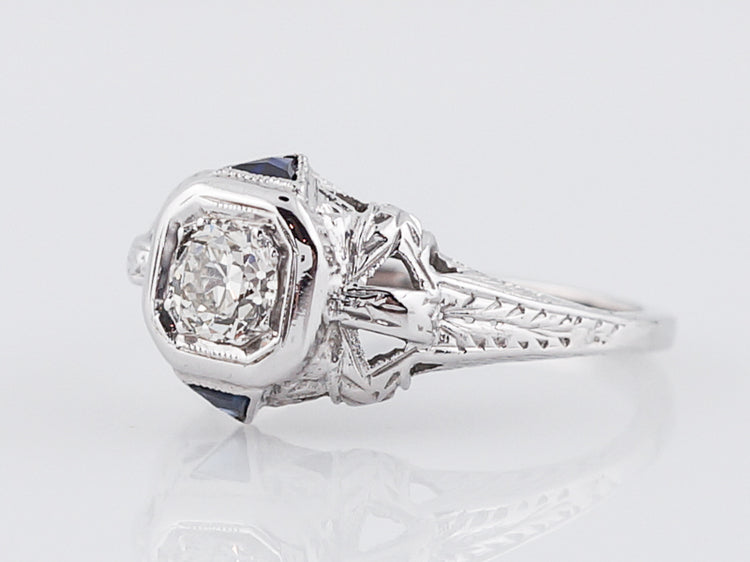 This late Art Deco engagement ring is finished in 18k white gold and features a bead set old European cut diamond at its center. The center diamond is set into an octagonal station which is finished with fine milgrain detail. Se in the North/South style, two (2) calibre trillion cut blue sapphires are bezel set. The shoulders of the ring feature an open piece-work design with a finely engraved chevron pattern running down the shank of the ring. A wonderful example of Art Deco geometric design!