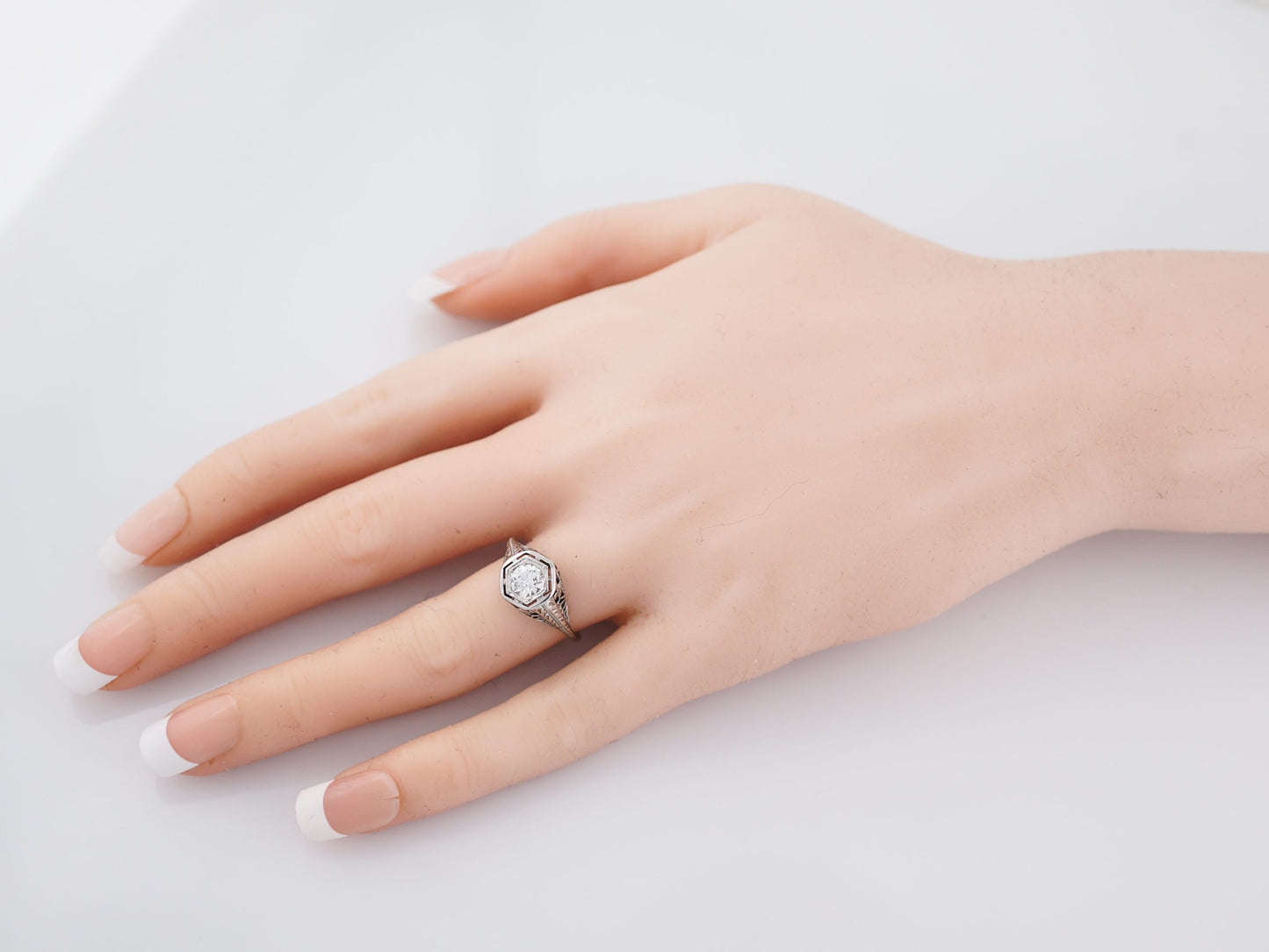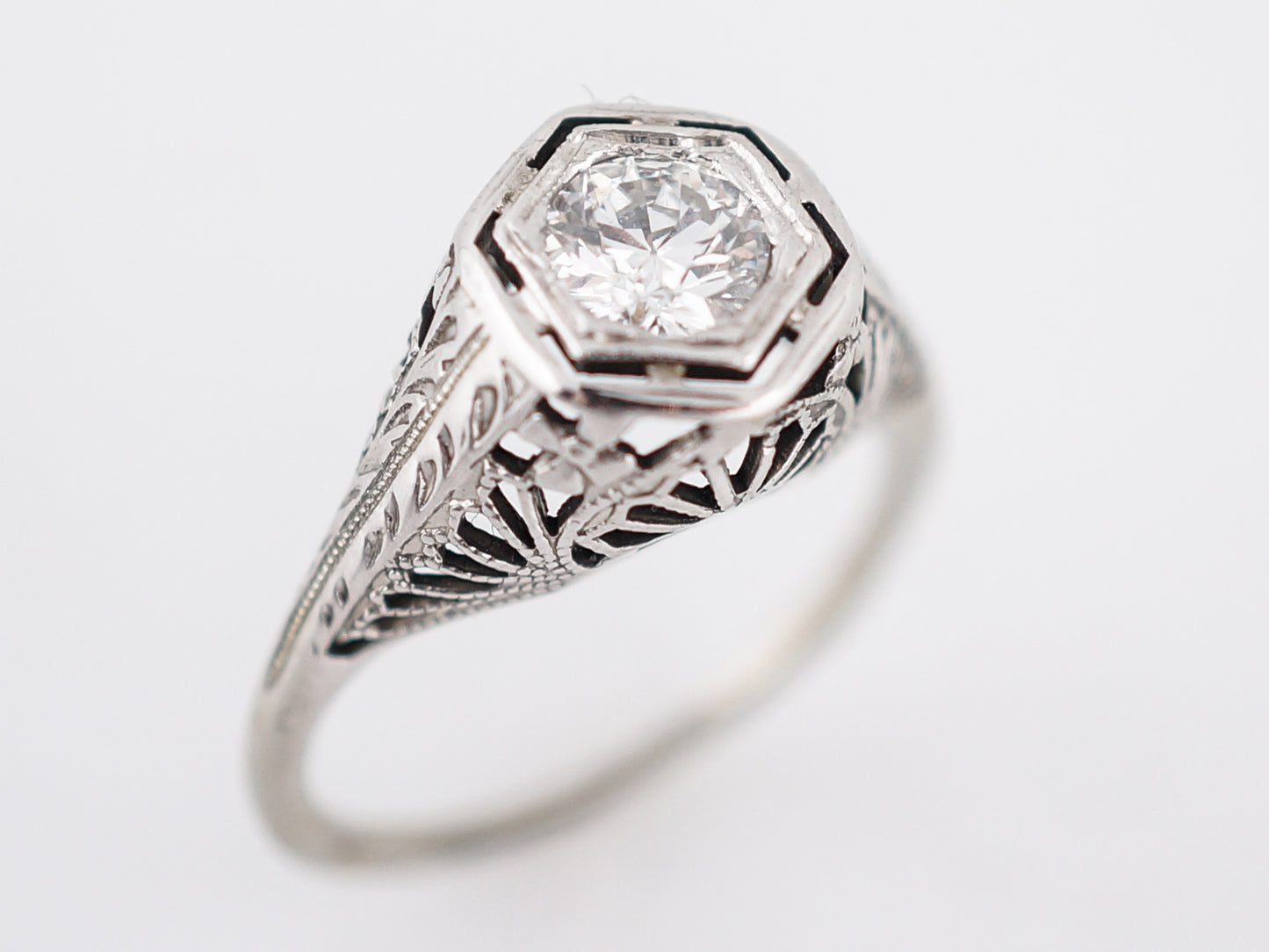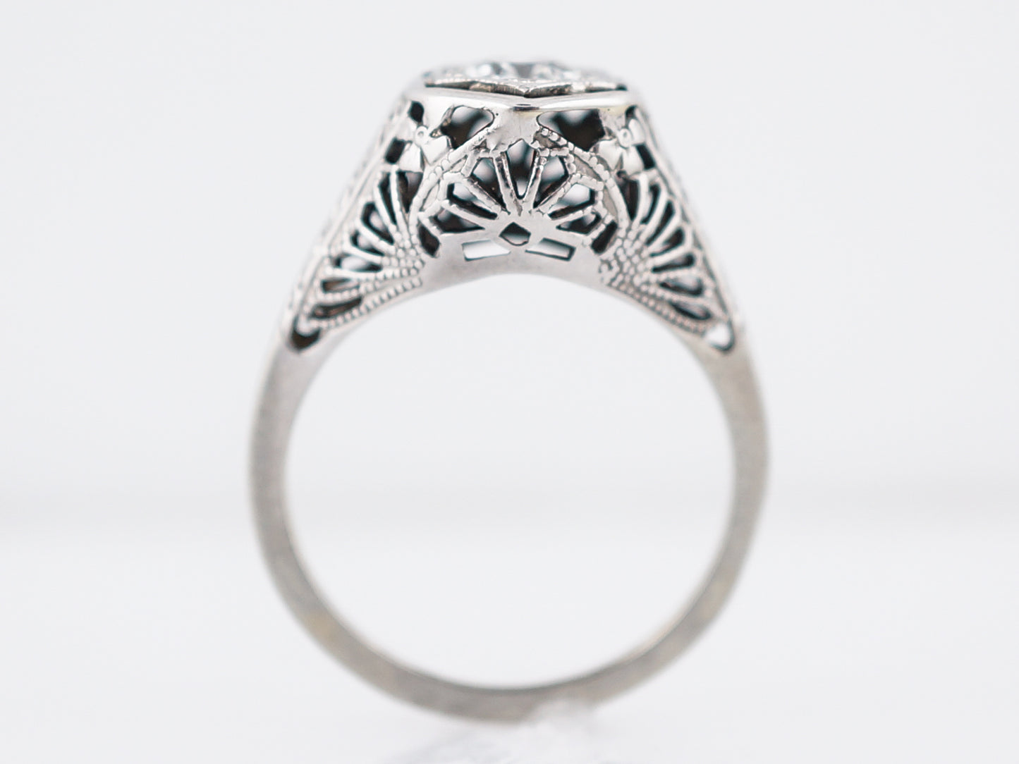 This original Art Deco engagement ring features a .49 carat old European cut diamond bead set into a hexagonal basket. A gorgeous filigree design accents the solitaire diamond with open scroll work to all sides. Additionally, a milgrain line runs down from the diamond basket and ends in the rings shank.