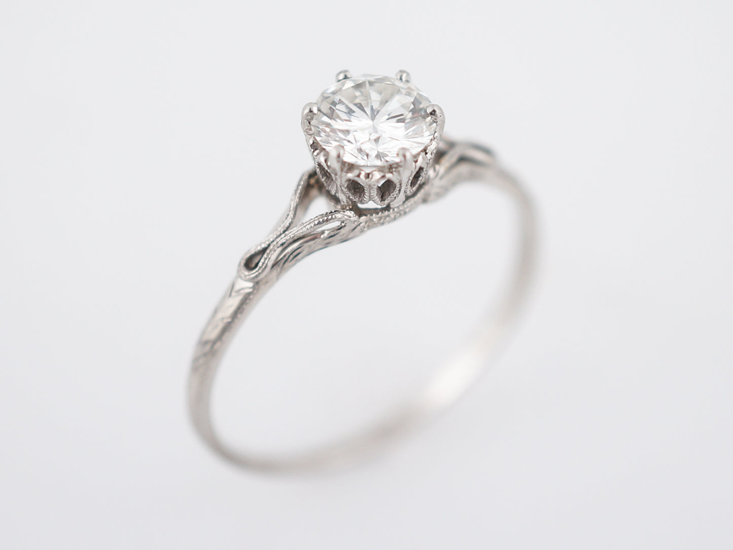 This antique art deco diamond solitaire is set with a .53 carat old round brilliant cut center diamond in platinum. The center diamond is set in a six (6) prong filigree head. The mounting features a scrolling repousse design and offers interesting texture. This elegant solitaire has multiple desirable elements of antique designs and is a truly gorgeous antique solitaire engagement ring.