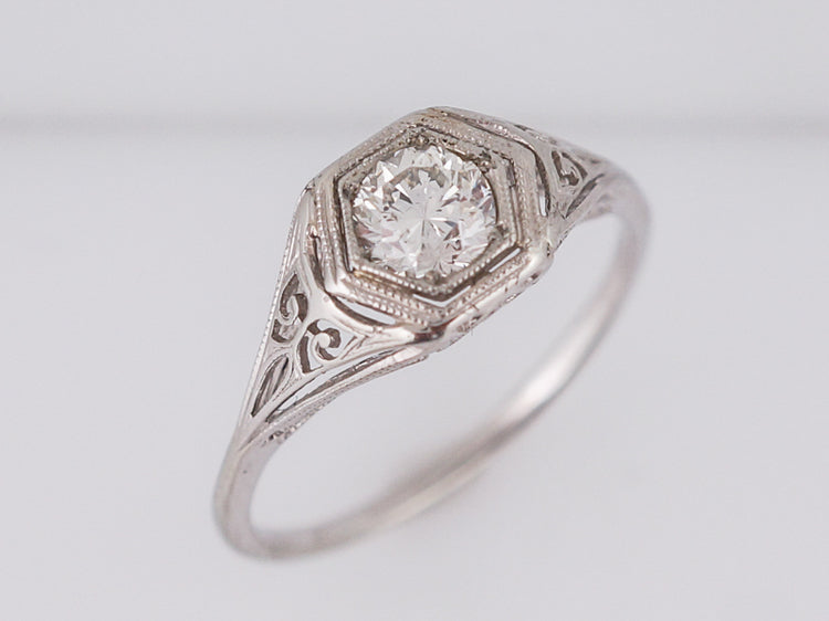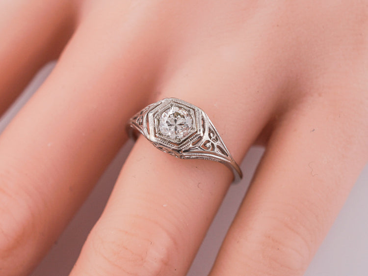 This lovely original Art Deco engagement ring is finished in bright white 18k white gold. At its center is a bead set .54 carat old European cut diamond, which is set into a hexagonal head. The edges of the hexagon are finished with crisp milgrain, giving the ring further sparkle. Each shoulder of the ring is adorned with fine open filigree pierce work which transcends into into a simple and delicate shank.