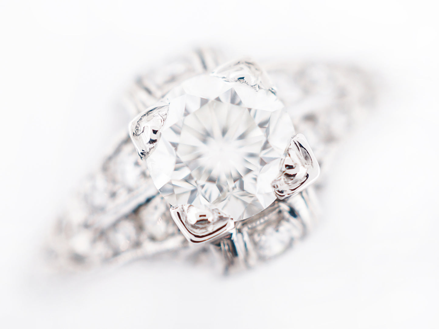 This antique art deco engagement ring features a .59 carat old European cut diamond set in platinum. The center diamond sits low on the finger and is surrounded by single cut diamonds. Shimmering from every angle, this ring embodies 1920s style!