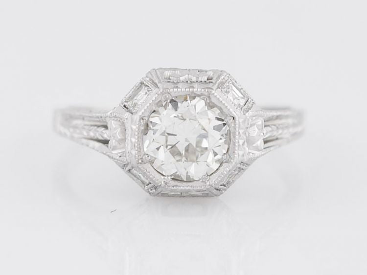 This original antique engagement ring has a glittering .80 Old European cut diamond at its center. The diamond is framed by an octagonal outer bezel with a crisp milgrain edge. There are four baguette cut accent diamonds bordering each corner of the center diamond.