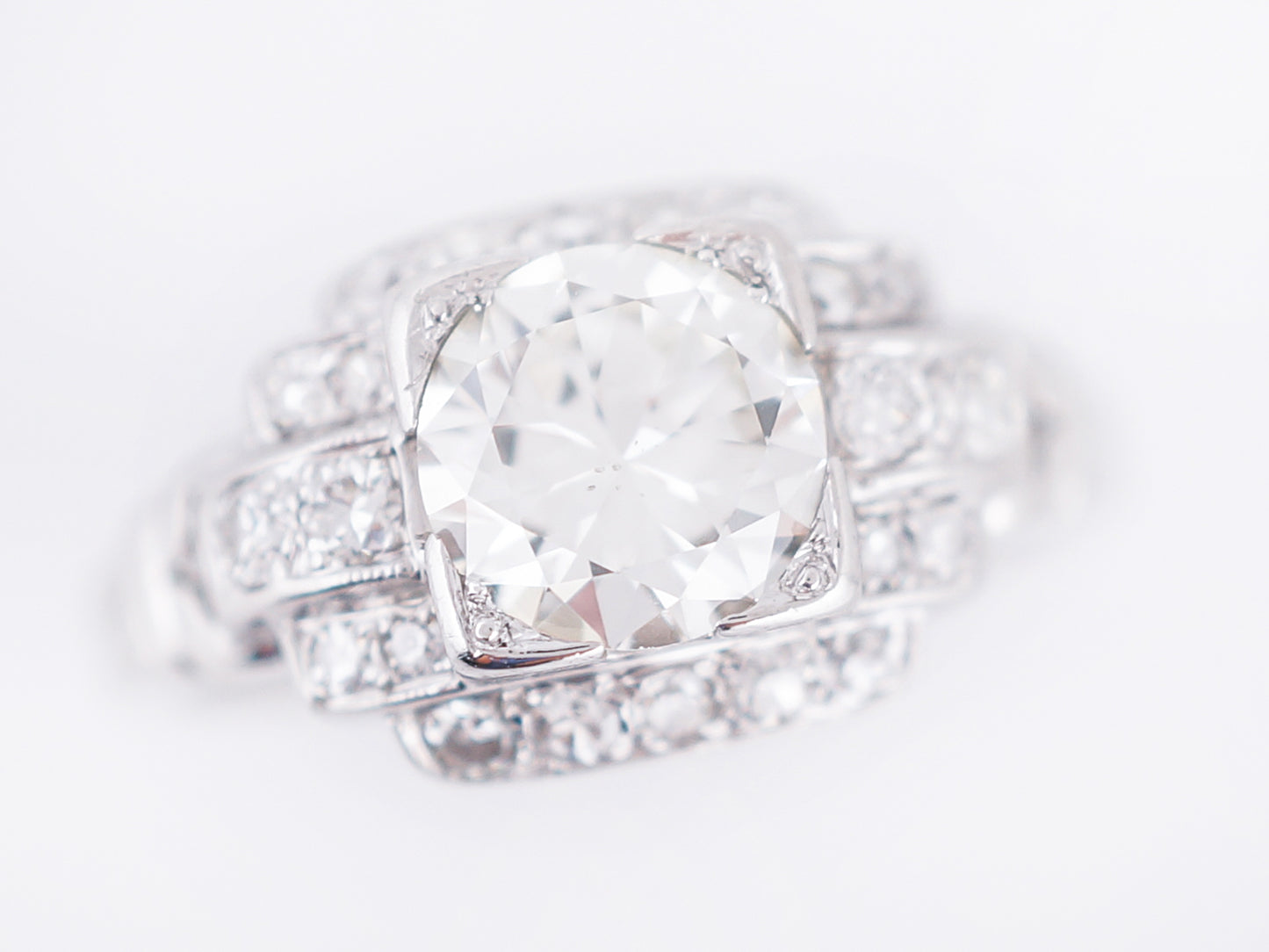 This beautiful engagement ring was made in the Art Deco era. The sparkling center diamond is a round brilliant cut that weighs .99 carat. The round stone is held in a square bezel giving the ring a geometric look. The center diamond is surrounded by a frame of smaller accent diamonds so the ring has a significant presence on the hand. The band has a high polish finish.