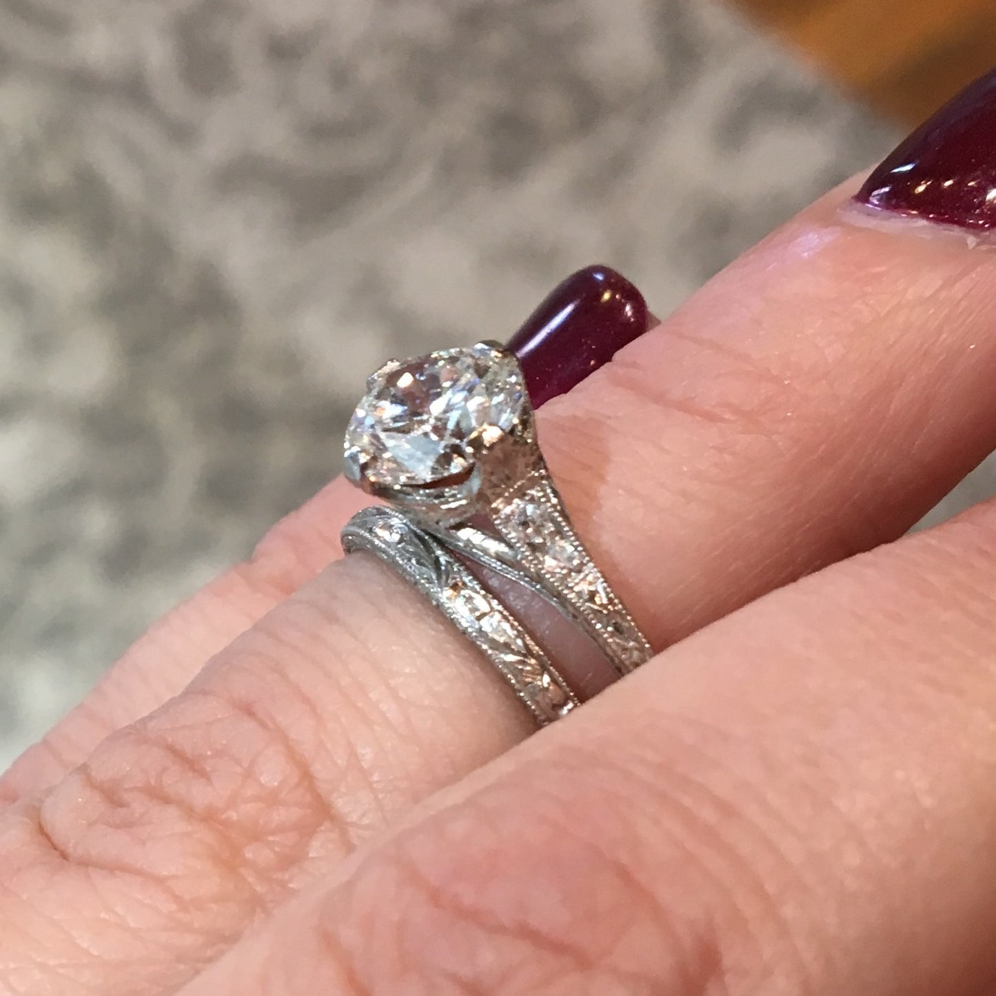 This Art Deco engagement ring has a G.I.A. certified diamond as its focal point. The prong set center diamond is a round brilliant cut that weighs 1.50 carats and glitters from every angle. There are also two small accent diamonds on each side of the center diamond that add a little extra sparkle. The band has an engraved geometric pattern on the sides as well as the top and bottom. The geometric pattern is trimmed in milgrain detailing which helps to identify this ring as an Art Deco piece. This ring has been fully restored to like new condition.