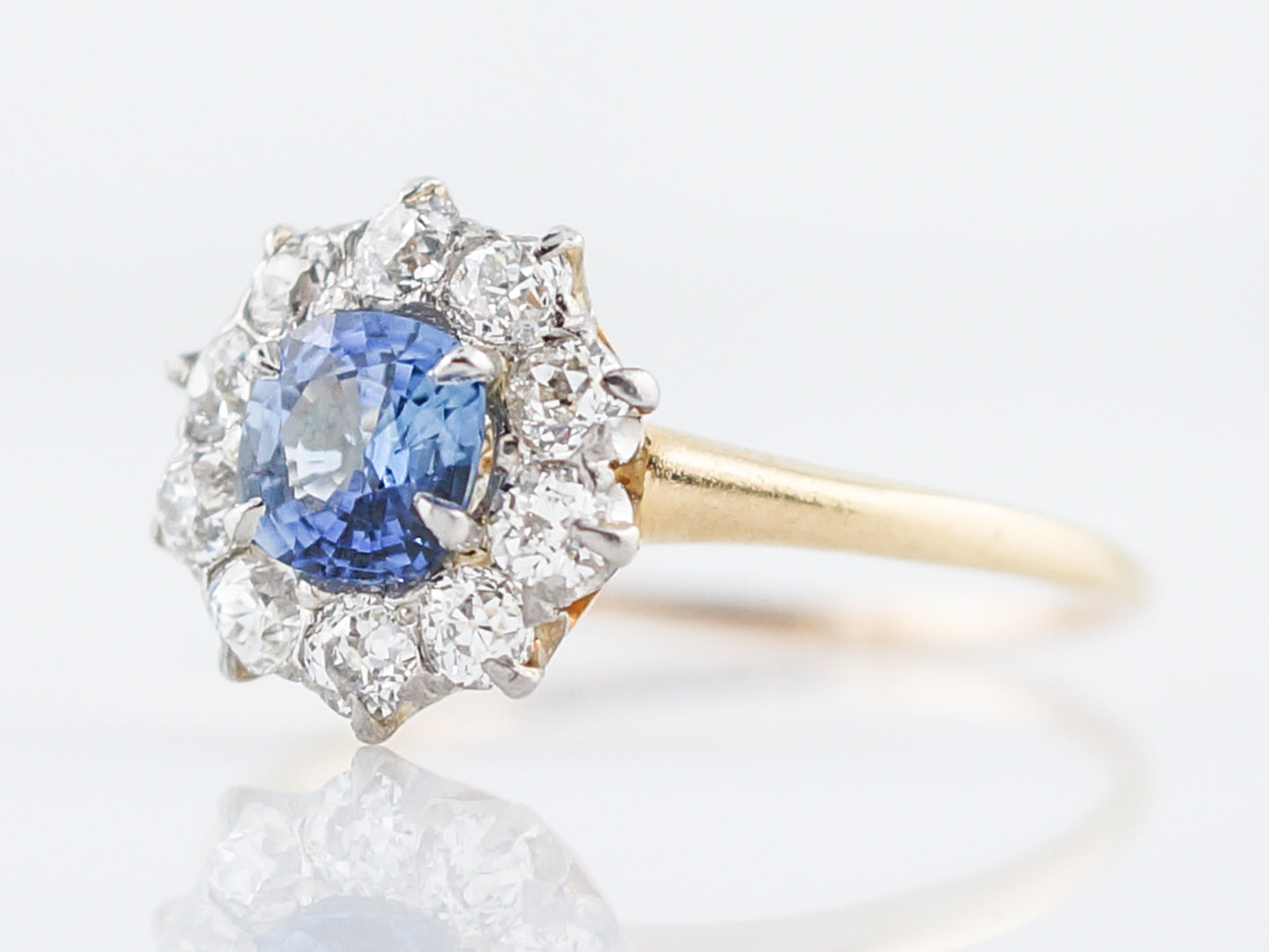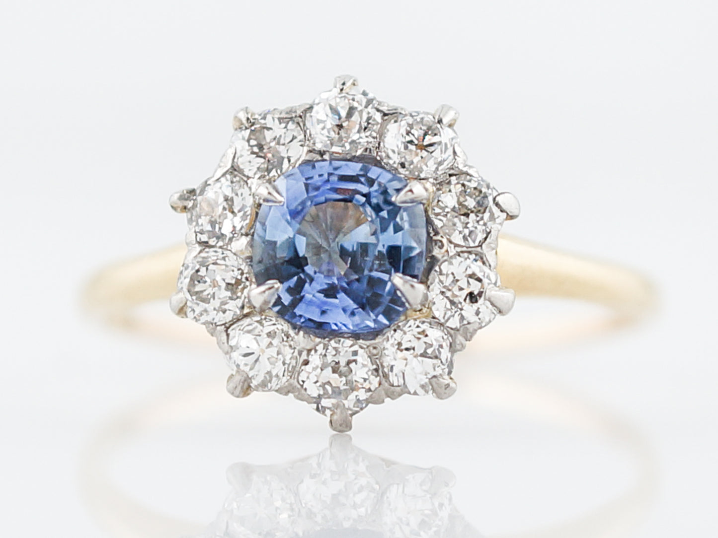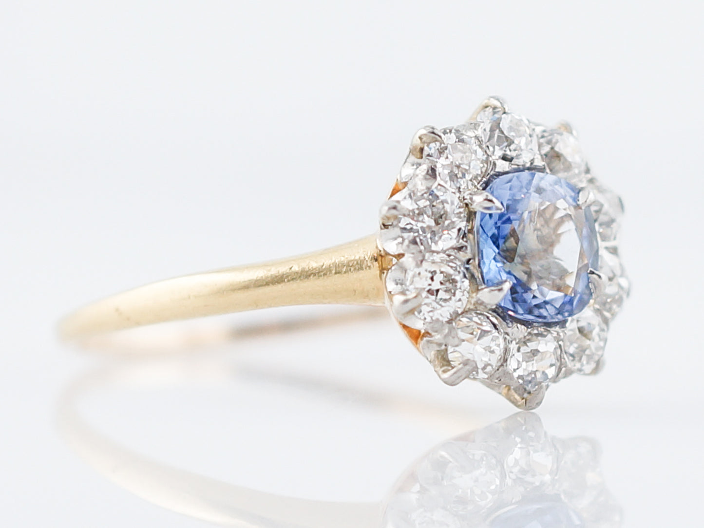 This engagement ring is from the Edwardian Era, a very brief period between 1901-1915. The center stone is a cornflower blue, cushion cut sapphire weighing .90 carats and is surrounded by ten (10) prong set diamonds weighing .75cttw. The top of the ring is made of Platinum while the shank of the ring is 14 karat yellow gold. The color of this sapphire is a stunning bluish-purple and has a beautiful sparkle.