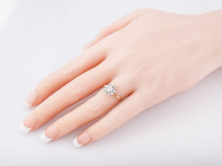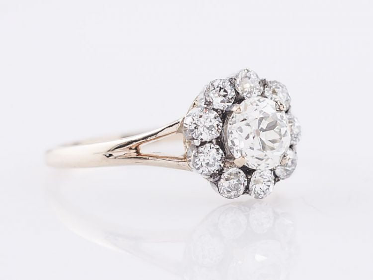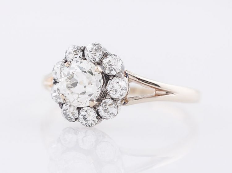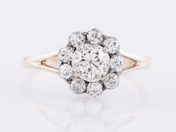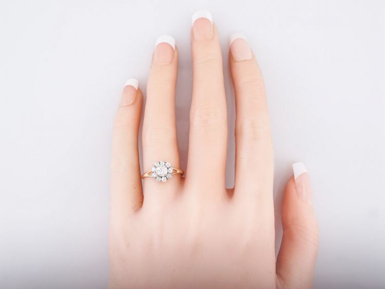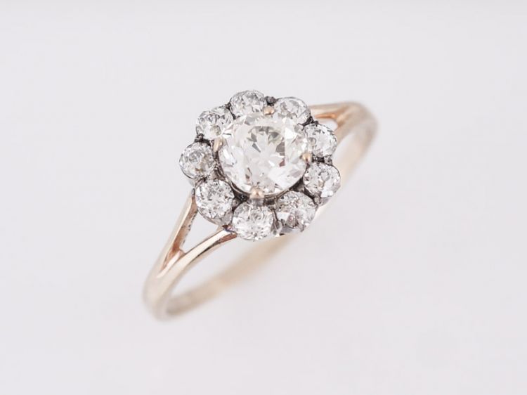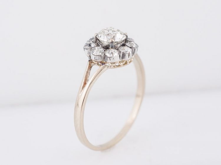 This antique cluster style engagement ring was made in the Victorian era. The center diamond is a beautiful Old European cut that weighs .52 carat. The center diamond is surrounded by nine sparkling Old Mine cut diamonds that total .27 carat. The 14k yellow gold band is one piece as it circles around the finger and then splits into two where it meets the gemstones.