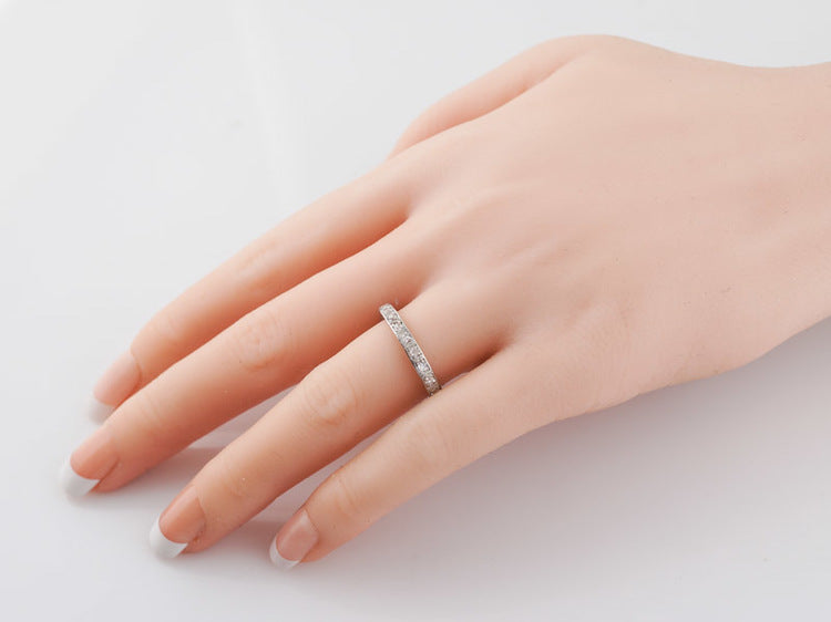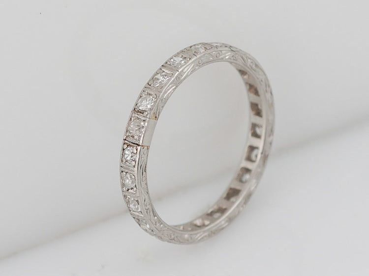This original antique Art Deco diamond eternity wedding band is set with twenty-two (22) old European cut diamonds. The diamonds are bead set in the platinum mounting. The band features very light orange blossom engraving around the length of the band while the inside edges are engraved with a light, scrolling organic design.