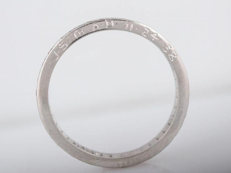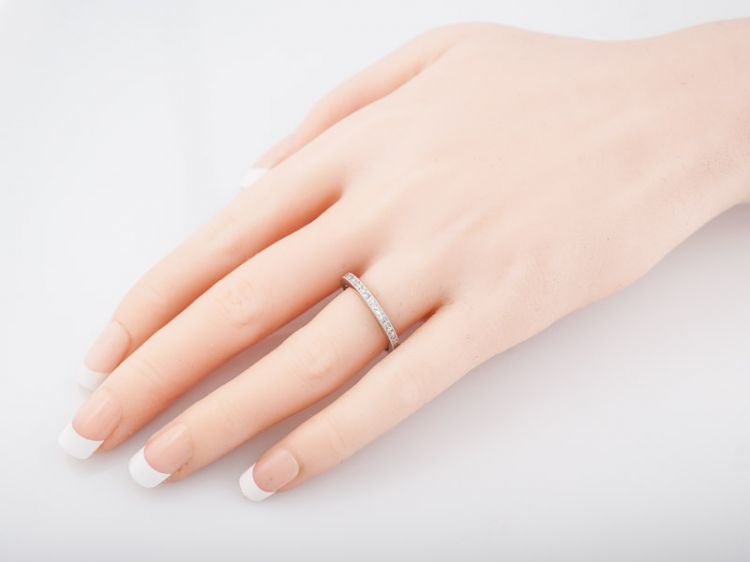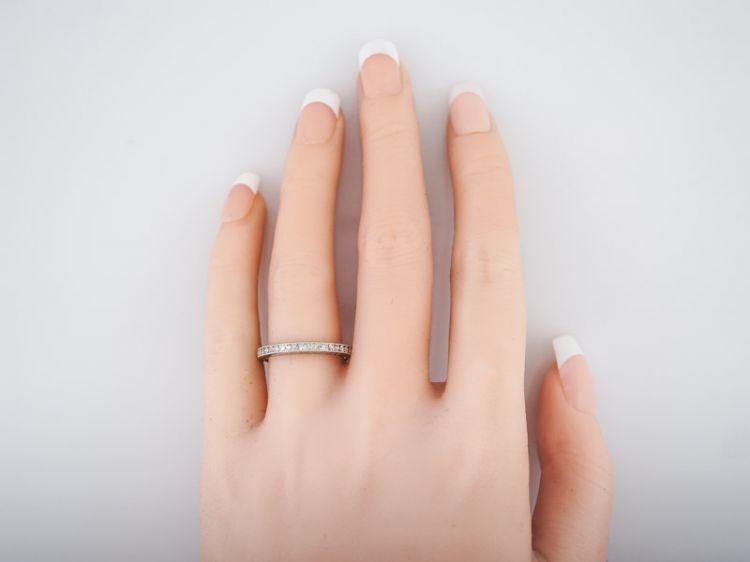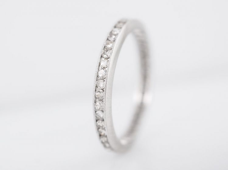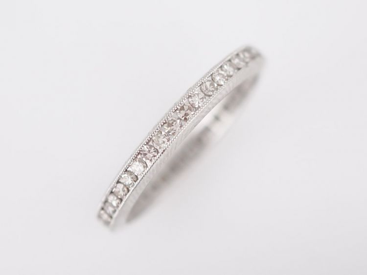 This antique wedding band was made in the Art Deco era. This ring has diamonds running the entire length of the band so its referred to as an eternity band. This band has fifty single cut diamonds for a total carat weight of the .50 carat. The diamonds are channel set into the band and there is a milgrain edge framing the stones on both the top and bottom of the ring.