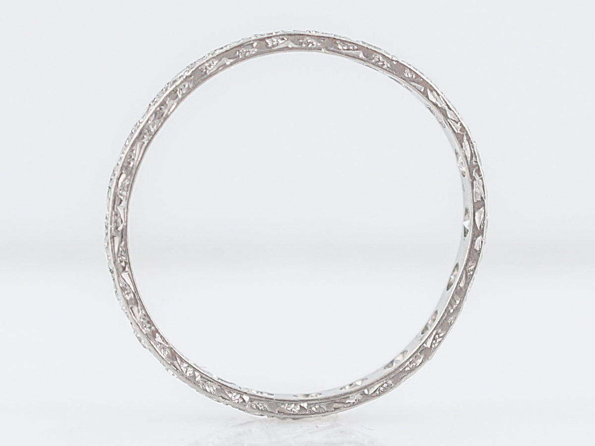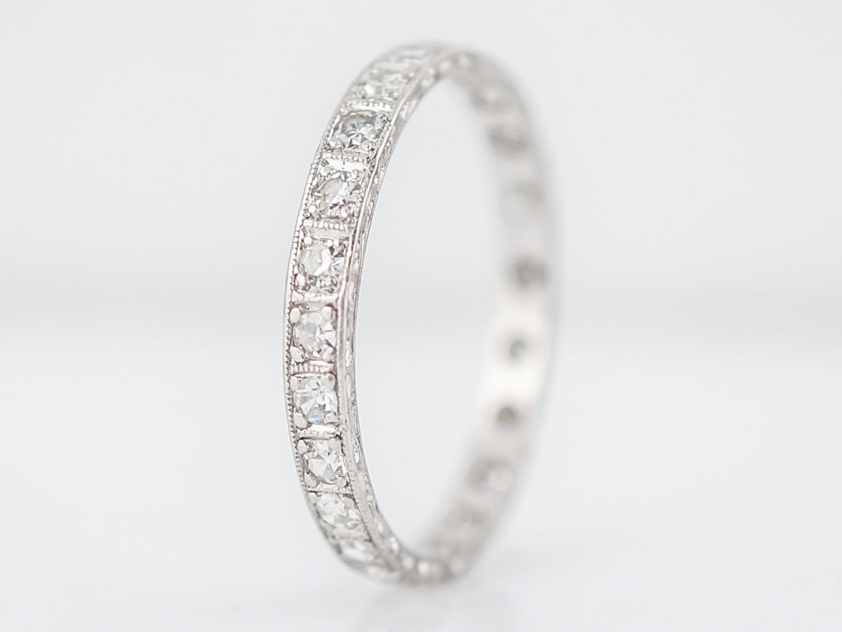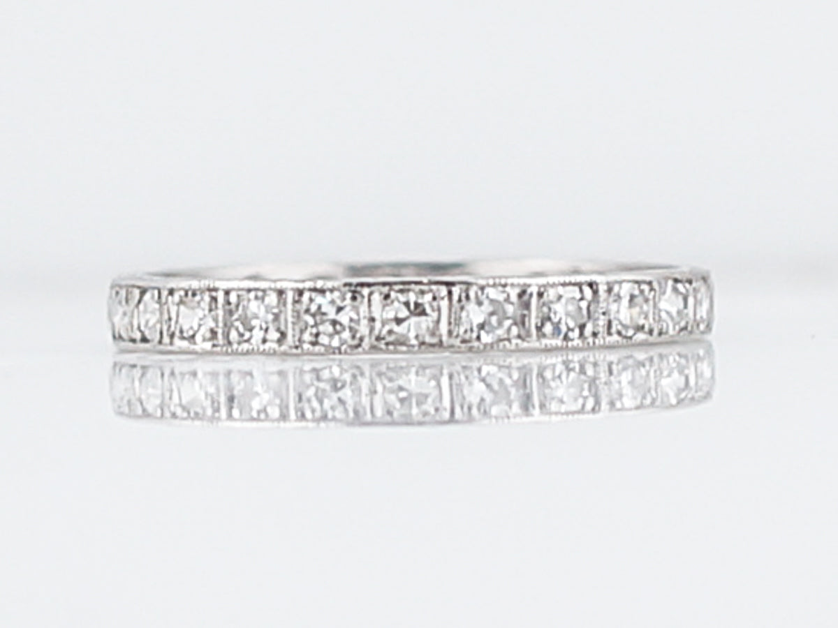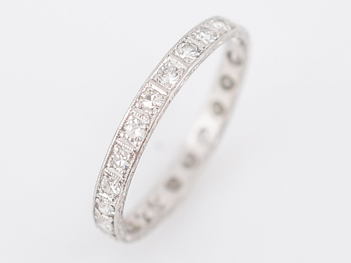 This original antique Art Deco diamond eternity wedding band is set with twenty-three (23) single cut diamonds. The diamonds are bead set in the platinum mounting and each have their own box station. The band features a light, scrolling organic design on the inside and outside edges. This beautiful band one of a kind band will pair nicely with most any engagement ring.