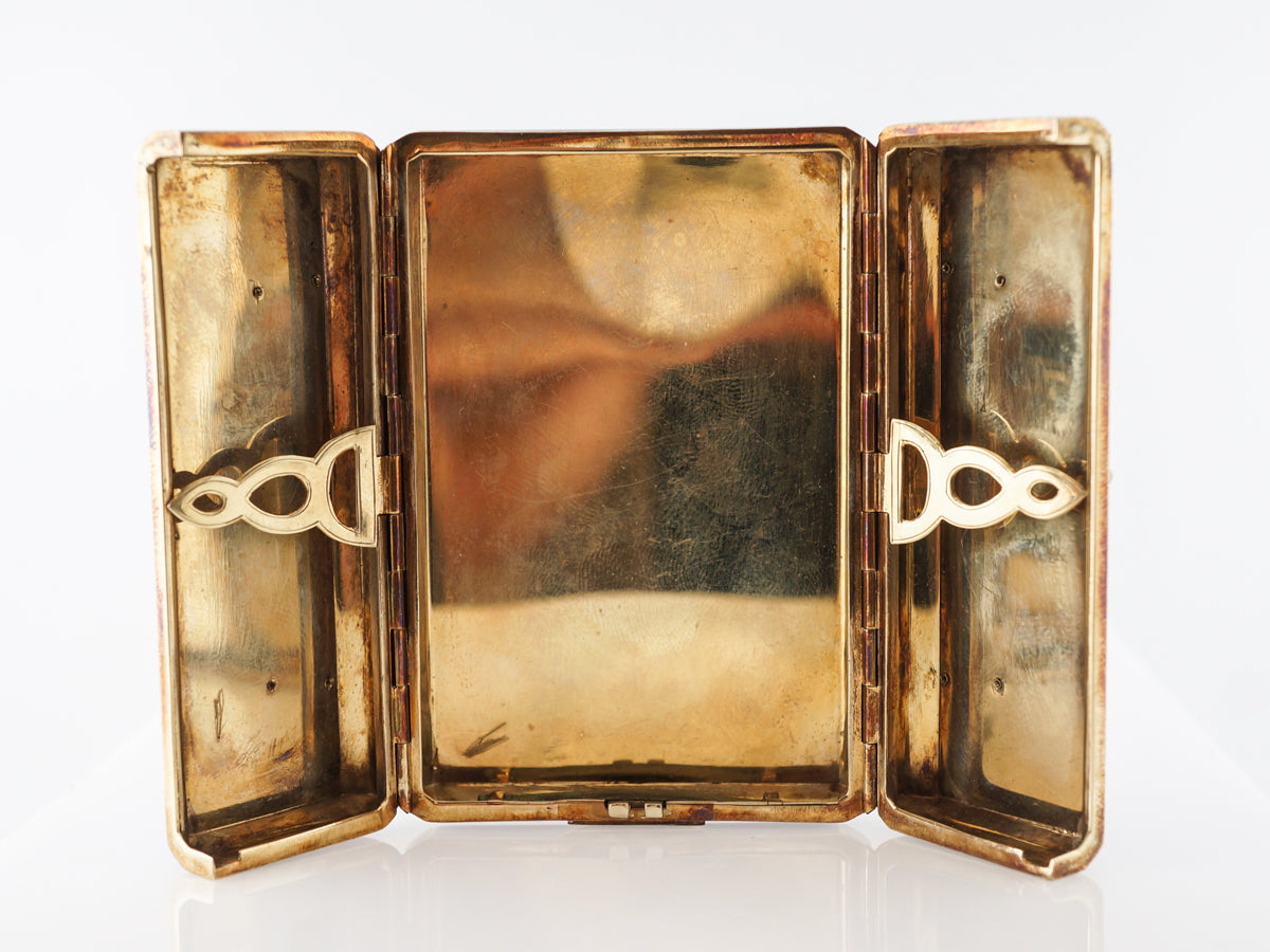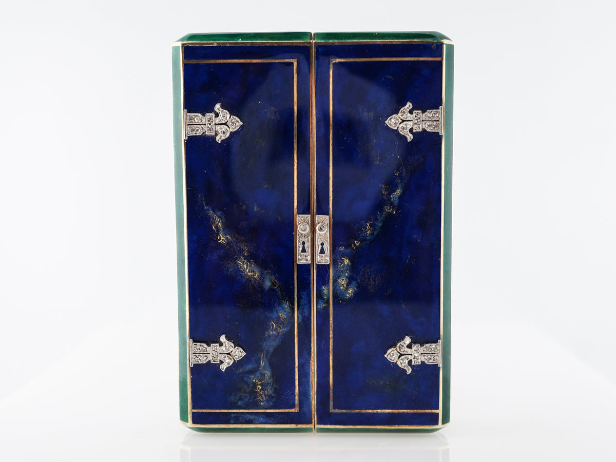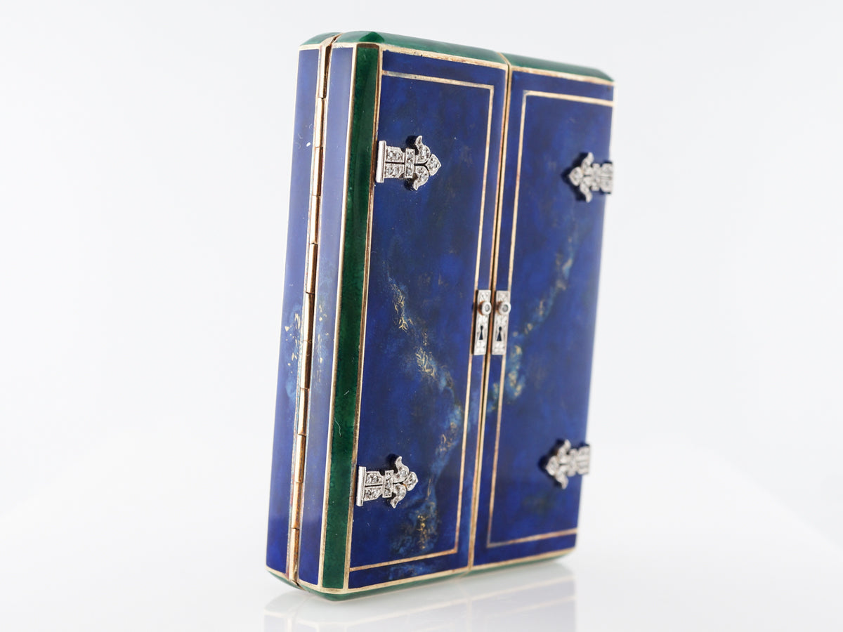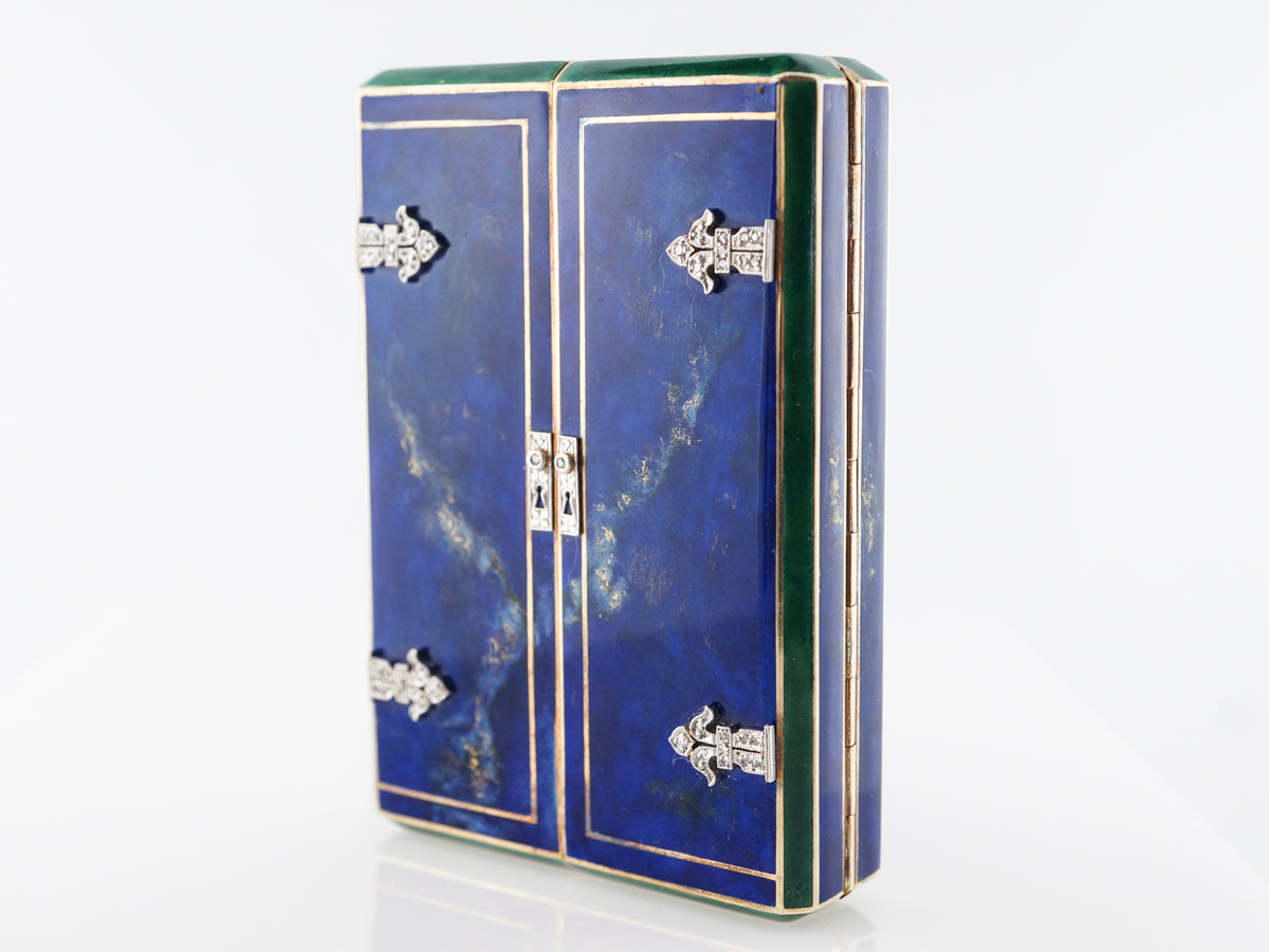 Antique French Cigarette Box w/ Diamonds, Jadeite Lapis. This fine antique cigarette case from the Art Deco period is truly a work of art. Finished in yellow gold with faces of lapis and trimmed in jadeite, the doors still spring open with ease. On the front the doors are adorned with ornamental diamond hinges and even tiny doorknobs with keyholes. This case could be used for anything and would be a fabulous gift for someone who appreciates history and very fine craftsmanship.
