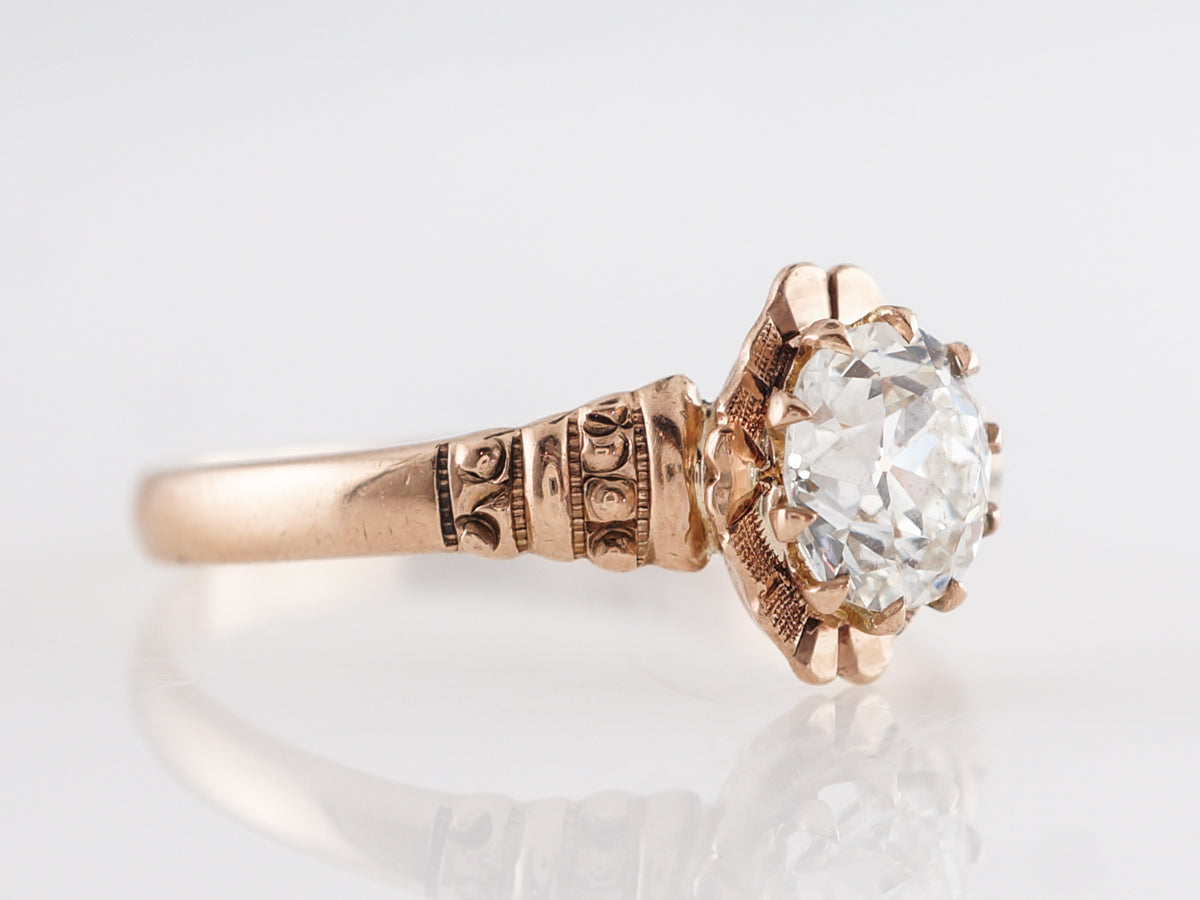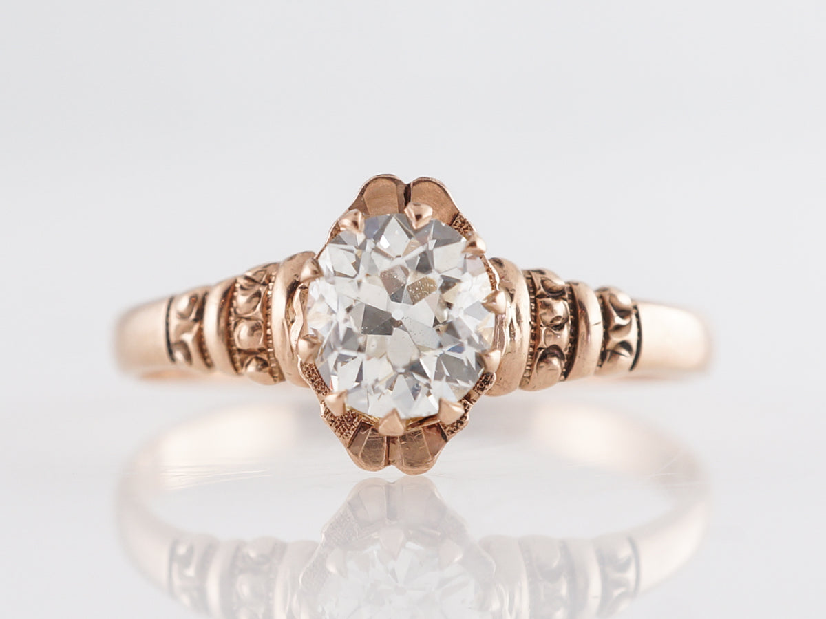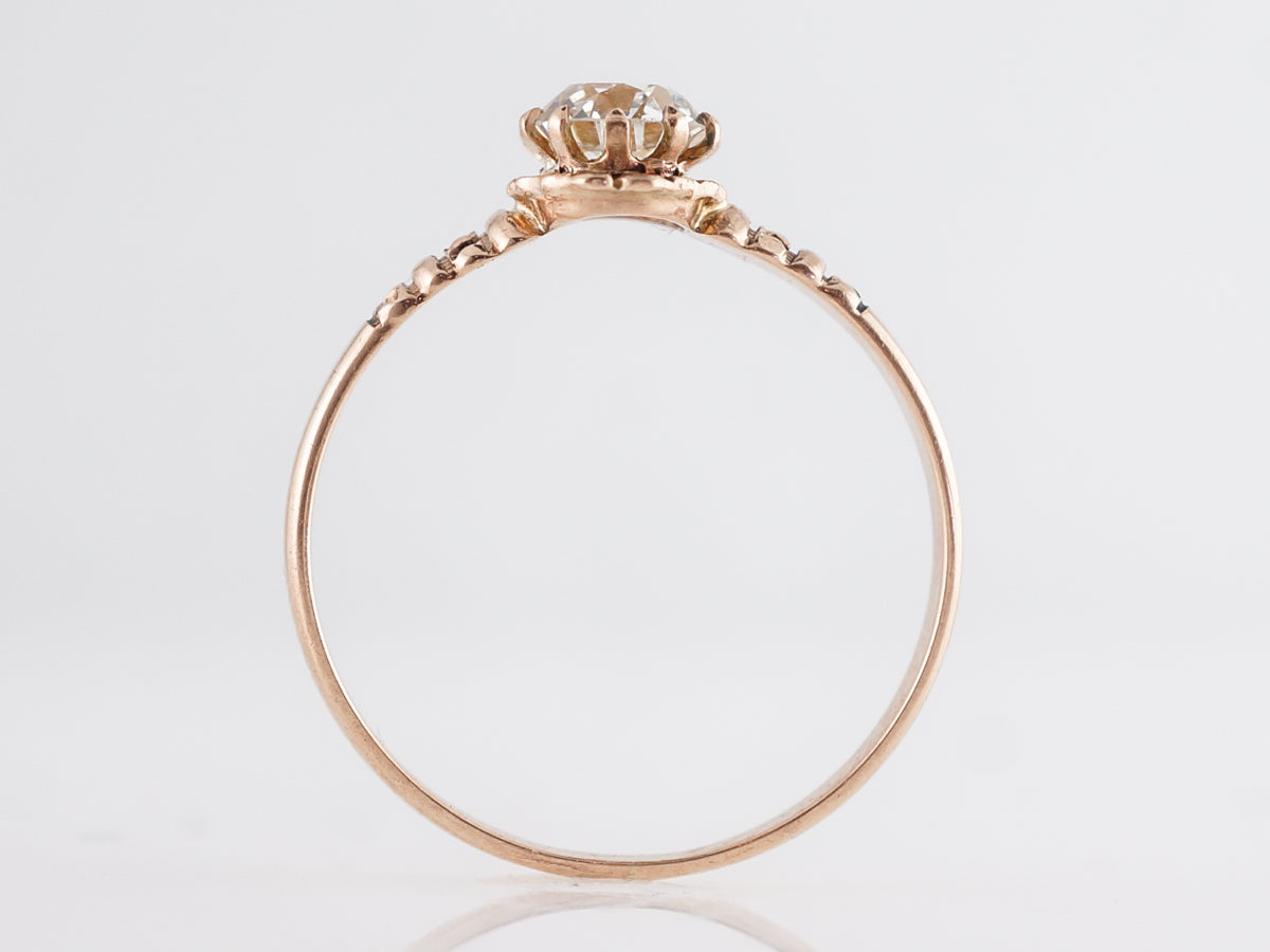 Antique GIA Diamond Engagement Ring in 14K Yellow Gold. This amazing Victorian engagement ring features a .62 carat Old European cut diamond set in 14 karat yellow gold. The center stone is held by ten (10) prongs and has a tall disc of engraved gold underneath, which gives the ring a bit of a north-south appearance. Below the center stone the shoulders are enhanced with carved parallel lines that hold beads of yellow gold. This vintage ring is a fine example of Victorian craftsmanship and holds a high quality GIA certified diamond.