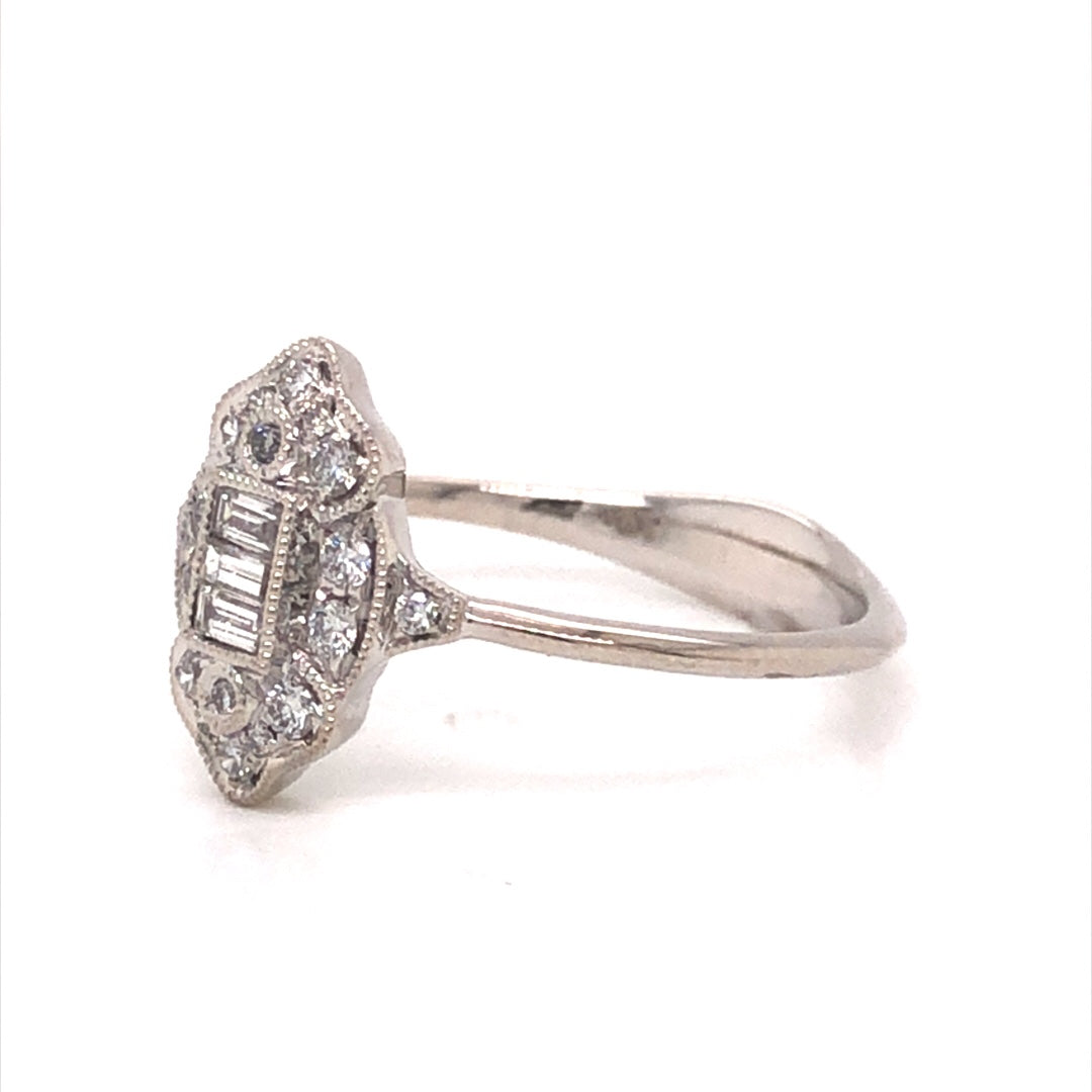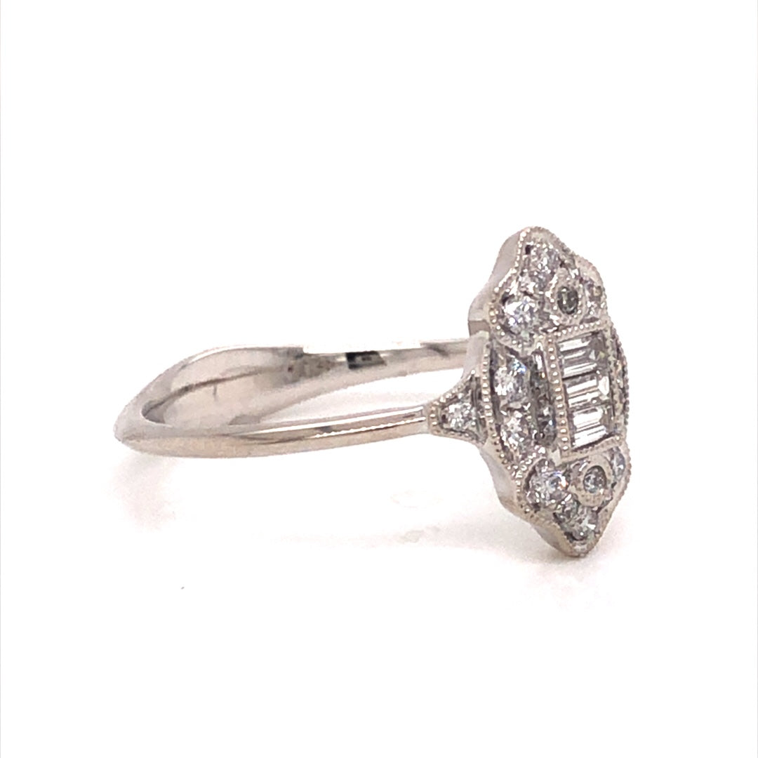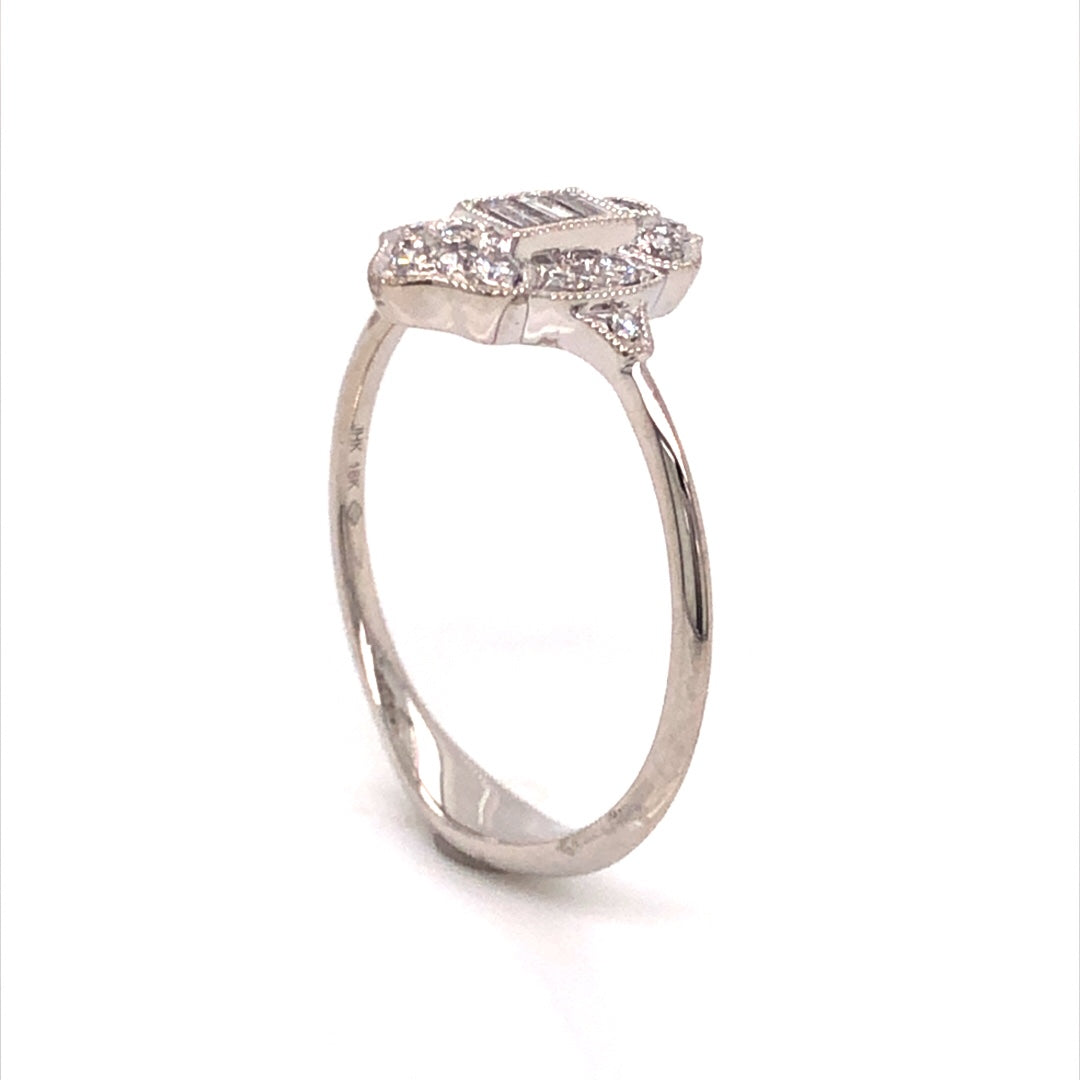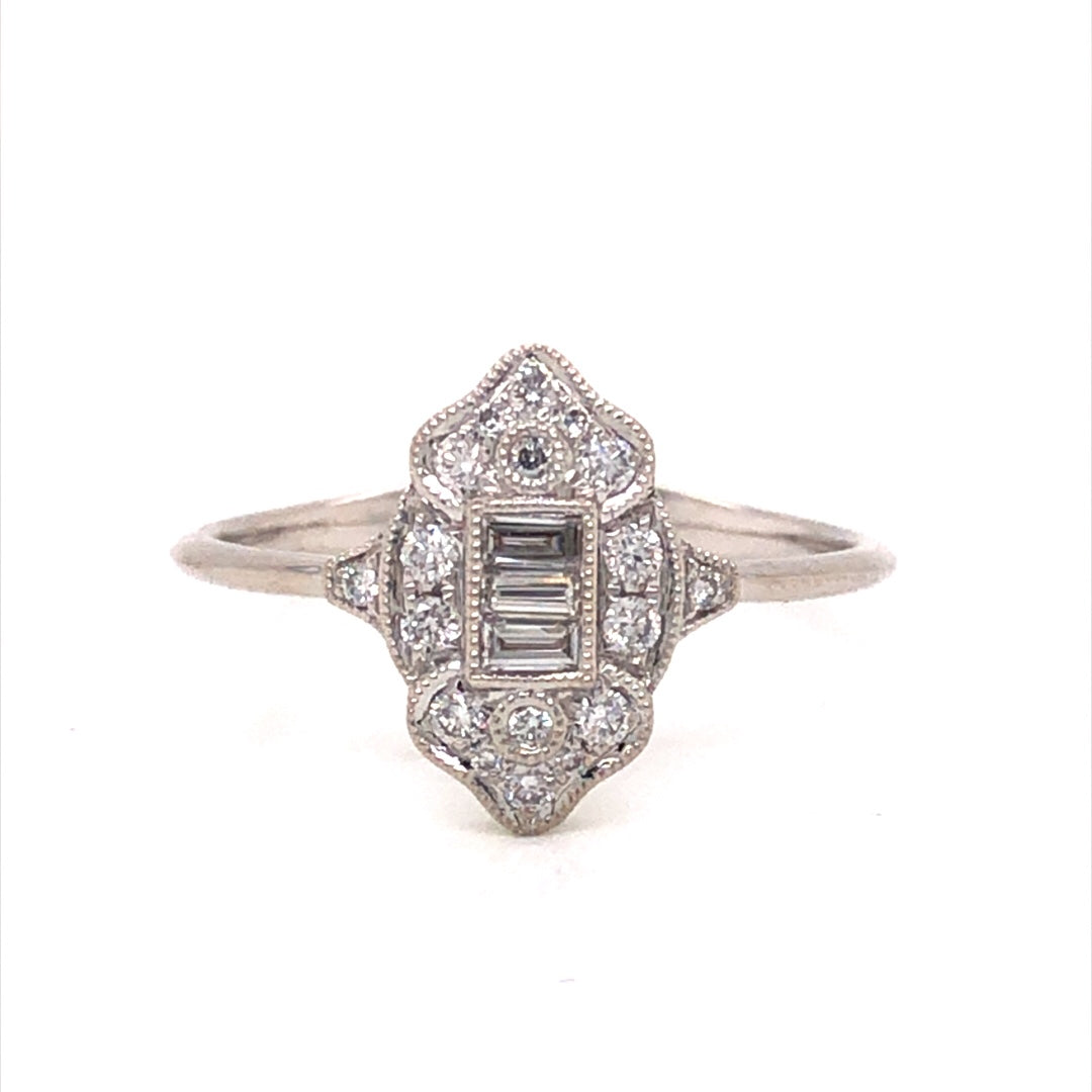 This dazzling diamond cluster ring features .26 total carats of diamonds in 18 karat white gold. Set on an antique-inspired setting, a collection of baguette and round cut diamonds form a beautiful and romantic shape. The white diamonds are accented by fine milgrain engravings that decorate the unique setting. Set on a high polish 18 karat white gold band, this modern right hand ring shows that diamond cocktail rings will never go out of style!