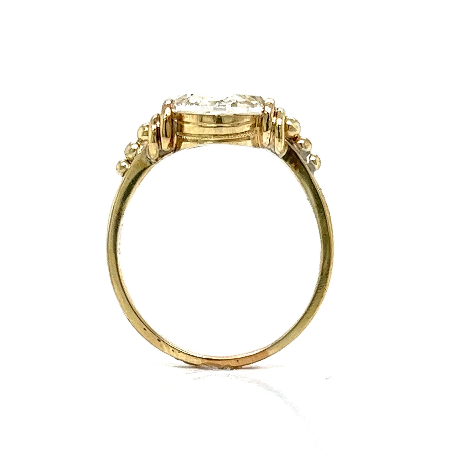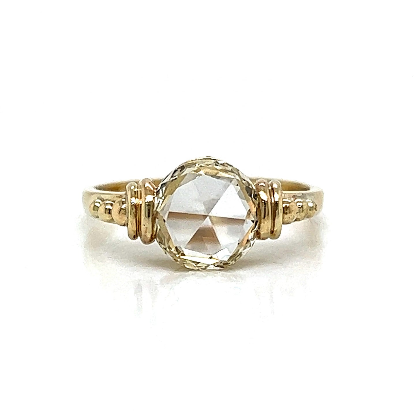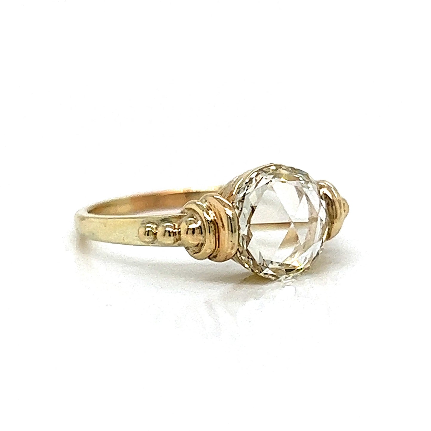 This GIA certified diamond engagement ring has a one of a kind, antique-inspired design. At the center, a 1.40 carat rose cut diamond is set in a stylish basket. The solitaire diamond has an eye catching clarity and soft champagne hue. A modern design with vintage inspiration. The ring is finished in polished 14 karat yellow gold and has geometric adornment on the shoulders, reminiscent of the Mid-Century era. A popular yellow gold engagement ring with a one of a kind style!