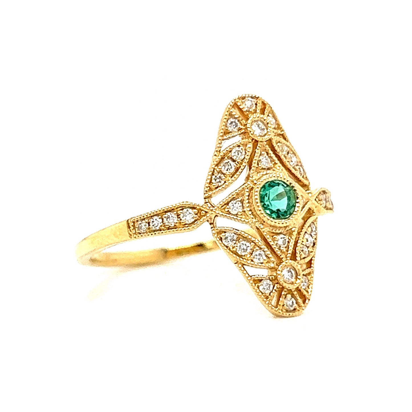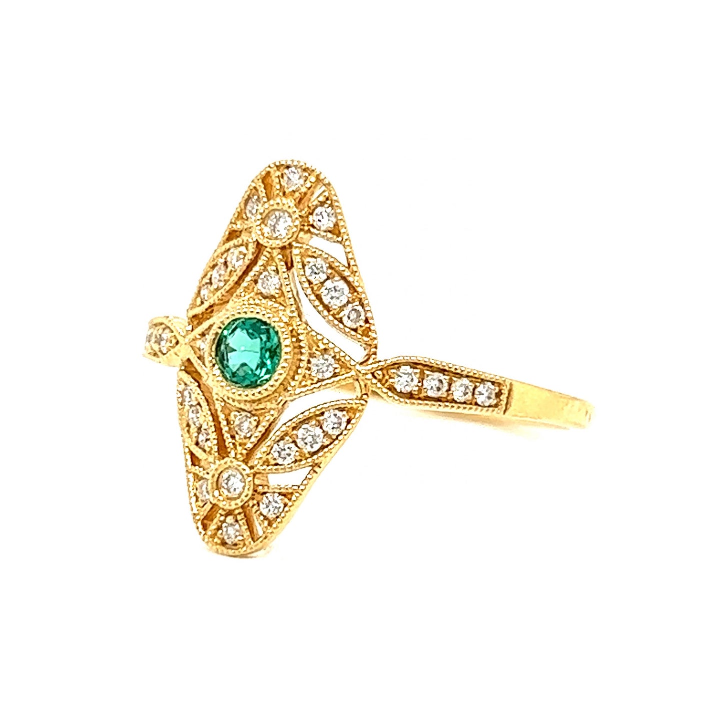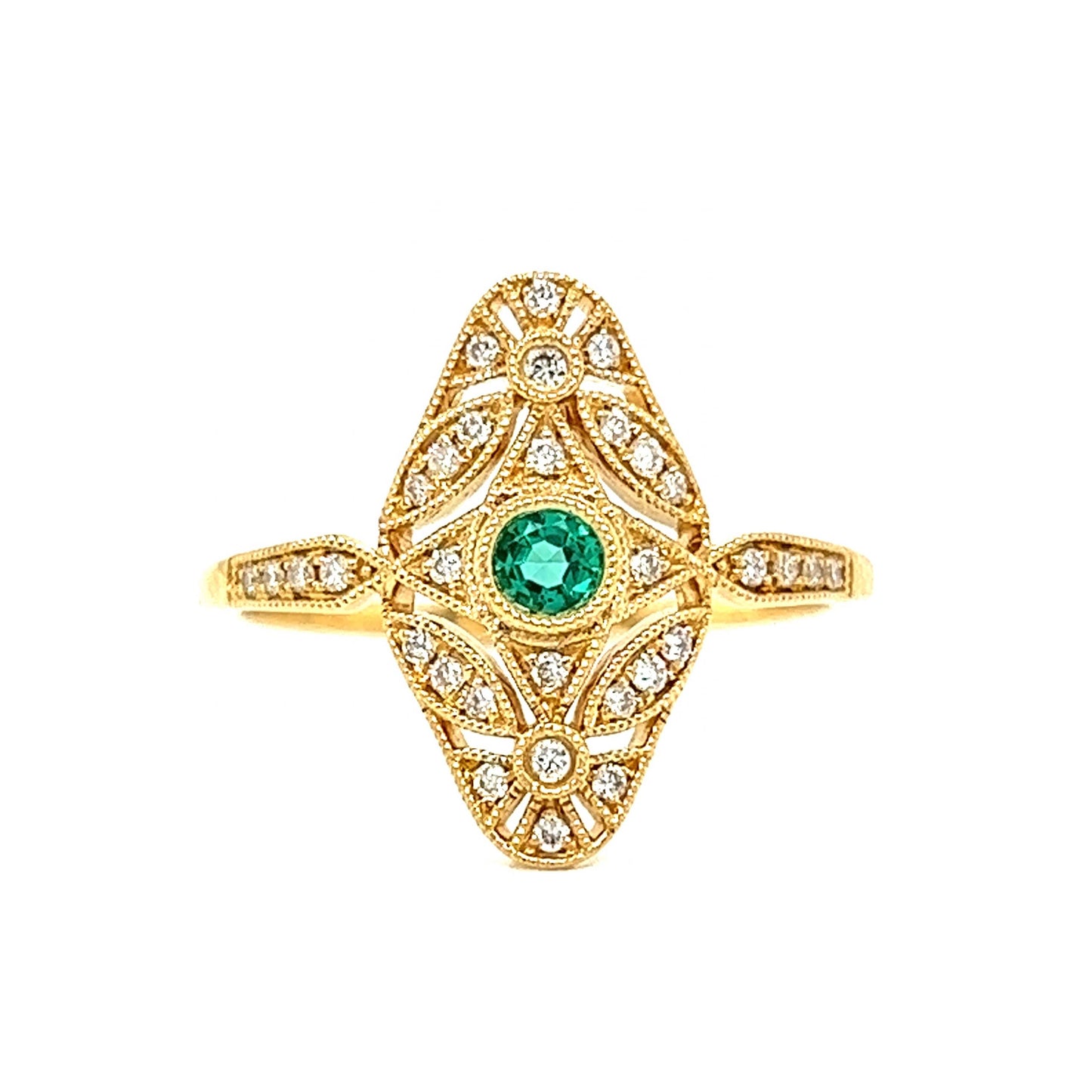 Antique Inspired Round Emerald & Diamond Ring in 18k Gold