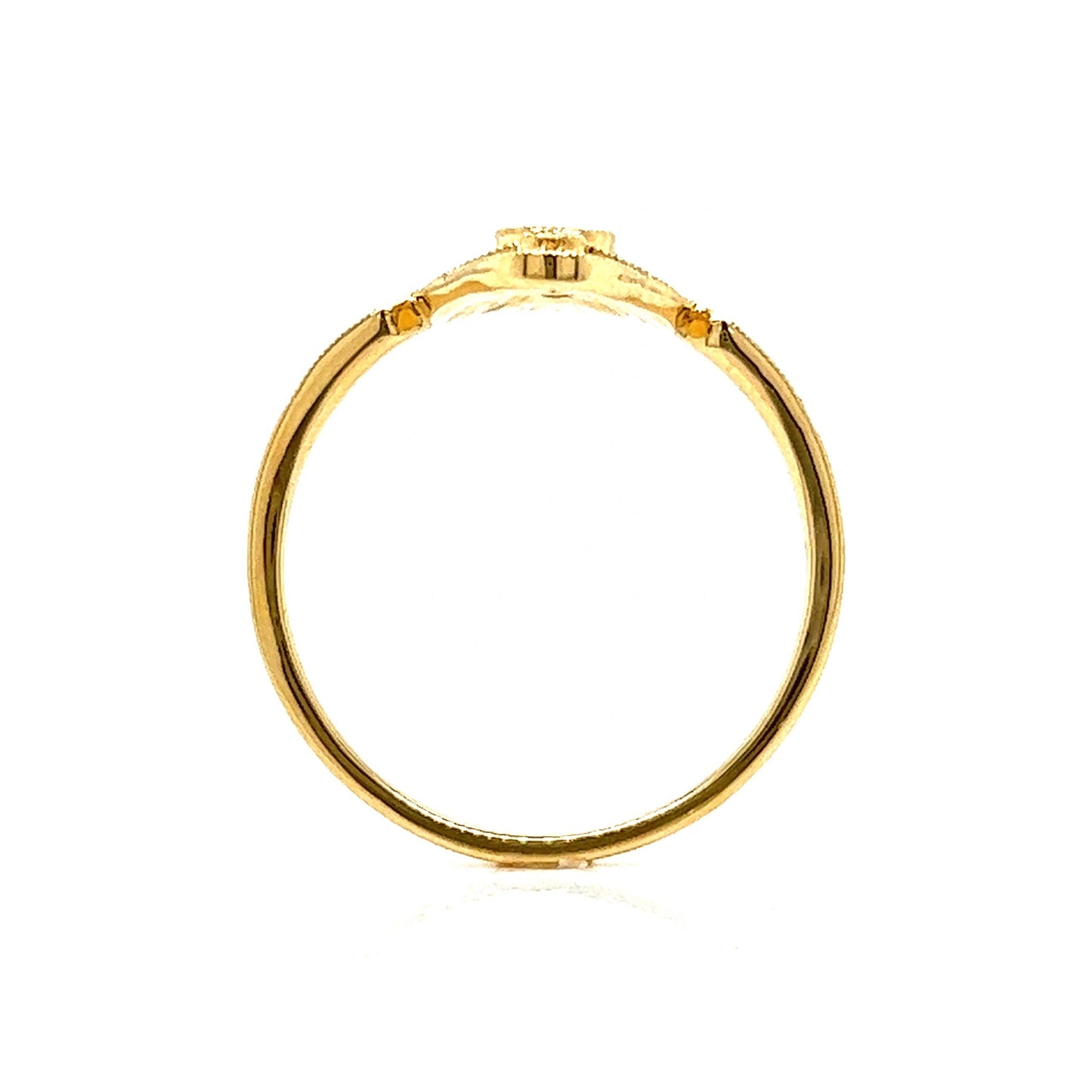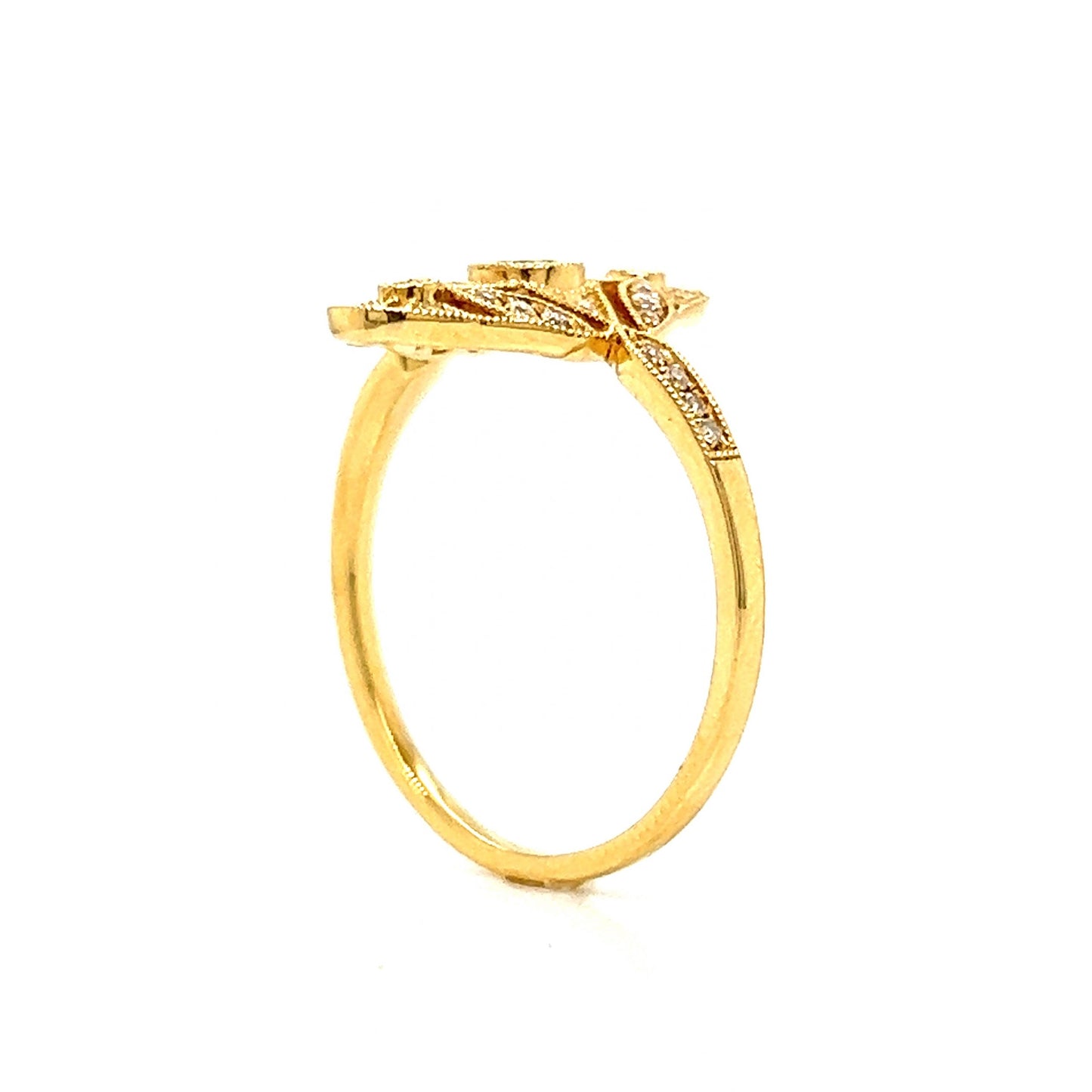 This antique-inspired emerald and diamond statement ring is a modern marvel! At the center, one .11 carat round cut green emerald is set in a secure bezel. Fine milgrain engravings create a cosmic filigree design in 18 karat yellow gold. A pave of thirty-two (32) accent diamonds dance around the ornate face and shoulders of the band. Finished in polished 18K yellow gold, this modern cocktail ring is dazzling. A great gift idea and future family heirloom.