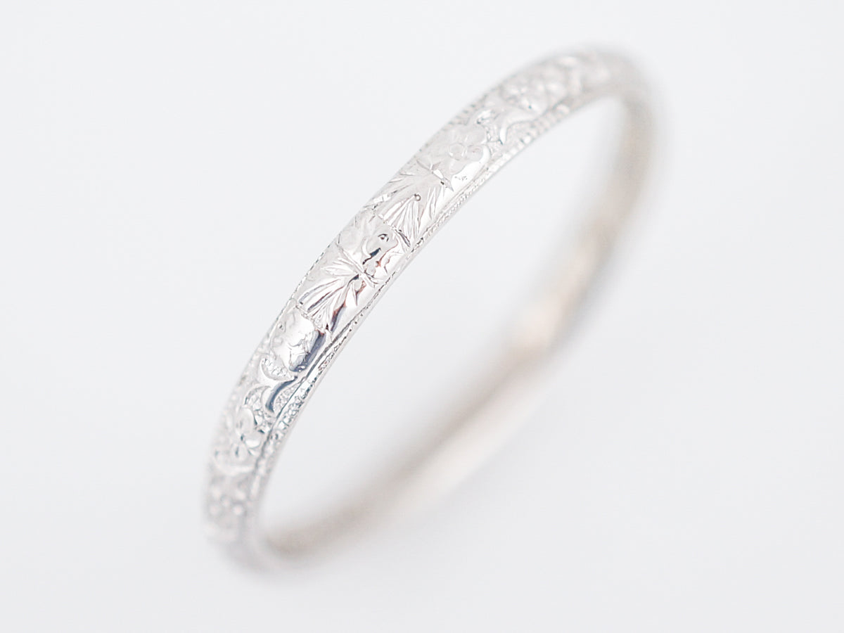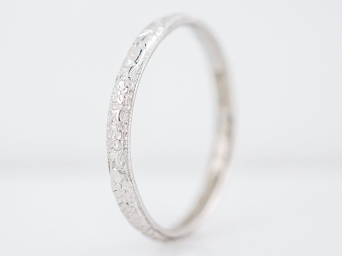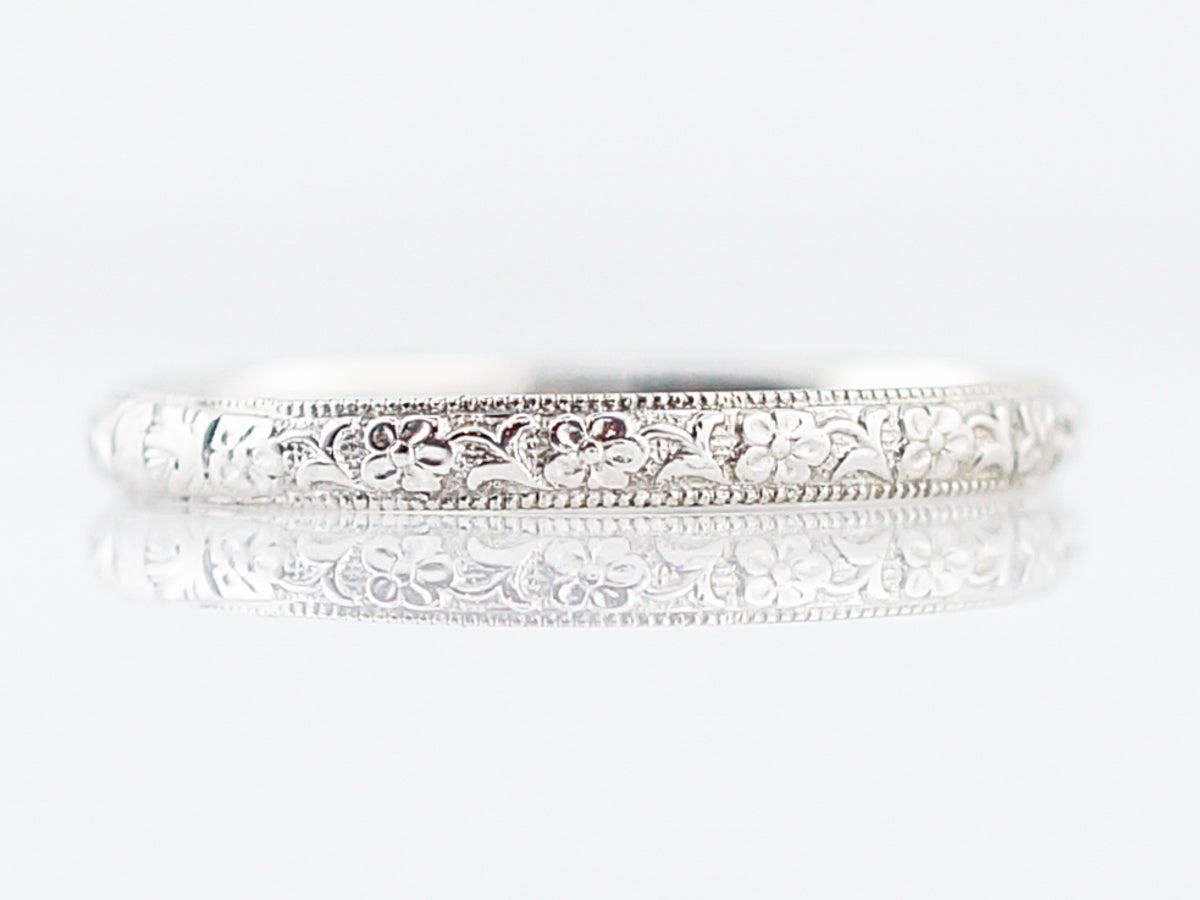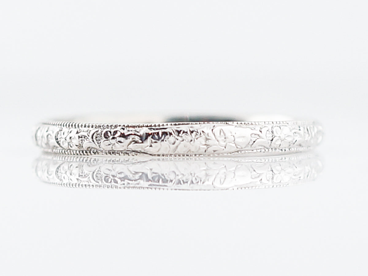 A crisp floral pattern adorns this 18 karat white gold mens art deco wedding band. During this time period, men often wore bands that were much thinner than what you see today and this band is just over 2mm wide. Who says stacking is only for the ladies? We think this piece would look very cool paired with a wider, white gold band.