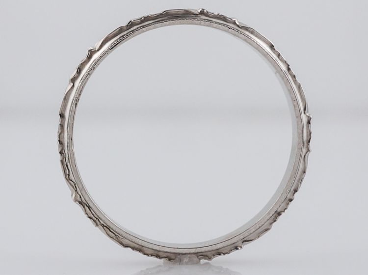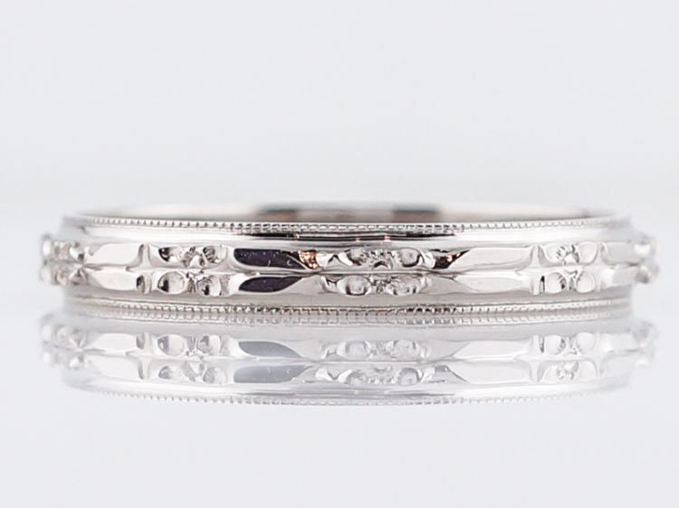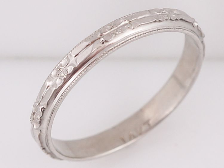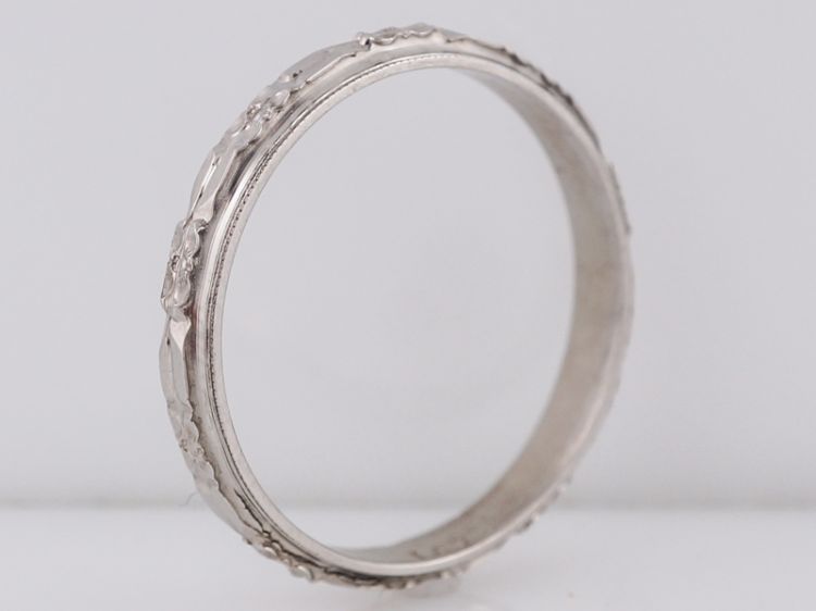 This ring is rare and terrific find! This original Mens Art Deco wedding band is crafted in brightly polished 14k white gold. It features a crisp orange blossom pattern, which runs the entire circumference of the band. To each side, a row of crisp milgrain accents the orange blossom pattern. This ring would make a wonderful paring to your wifes Art Deco engagement ring and shows your appreciation for the Art Deco style.
