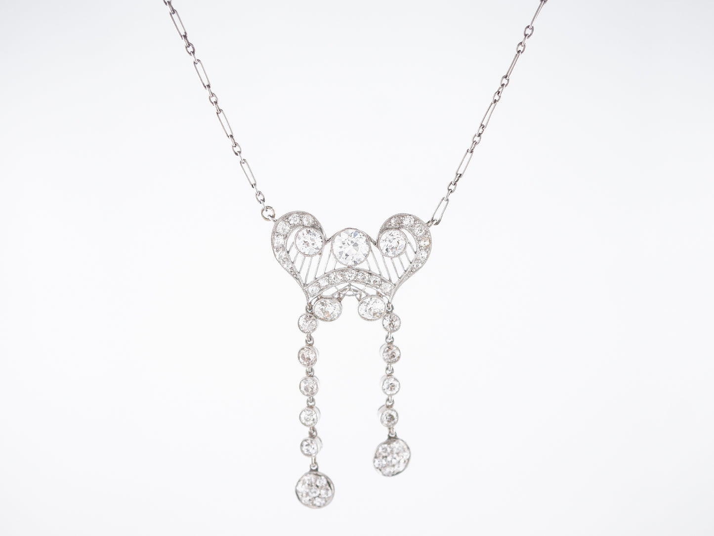 This Antique, Art Deco Era necklace is simply divine! Set with 3.37 carats total weight of old European cut diamonds and made in Platinum, this pendant is fixed into a delicate and equally detailed 16 inch chain. This might just be the piece to turn into your signature look.