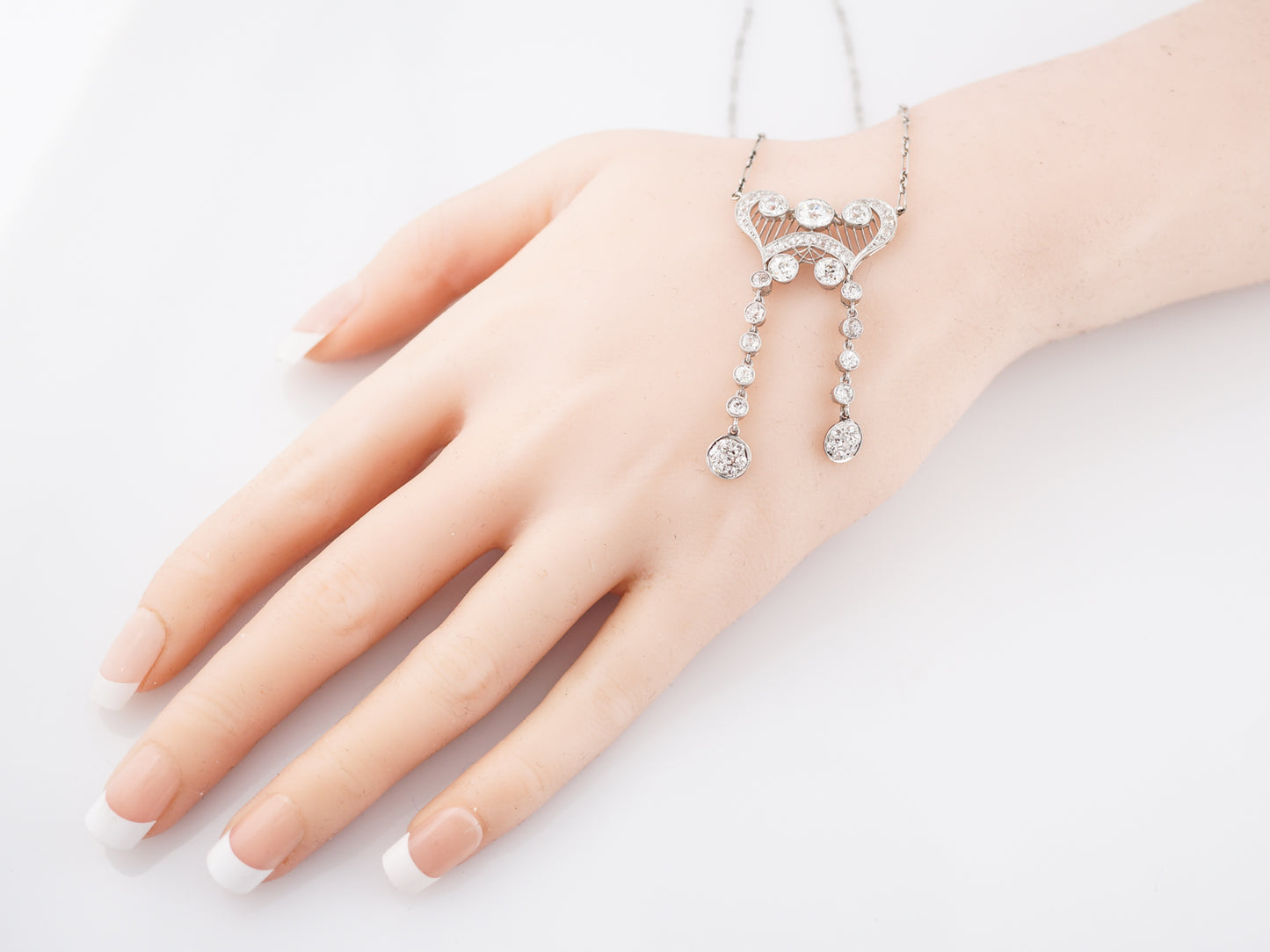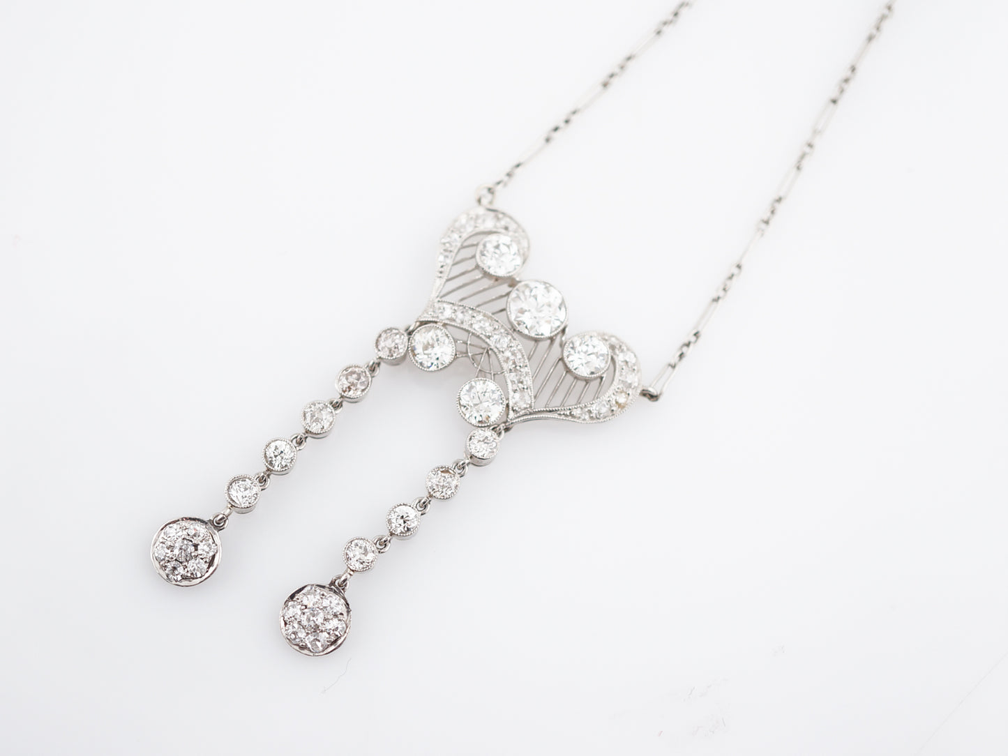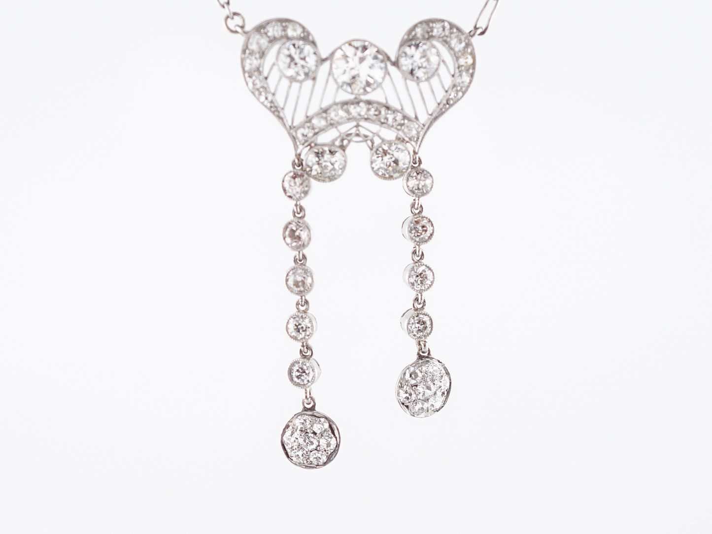 This Antique, Art Deco Era necklace is simply divine! Set with 3.37 carats total weight of old European cut diamonds and made in Platinum, this pendant is fixed into a delicate and equally detailed 16 inch chain. This might just be the piece to turn into your signature look.
