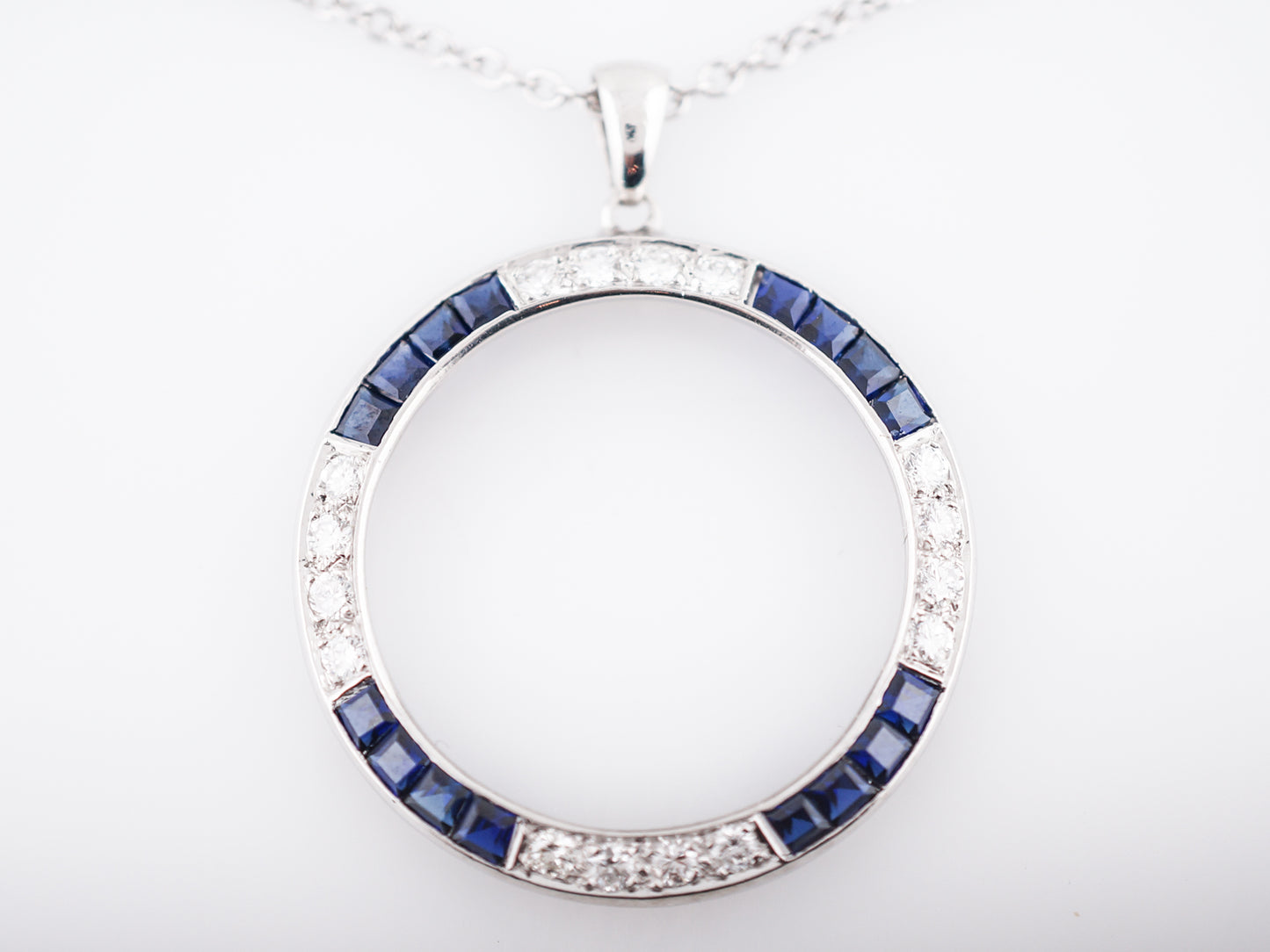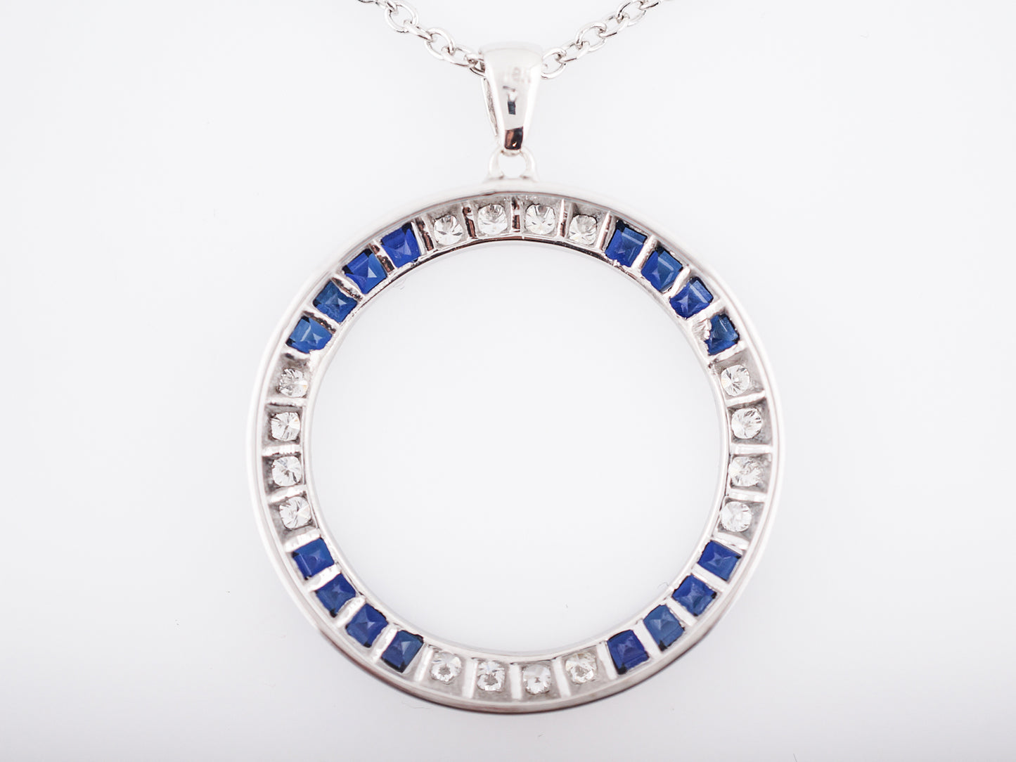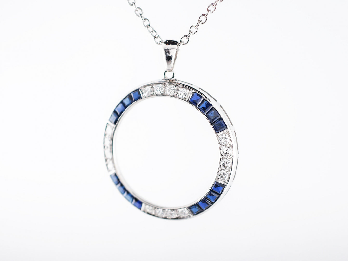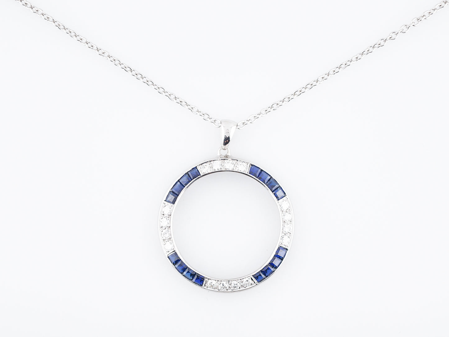 A repeating pattern of four (4) step cut sapphires and four (4) round full cut diamonds, set in a thin channel style bezel make up this circular antique Art Deco Era pendant. Made in 18 karat white gold, the pendant hangs from a classic 18 inch cable chain. The perfect pendant for every day wear, the pop of blue from the sapphires give this eternity circle a unique look.