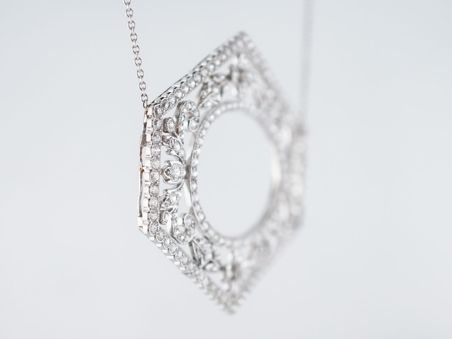 This is a necklace that truly pairs the interesting geometric shapes of the period with the fineness of the filigree work being produced at that time. Set with only old European cut diamonds, this delicate platinum diamond necklace truly glitters from any angle. For the lover of refined and timeless Art Deco jewelry, this has it all.
