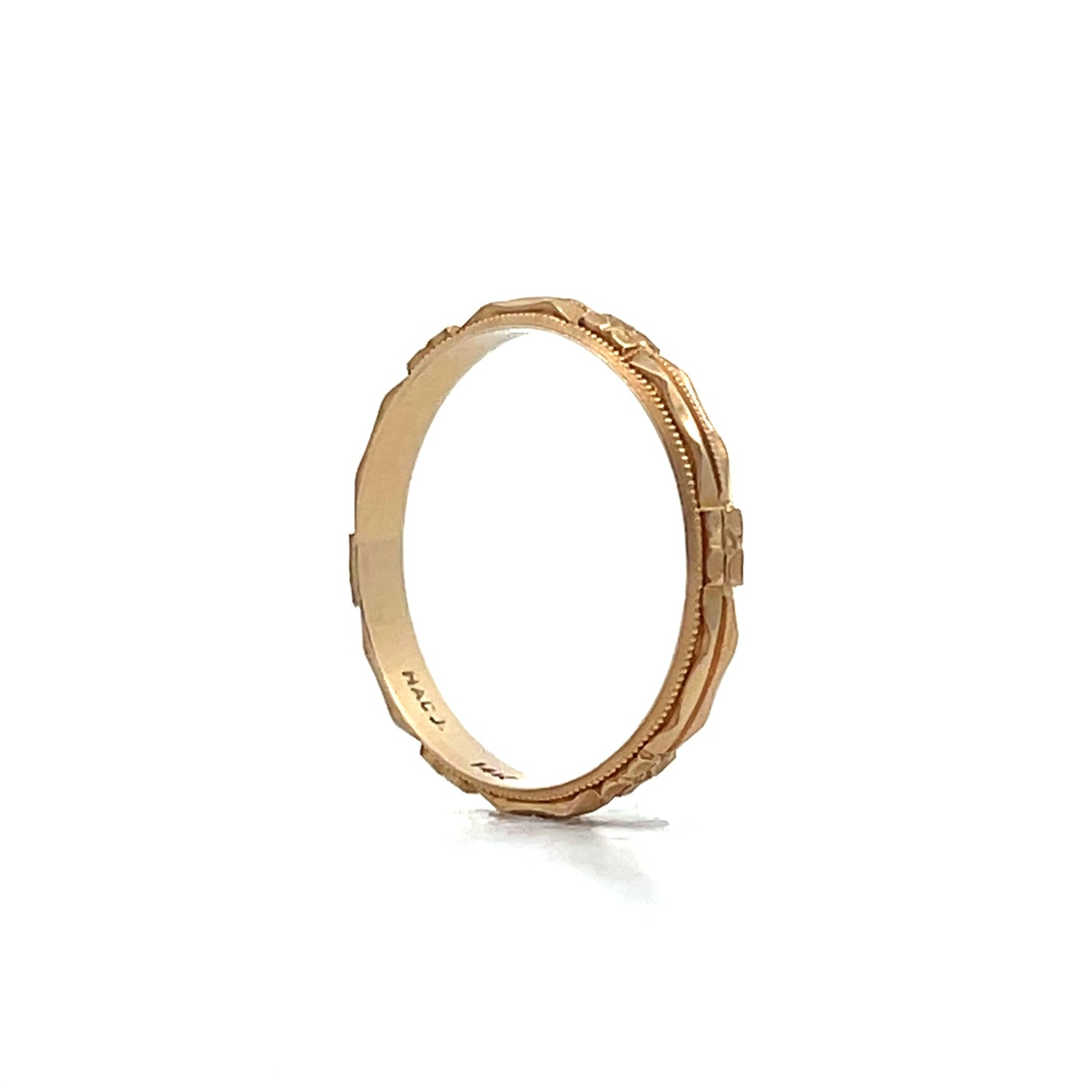 This Art Deco wedding band, crafted in 14 karat yellow gold, features intricate orange blossom engravings and milgrain detailing along the edges, giving the piece texture and depth. The design reflects the bold, artistic style of the Art Deco era. The warm glow of the yellow gold adds to the vintage craftsmanship, making it a unique choice for those who appreciate detailed artistry.