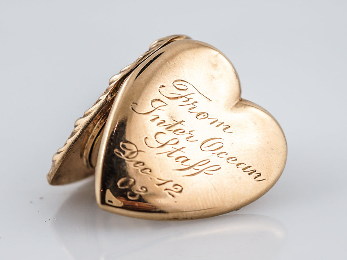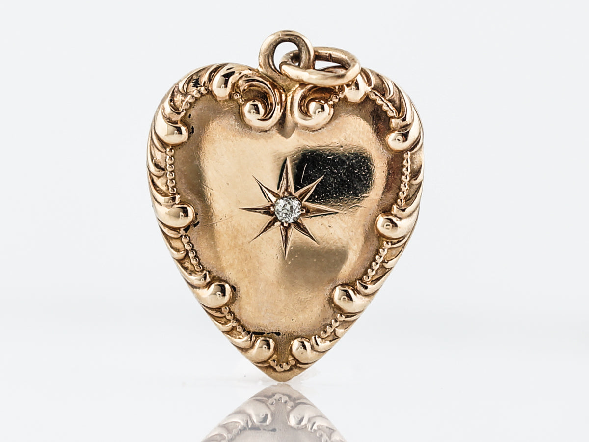 This pendant charm comes to us from the Edwardian era and is truly a unique and special piece. Decorated with engraving, flowing lines and a star in the center of the heart, this locket is ready and waiting to hold a small memento. Made of 14k yellow gold this charm is embellished with a .03 carat old mine cut diamond at the center of the star.