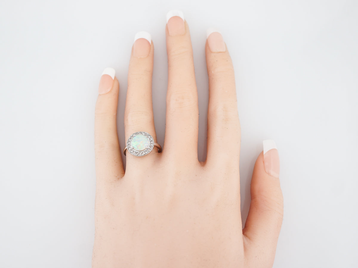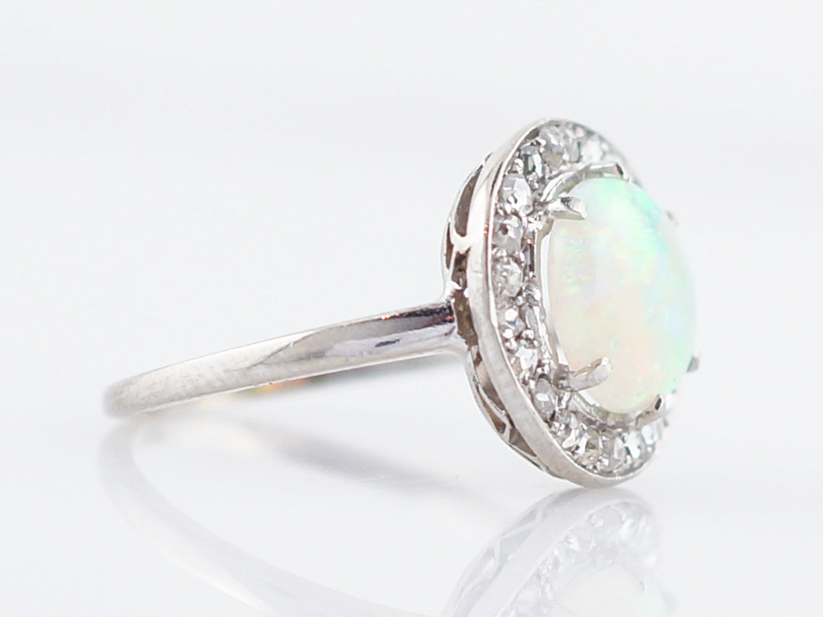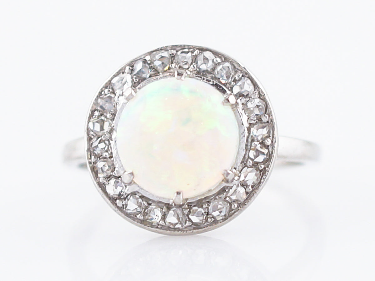 Antique Right Hand Ring Art Deco 1.00 Cabochon Cut Opal & .23 Rose Cut Diamonds in Platinum