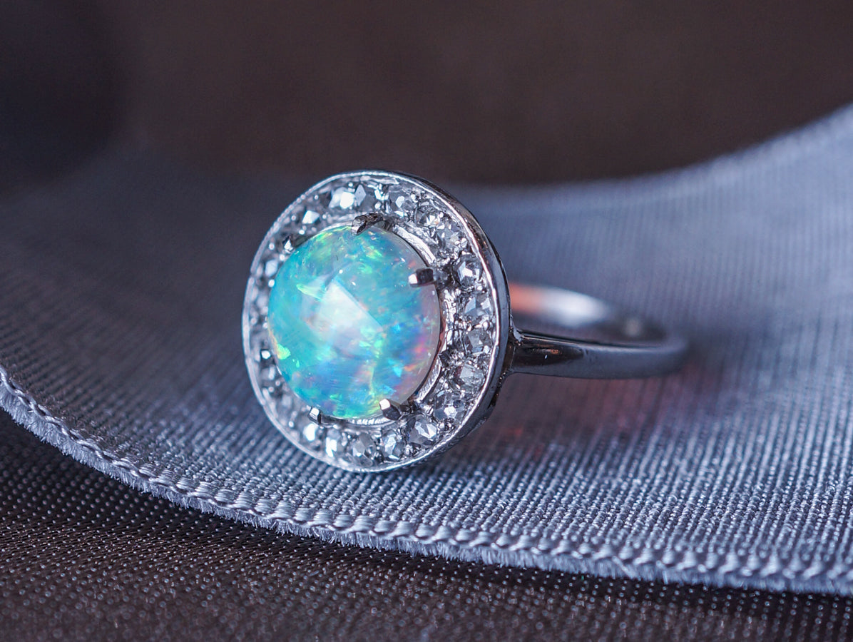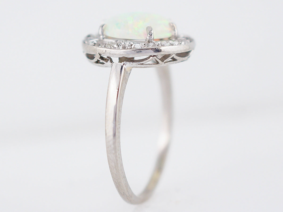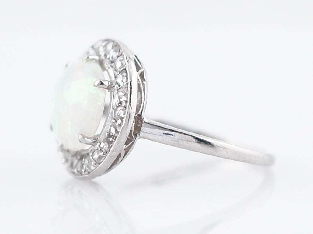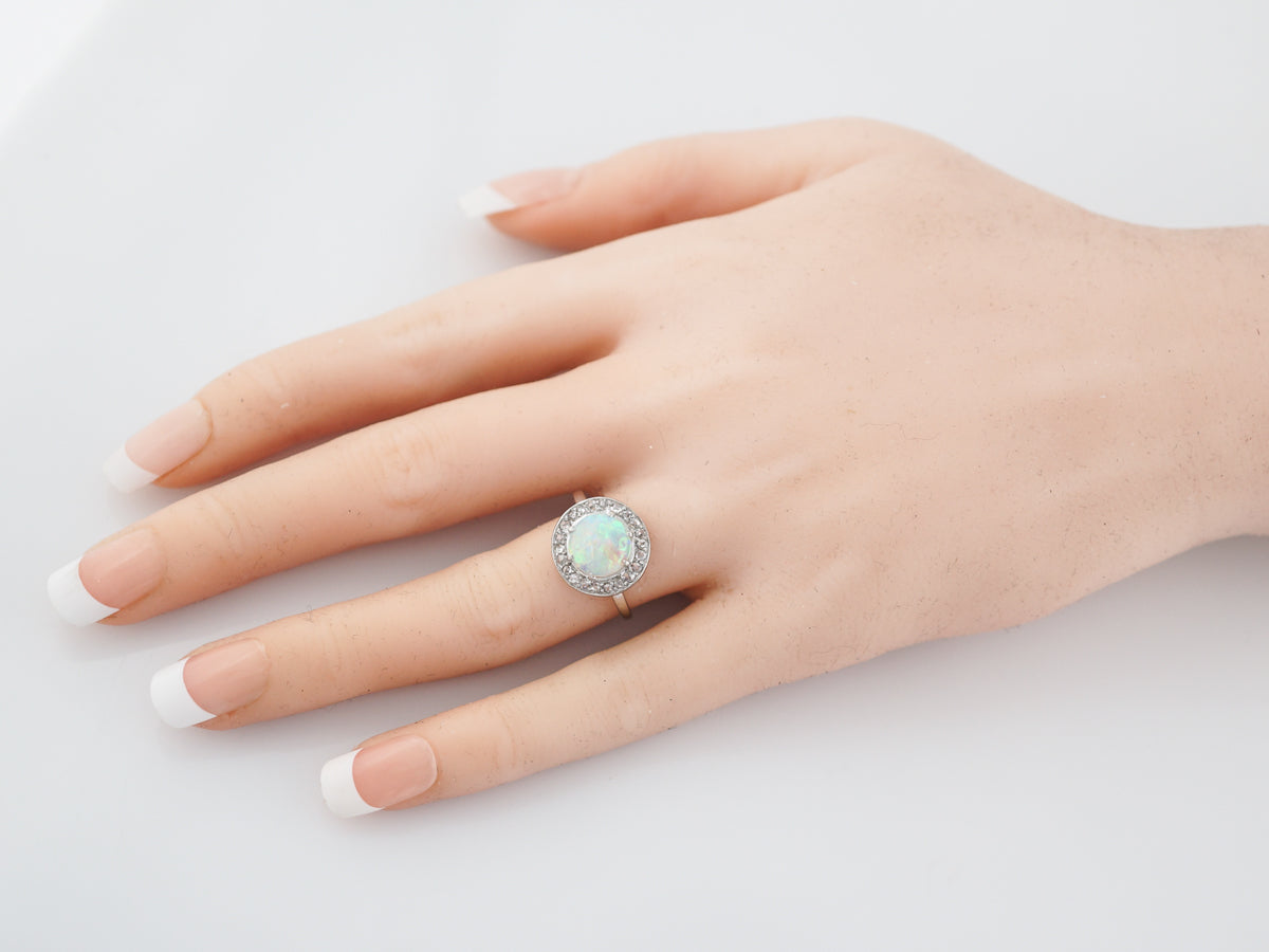 Antique Right Hand Ring Art Deco 1.00 Cabochon Cut Opal & .23 Rose Cut Diamonds in Platinum