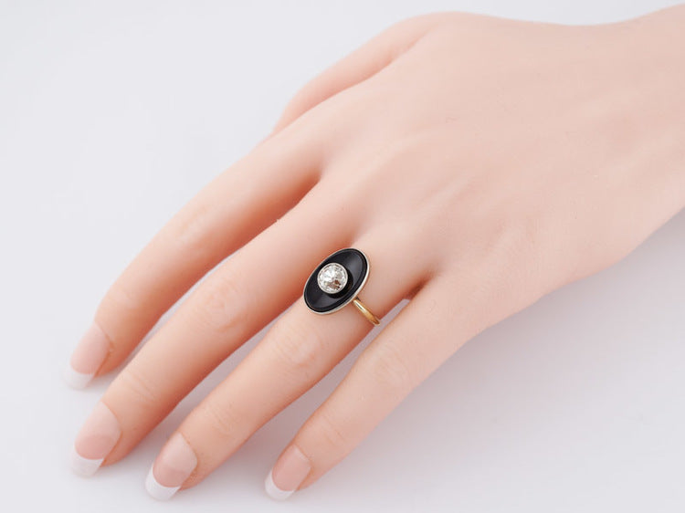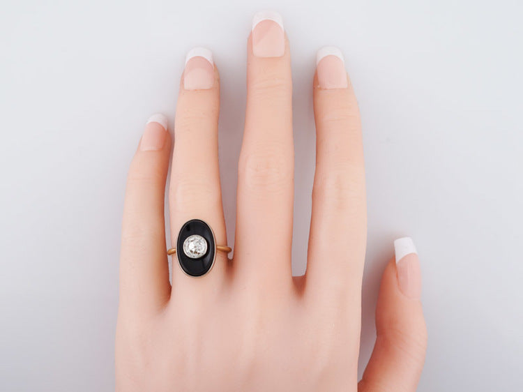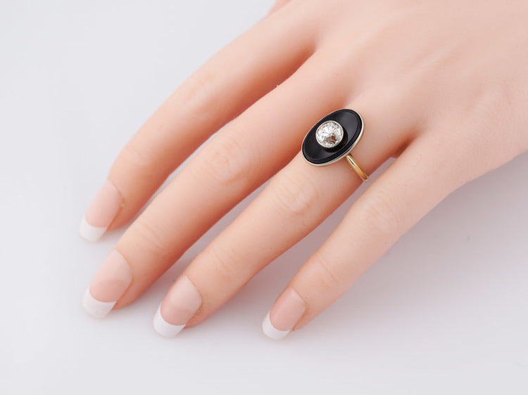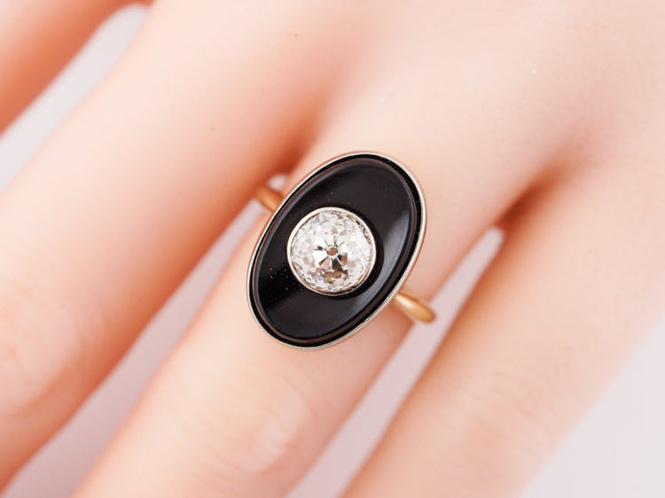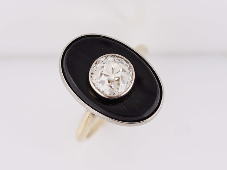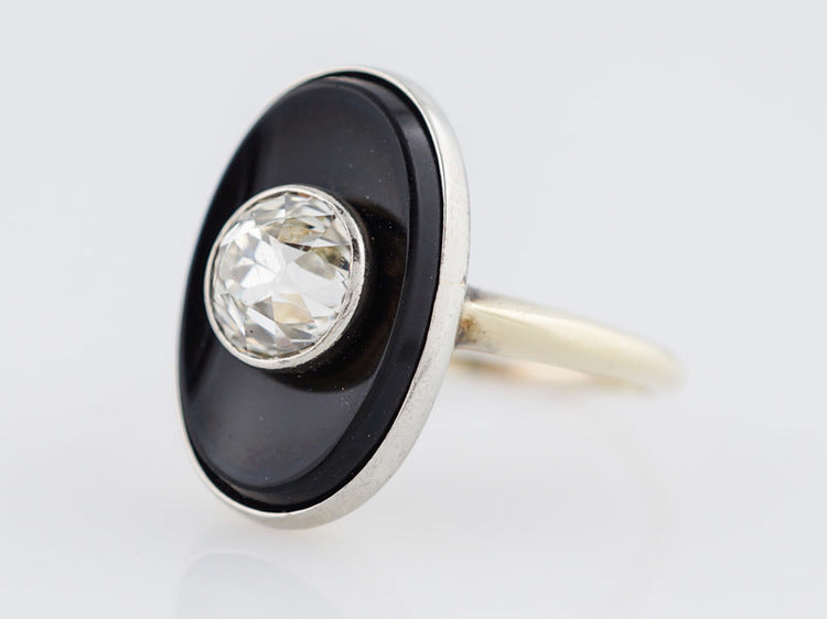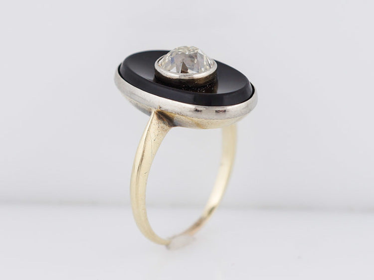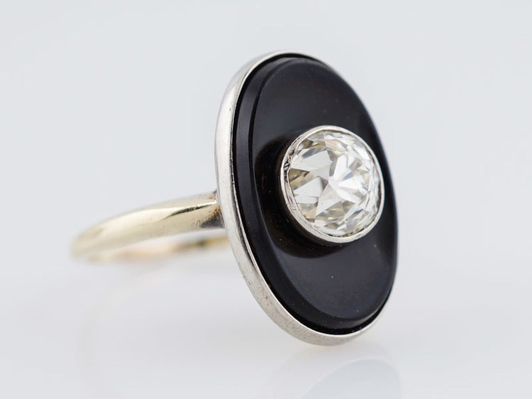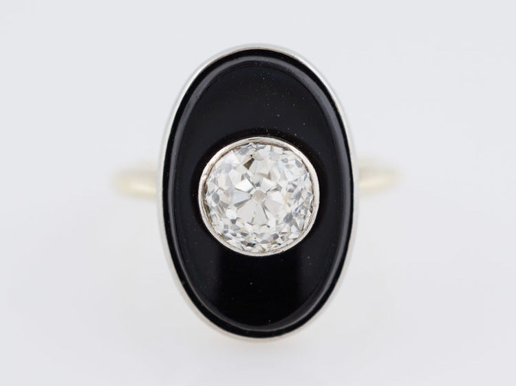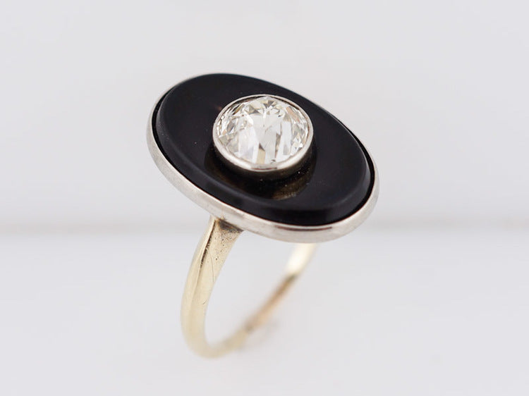 This is a beautiful Art Deco diamond and onyx ring. The center 1.10ct. Old European Cut Diamond is delicately bezeled in white gold, which is surrounded by an oval concavely carved piece of onyx. Further bezeled, the rings simple shank is done in a rich yellow gold. The original milgrain is retained softly around the top of each bezel. It would make a stunning period engagement ring as much as it would a beautiful right-hand ring.