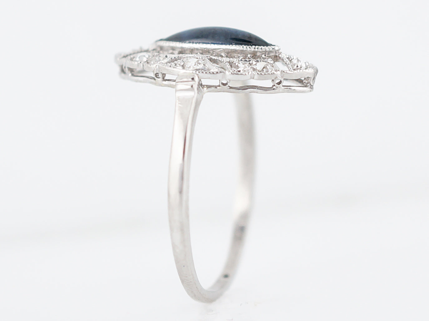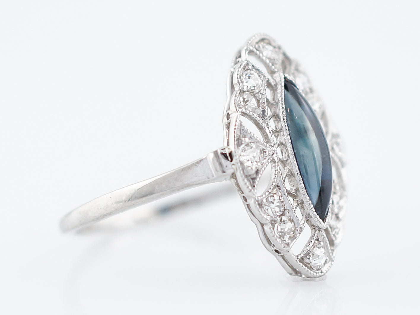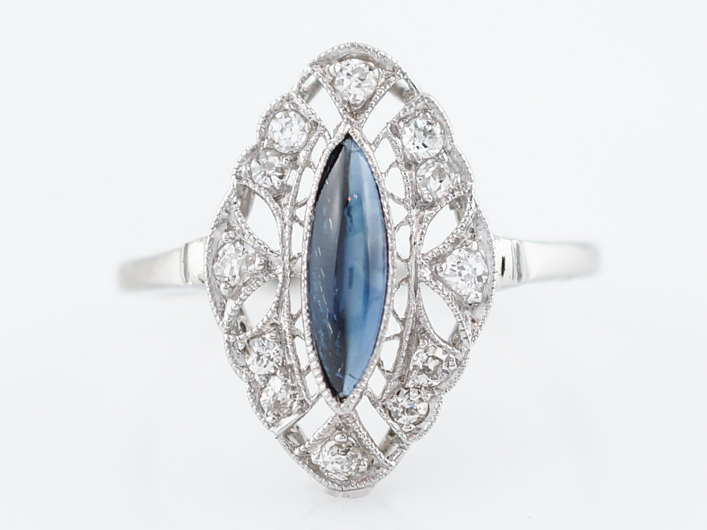 This Antique, Art Deco Era ring has a lovely 1.11 carat cabochon Marquise cut sapphire which is surrounded by a halo beautiful, swirling filigree and negative space. Inside the Platinum work and open space are bead set diamonds for a total weight of .36 carats. The ornate detailing of this piece is complimented by a simple polished shank.