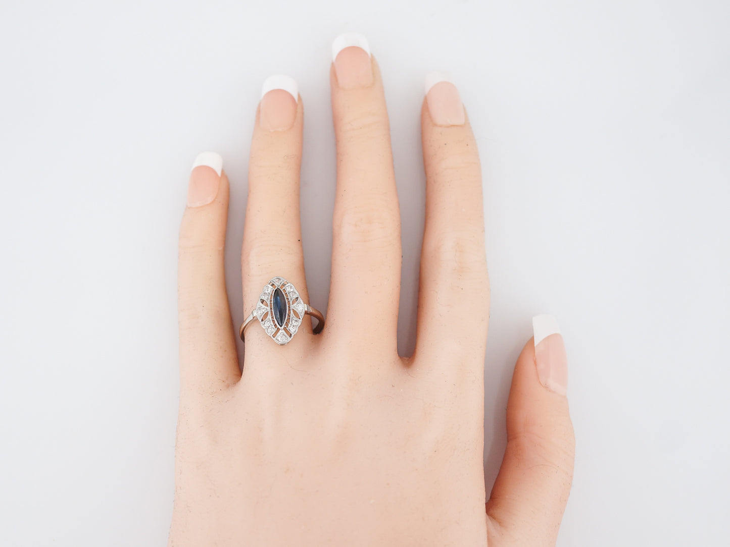 Antique Right Hand Ring Art Deco 1.11 Cabochon Marquise Cut Sapphire in Platinum