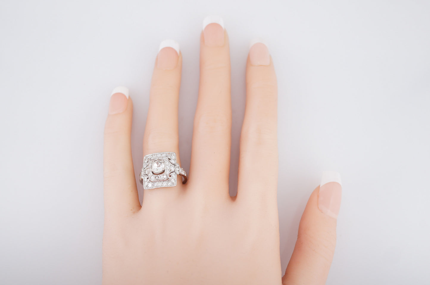A double halo of single cut diamonds surround a charming .56ct Old Mine Cushion Cut, with more diamonds set down the shank. Made during the Art Deco era, this ring was cast in platinum allowing the flowing lines and intricate detailing to really give this ring character. Made with a fairly low profile, this ring sits low to the finger and is very comfortable.