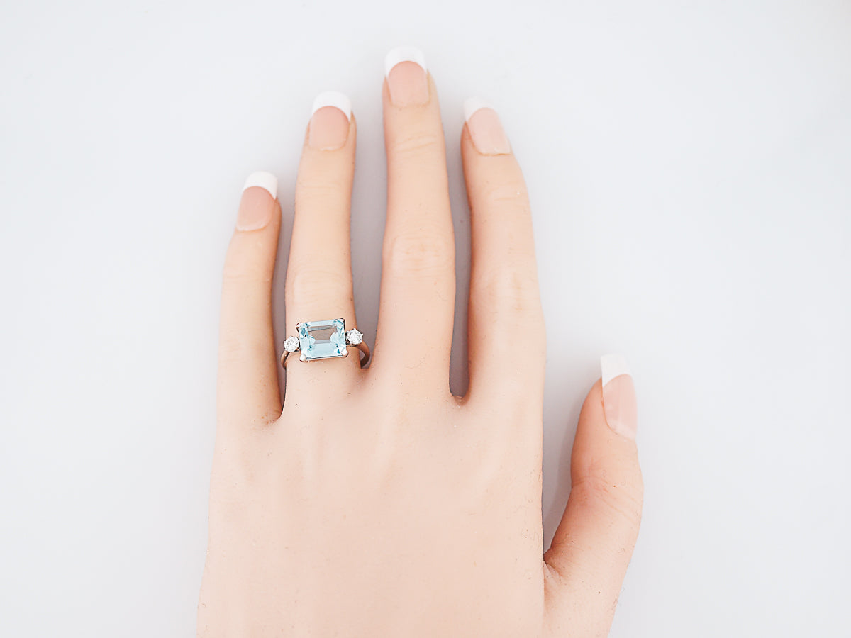 This Antique, Art Deco Era Aquamarine and Diamond ring is perfectly on trend with modern designs. Set east-west, the 2.71 carat emerald cut Aquamarine has a lovely blue color and is flanked on each side by a diamond, for a total diamond weight of .28 carats. Cast in platinum, which really enhances the blue color of Aqua, this ring is would be a wonderful right hand piece or a striking alternative for an engagement ring.