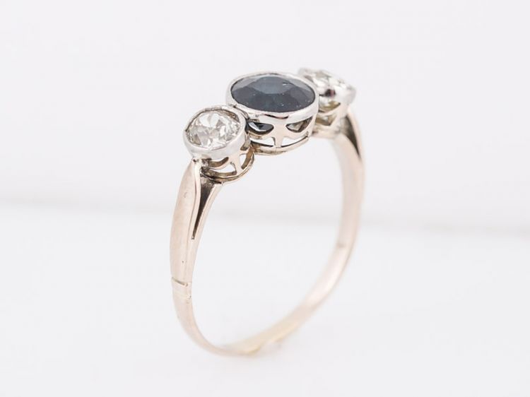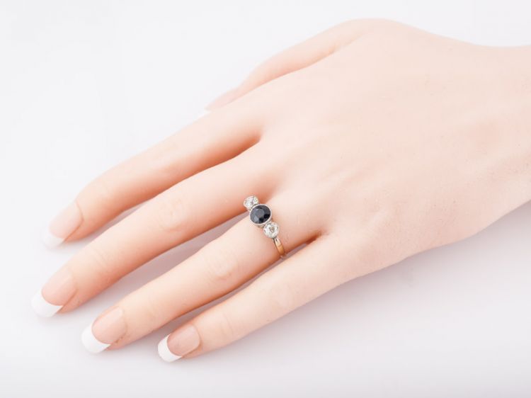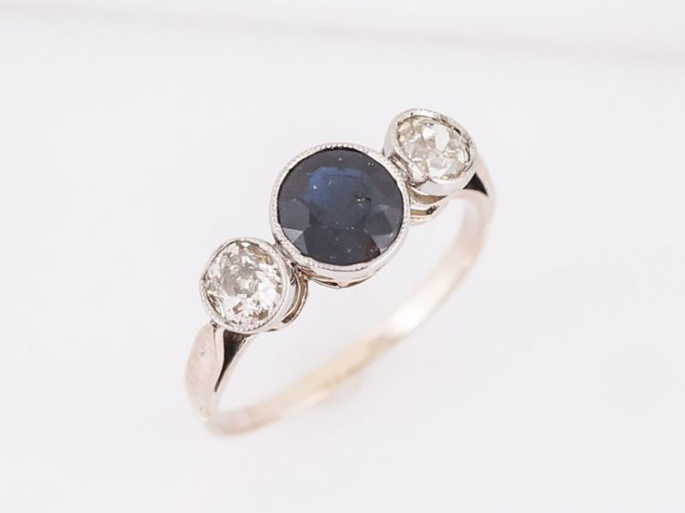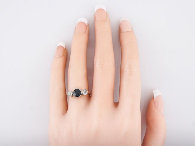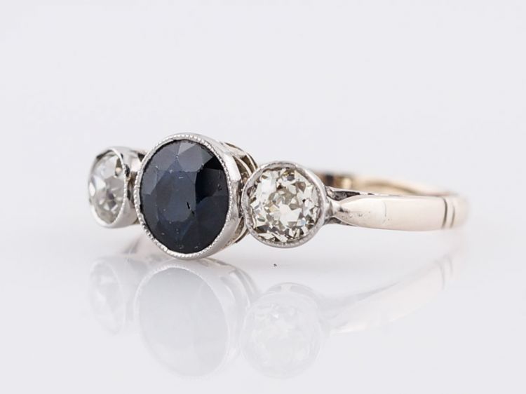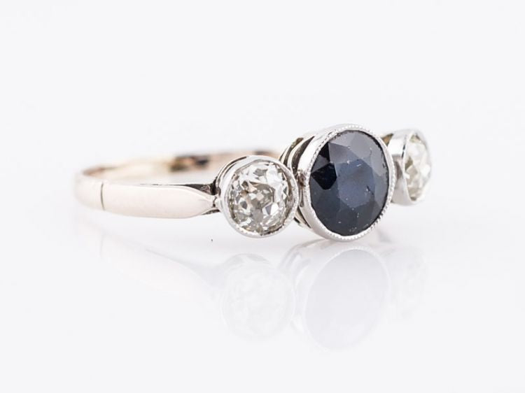 This lovely Art Deco ring has a .92 carat round sapphire for its center stone. The dark blue sapphire is flanked by two Old Mine cut diamonds totaling .21 carat. All three gemstones are bezel set which makes for a very durable setting. The bezels have milgrain detailing that help to frame the sparkling stones. This classic ring is made with 14k white gold. It makes a perfect commitment ring because sapphires are historically associated with love, loyalty and friendship.