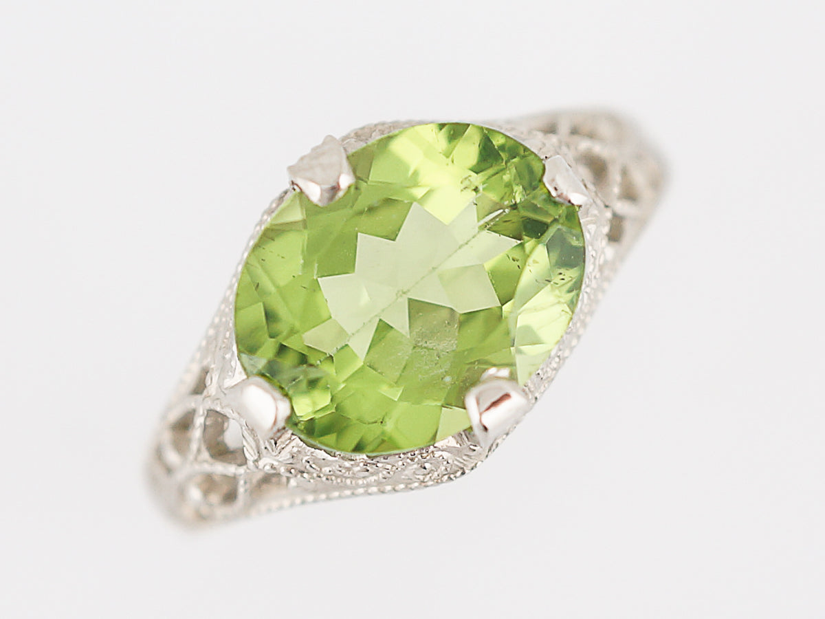 The Edwardian Era was a short period following the Victorian Era, and jewelry of this time is marked by light filigree detailing and negative space which were made possible by advances in jewelry technology. This vintage peridot ring is a wonderful example of those Edwardian techniques with beautiful open work design and engraving in 14 karat white gold and set with a 2.20 carat oval shaped peridot. A fabulous choice to celebrate August birthday.