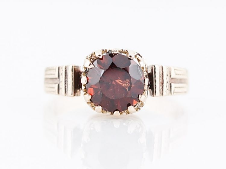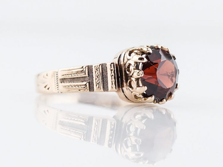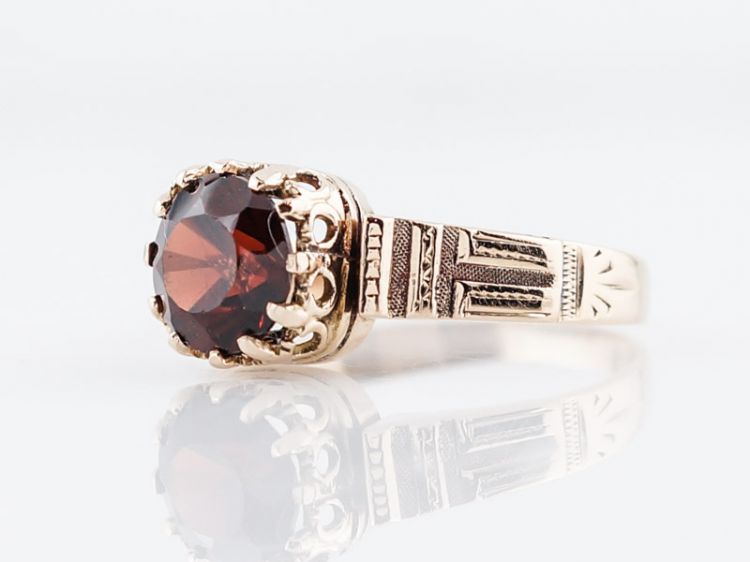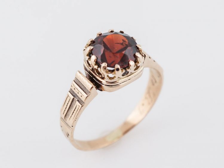 This antique Victorian ring is made with 14k yellow gold which beautifully compliments the rich wine color of its garnet solitaire. Gorgeous hand crafted detail work adorns the shaft of the ring and rounds out this lovely right hand ring.