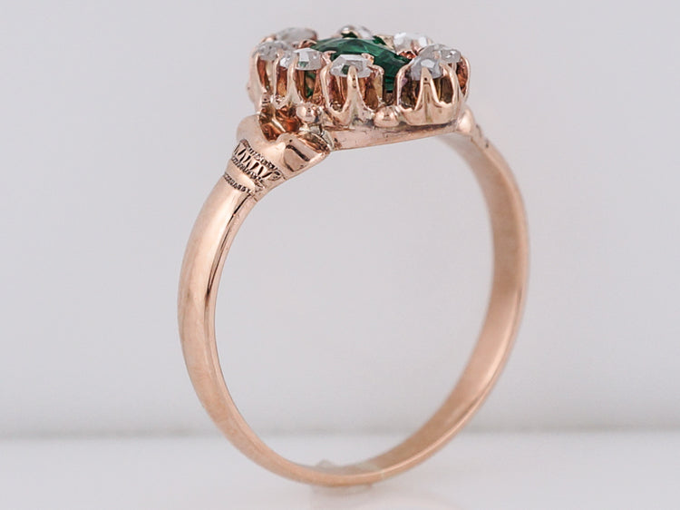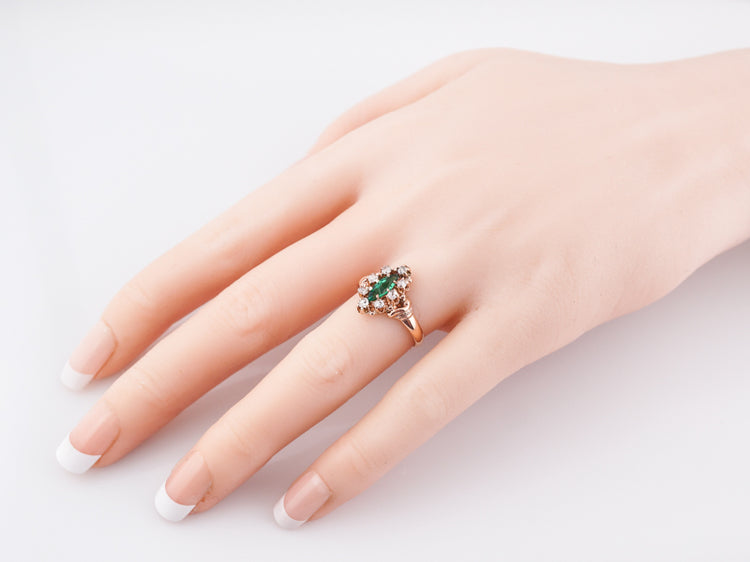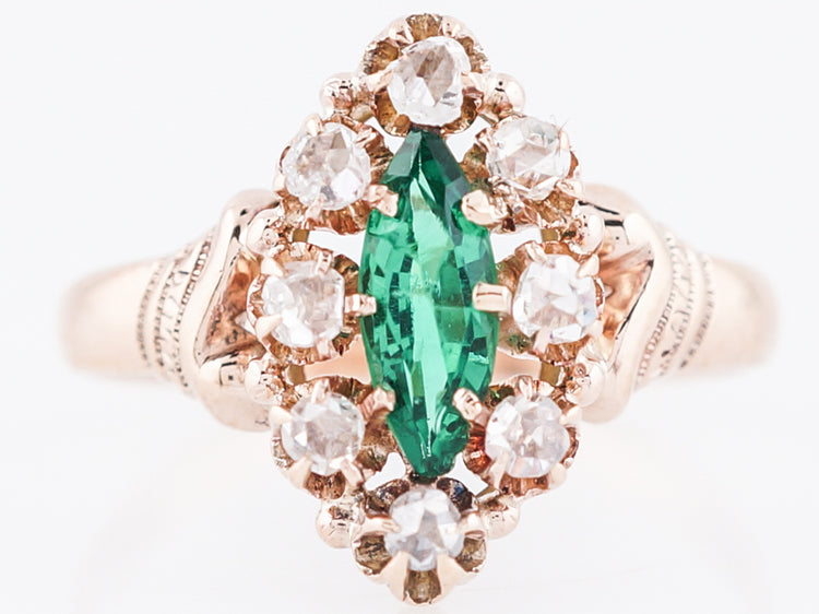 This elegant Victorian ring has a .30 carat prong set marquis cut synthetic emerald at its center that is surrounded by eight (8) prong set diamonds weighing .12 carat total. The ring is made with warm 10K rose gold.