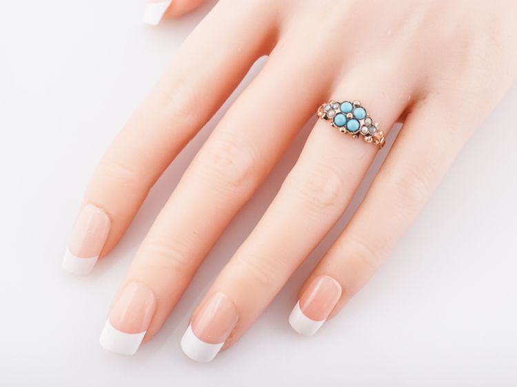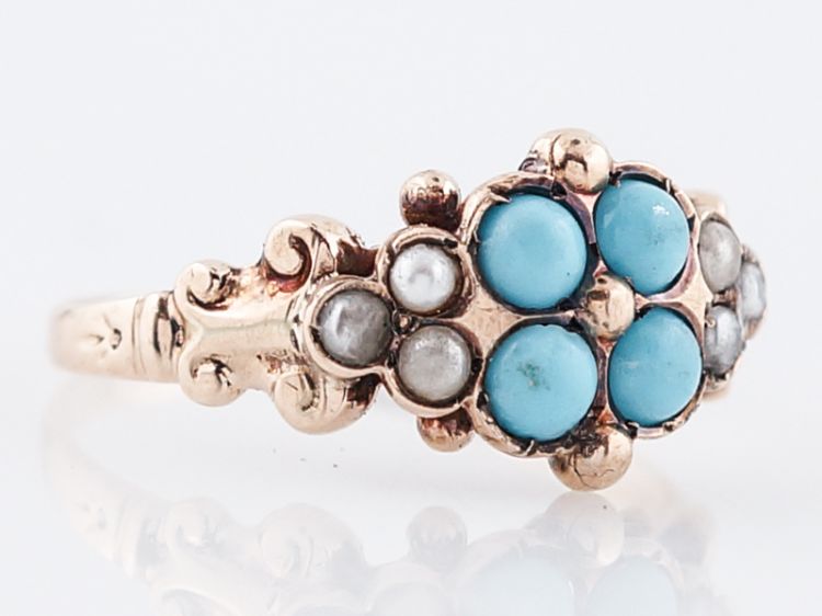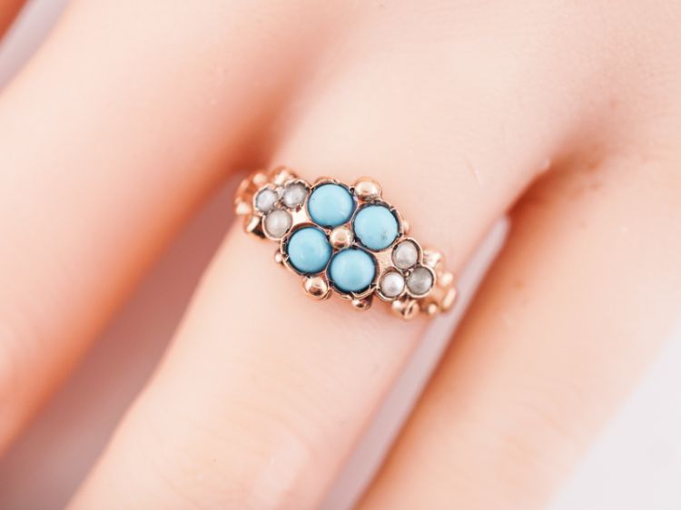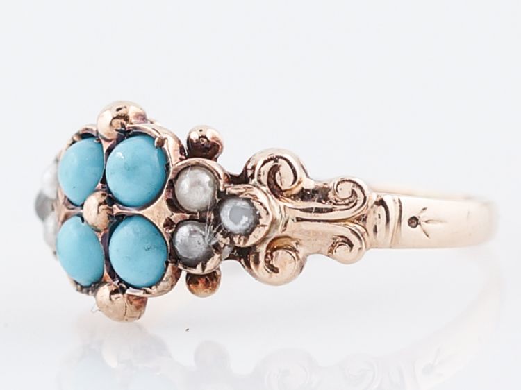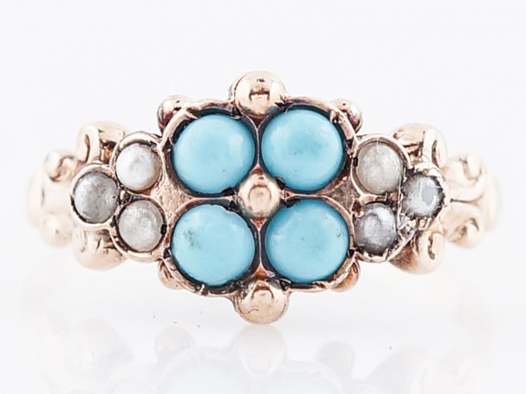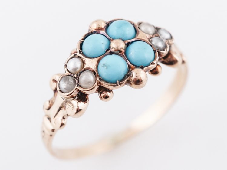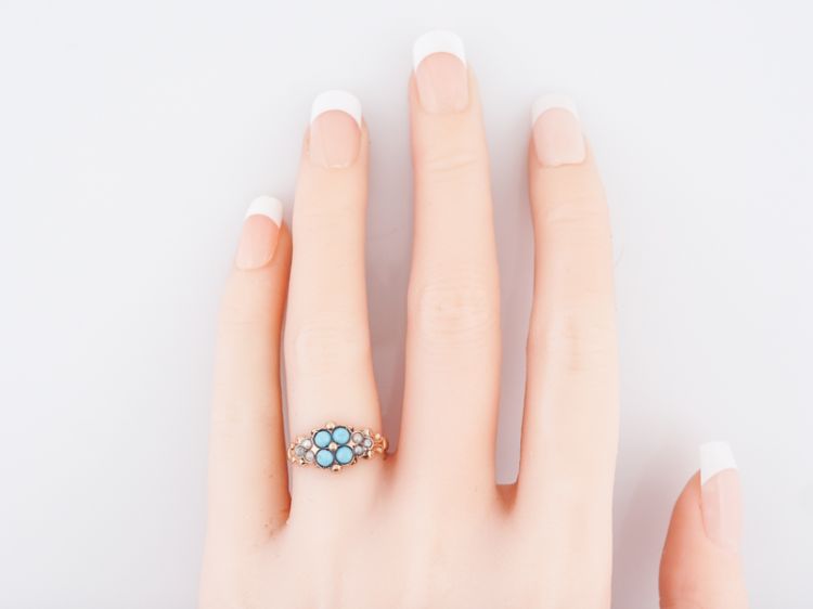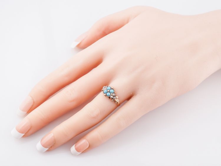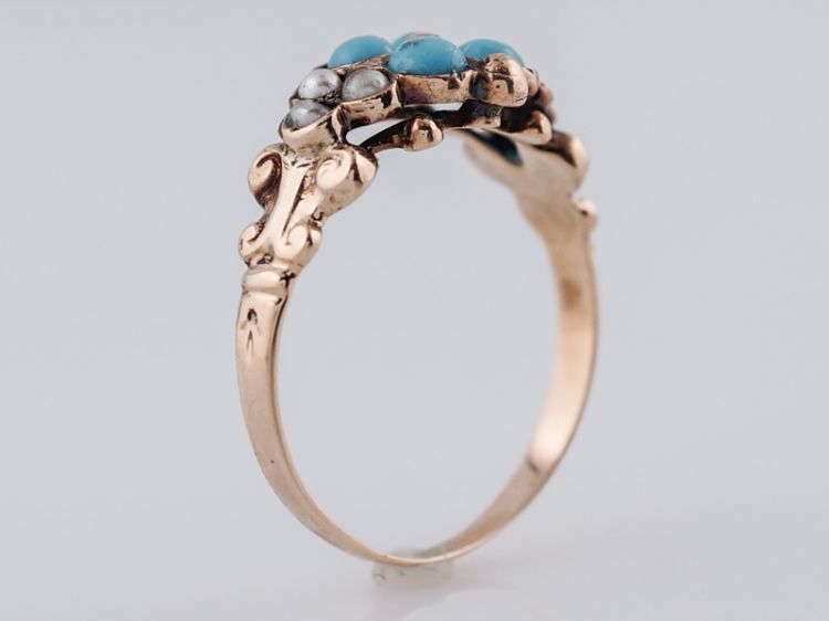 Antique Right Hand Ring Victorian .36 Cabochon Cut Turquoise & Seed Pearls in 14k Yellow Gold