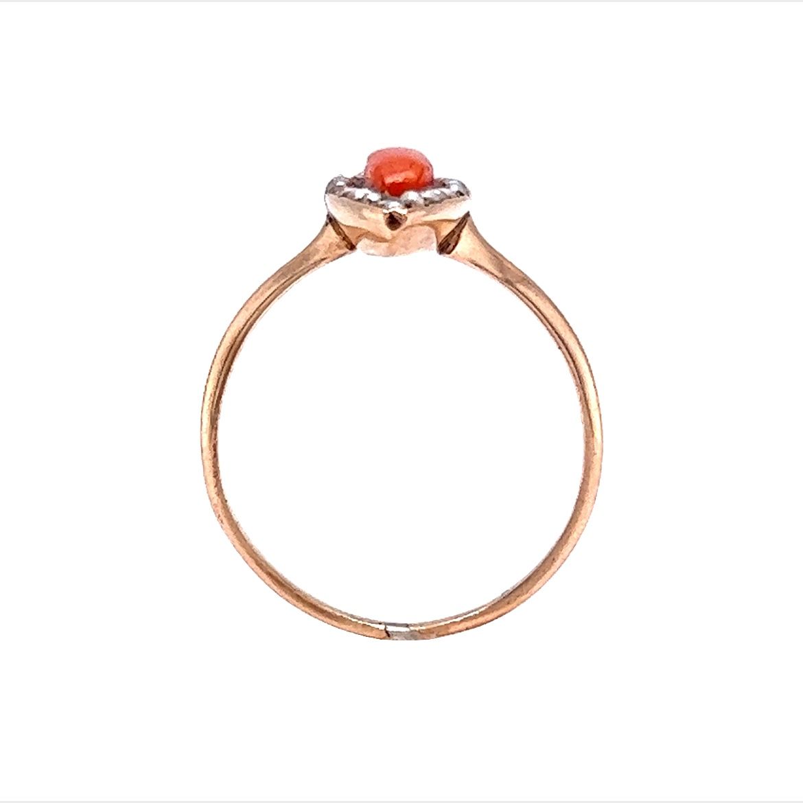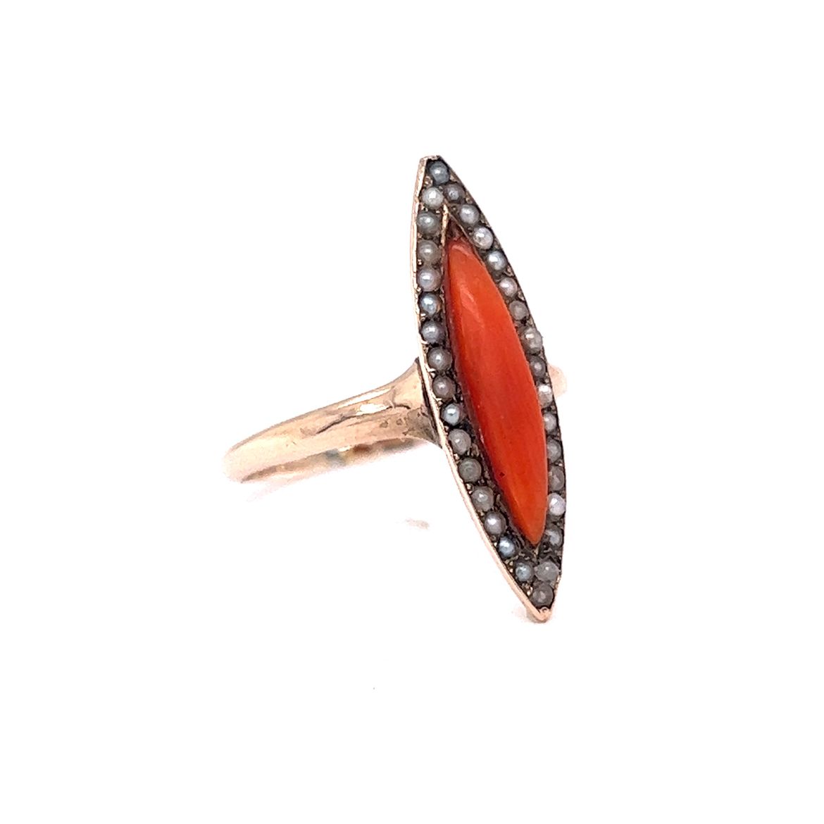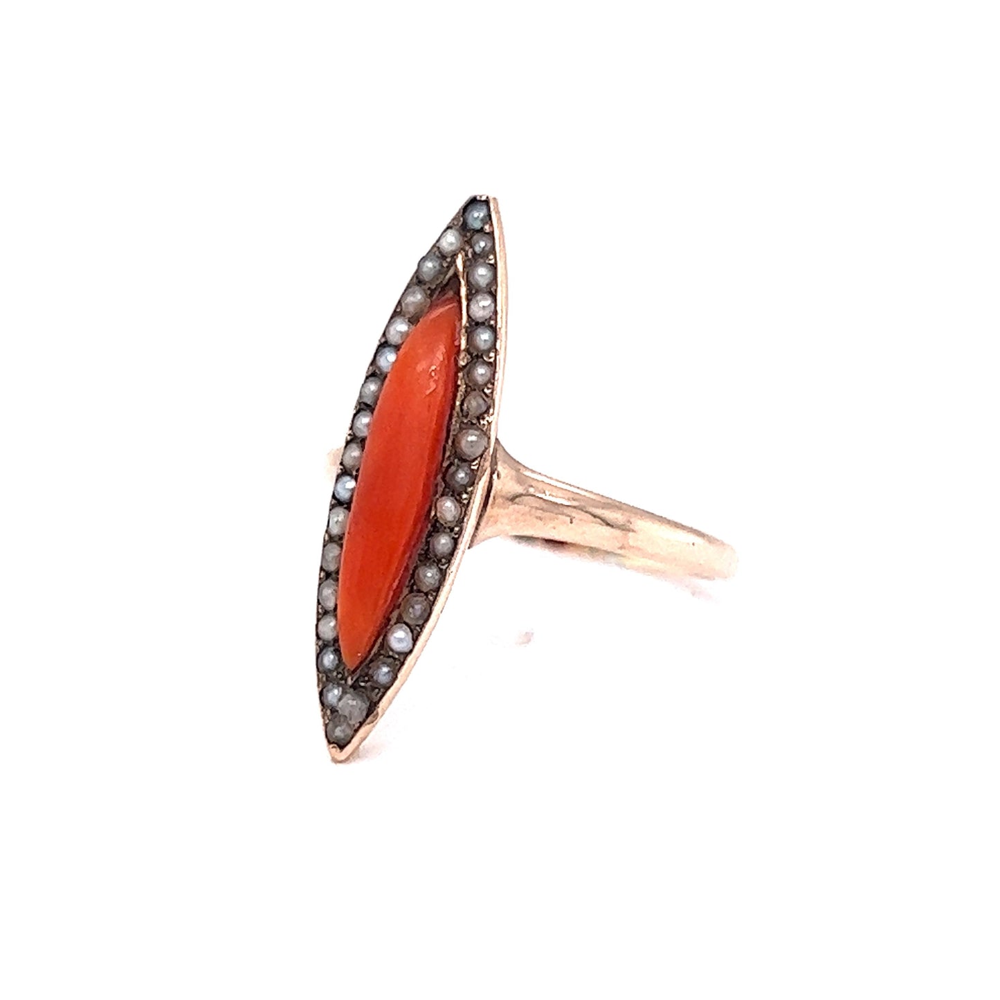 Antique Right Hand Ring Victorian Coral & Pearls in 14k Yellow Gold