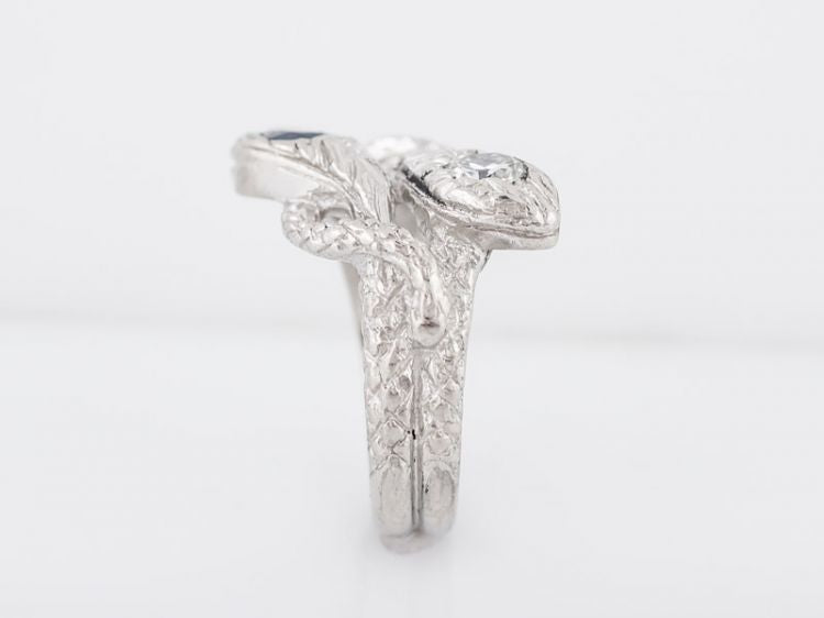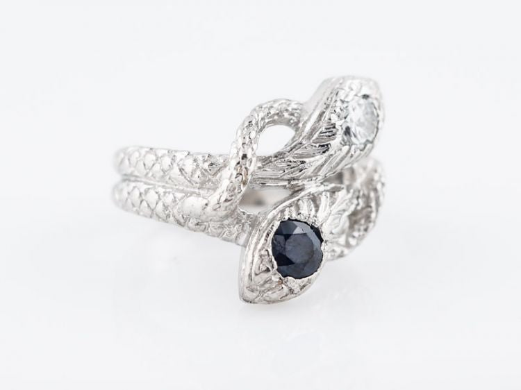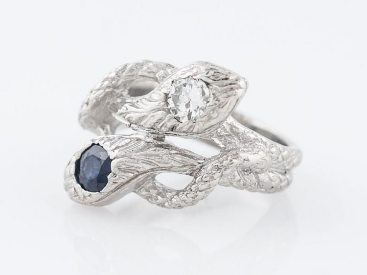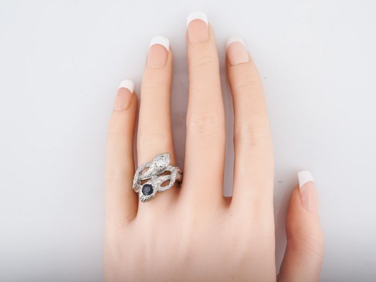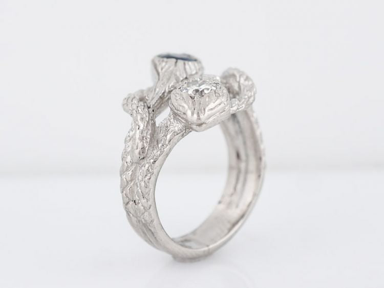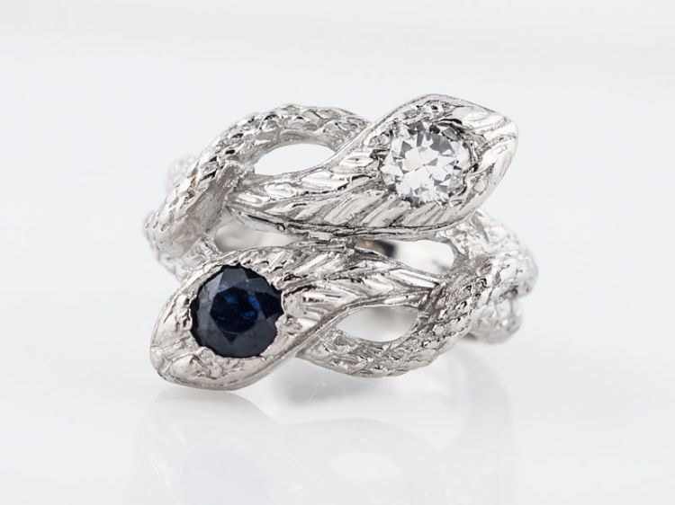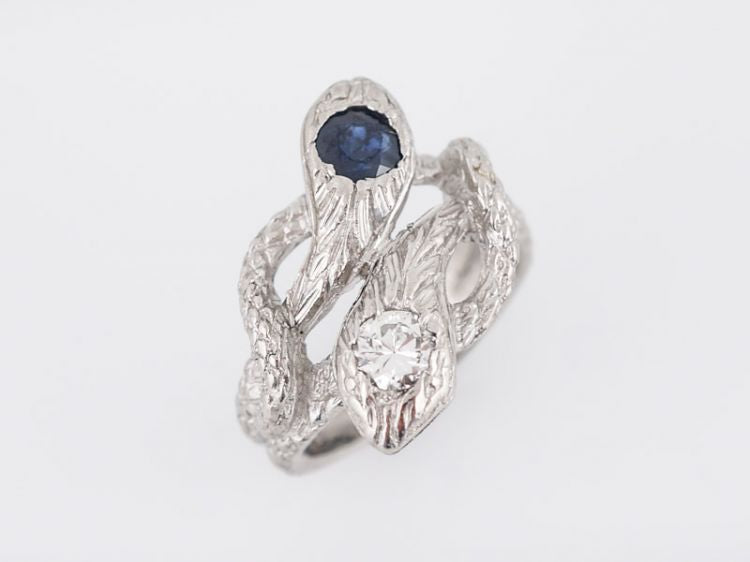This antique serpant ring was made in the Art Deco era. This platinum ring features two highly detailed intertwined snakes. One snake has a .40 Old European cut diamond set into its head and the other has a .35 round cut sapphire set into its head. Both of the coiled creatures have realistically rendered snake skin textures. The snake is an ancient symbol of feminine power and was symbolic of eternal love in the Victorian era.