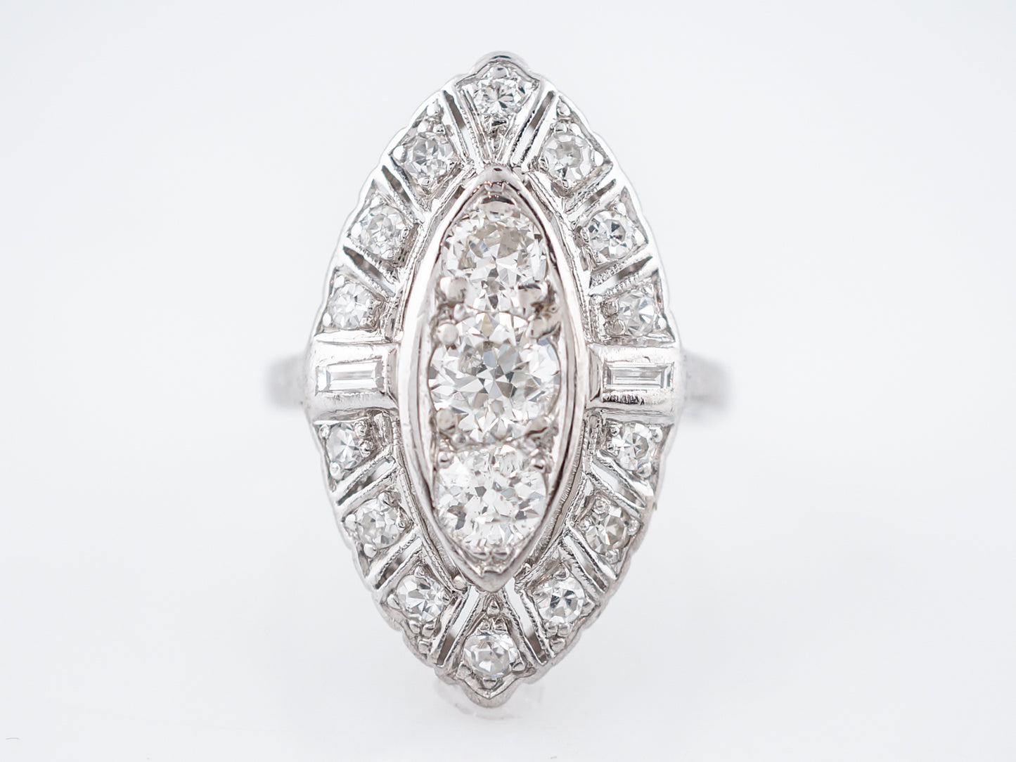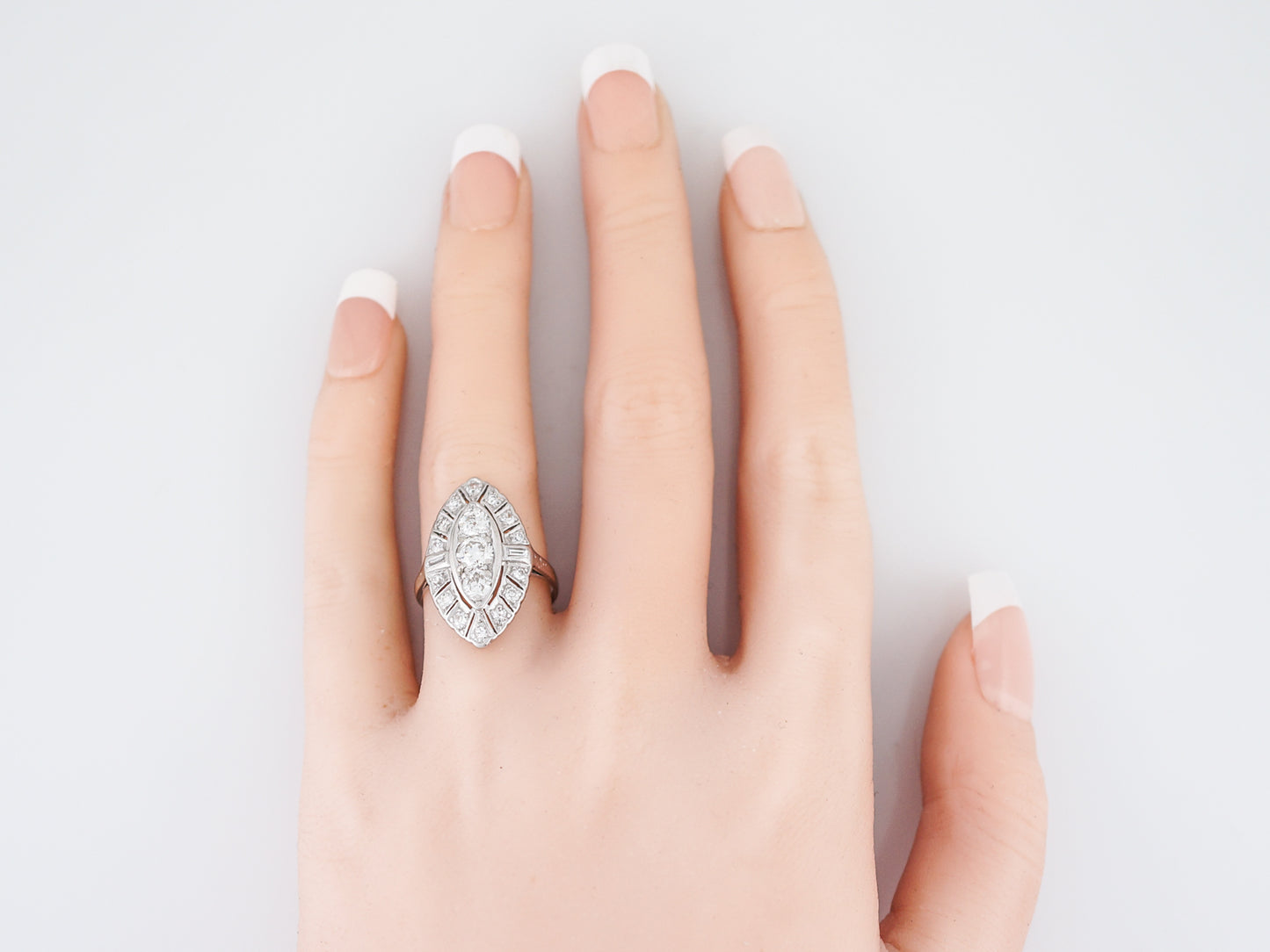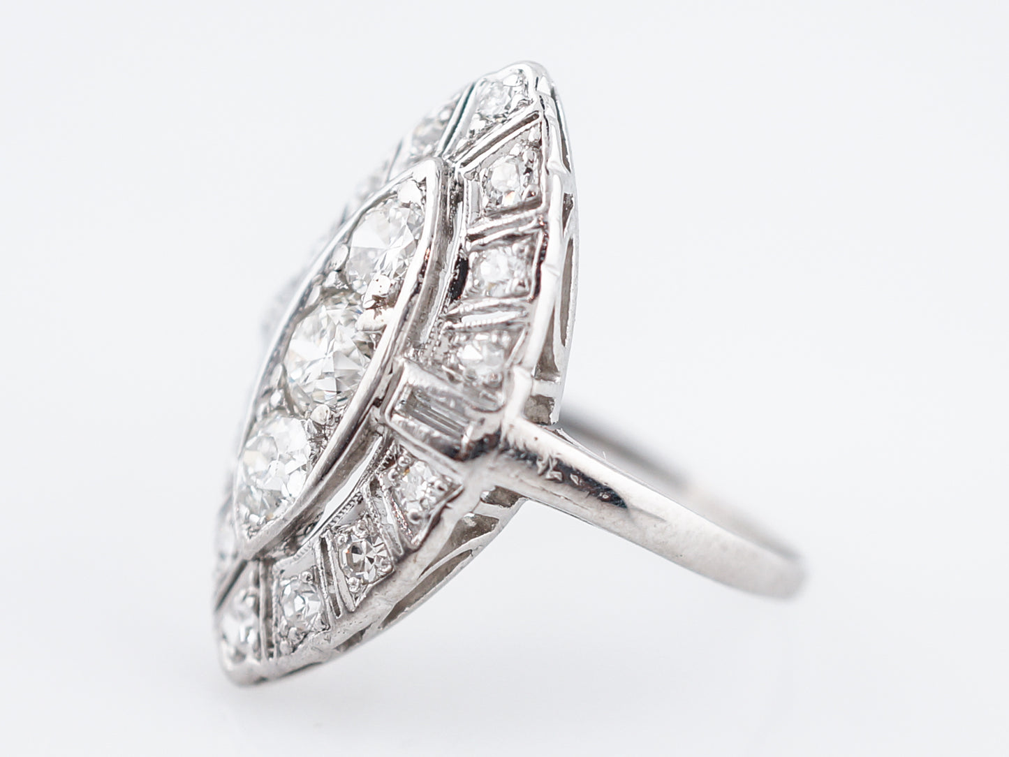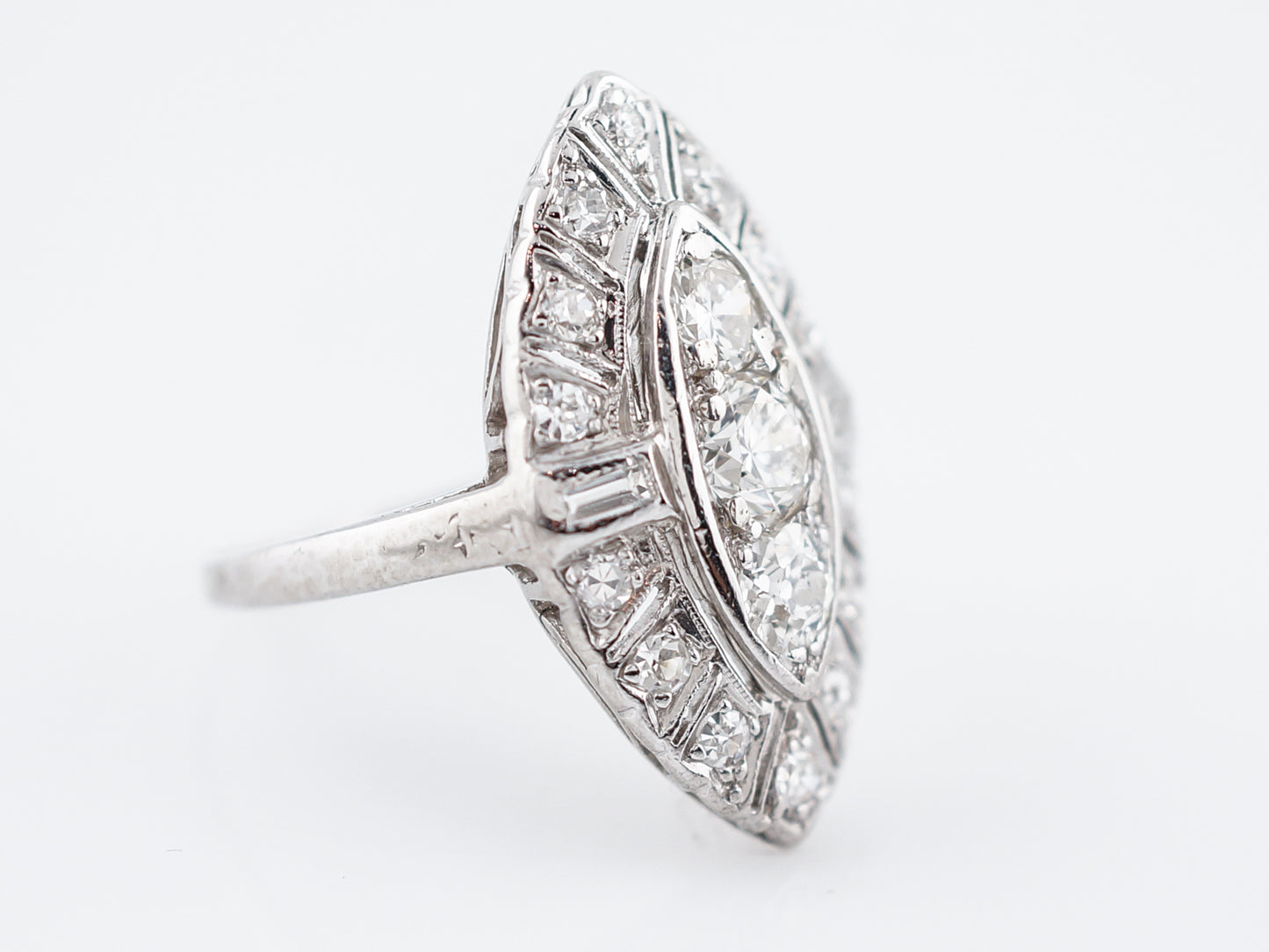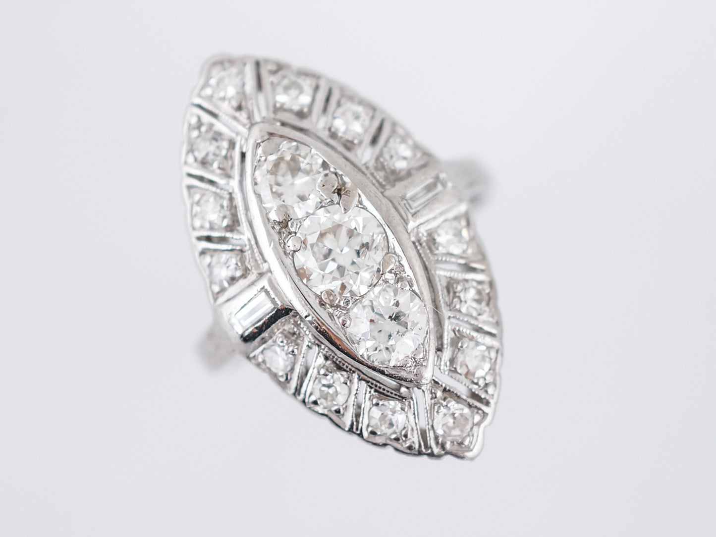 This antique Art Deco right hand navette ring has great presence. The three (3) center old European cut diamond are bead set and create a focal point. The center diamonds are surrounded by fourteen (14) old mine cut and old European cut diamonds bead set in decorative linear stations. The total diamond weight of this platinum ring is 1.17 carats. The marquise shape of this naïveté ring is an iconic design prevalent in the Art Deco period.