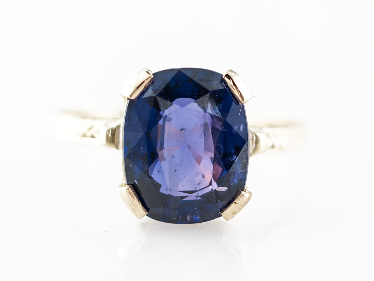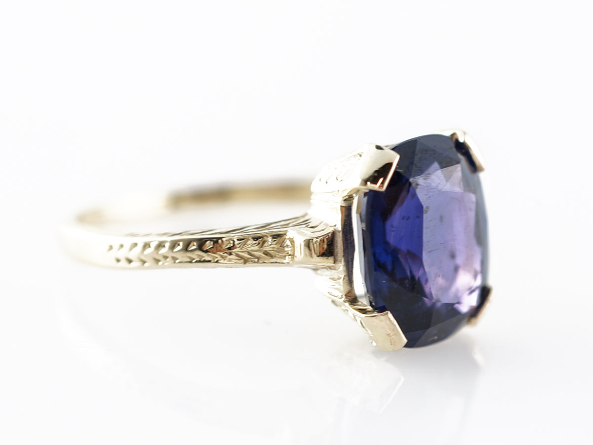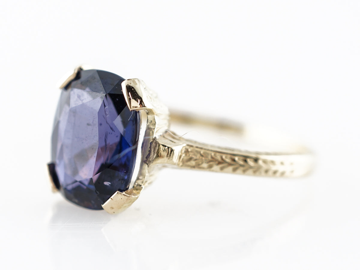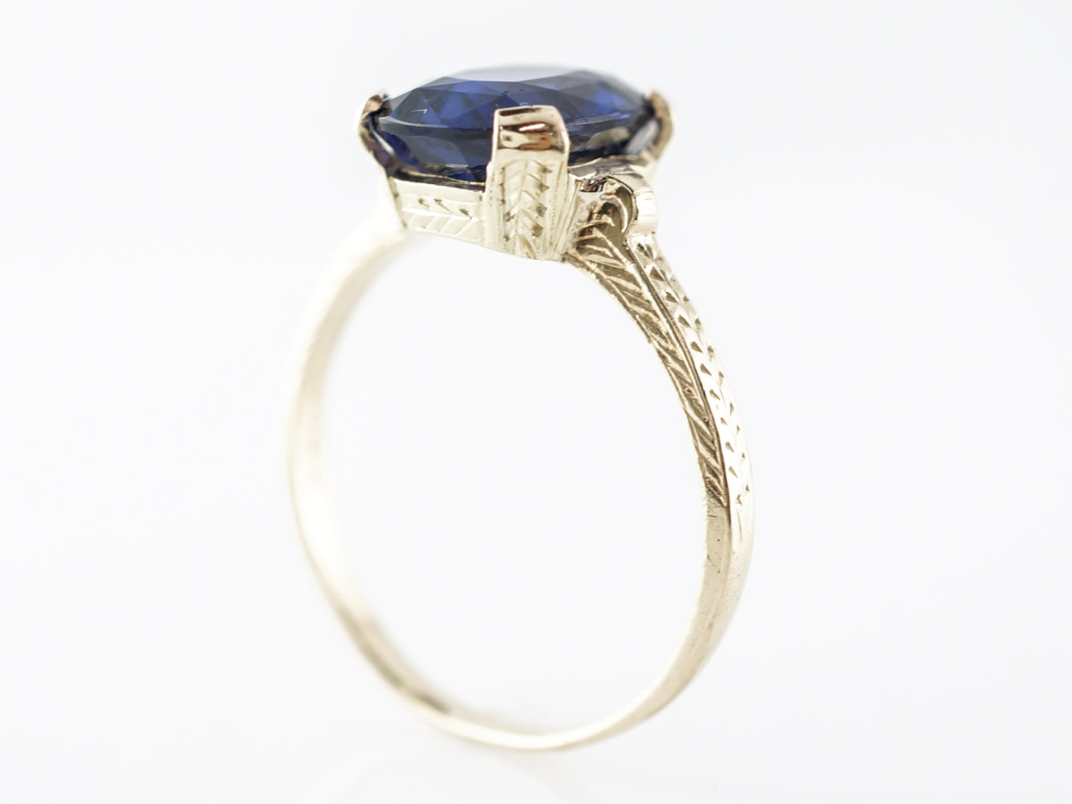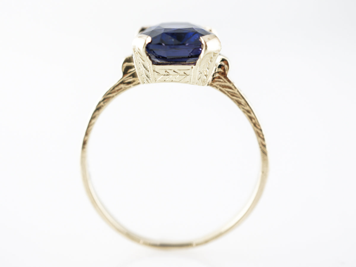 Antique Sapphire Engagement Ring in Yellow Gold. This marvelous Art Deco ring features a 3.32 carat oval cut sapphire finished in 14 karat yellow gold. The blue sapphire really comes out against the polished and engraved yellow gold, which is adorned with lovely chevrons down the shoulders. The stone is secured with flat prongs and open on its sides, letting a good amount of light into the stone to enhance its beauty.