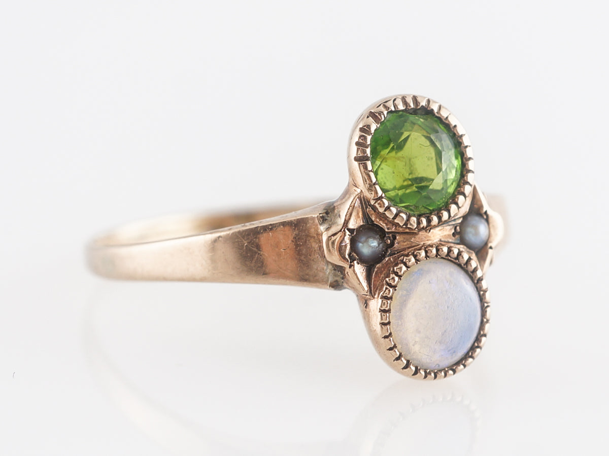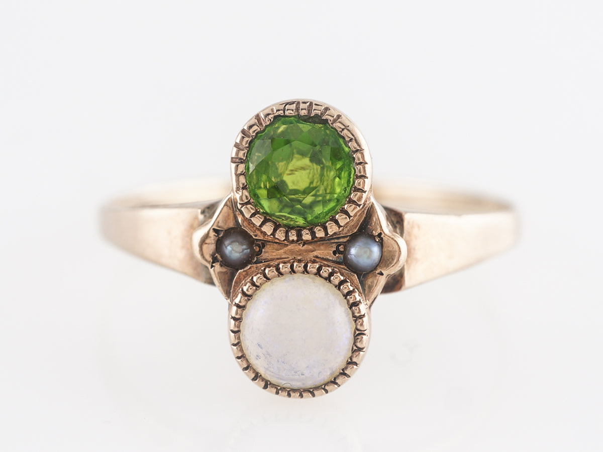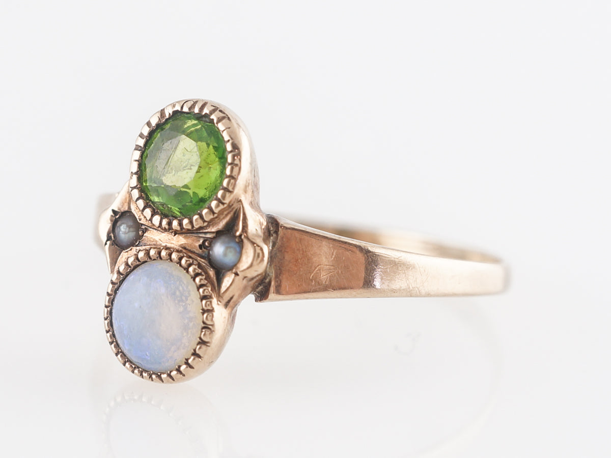 Antique Tourmaline Opal Cocktail Ring in 9k Yellow Gold. This wonderful vintage right hand ring features a cluster of eclectic gemstones full of interesting colors and textures that are set in 9 karat yellow gold. The round tourmaline and opal are set in ornate bezel settings with seed pearls neatly placed between them for very balanced appearance. The bright green tourmaline provides a joyful bit of life to the dark antique patina of the gold. This unique Victorian ring will bring joy to anyone looking for something a little different from the norm.