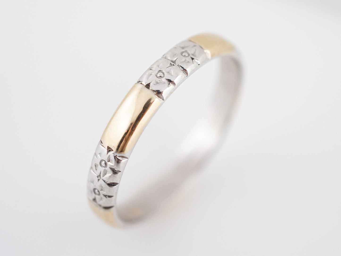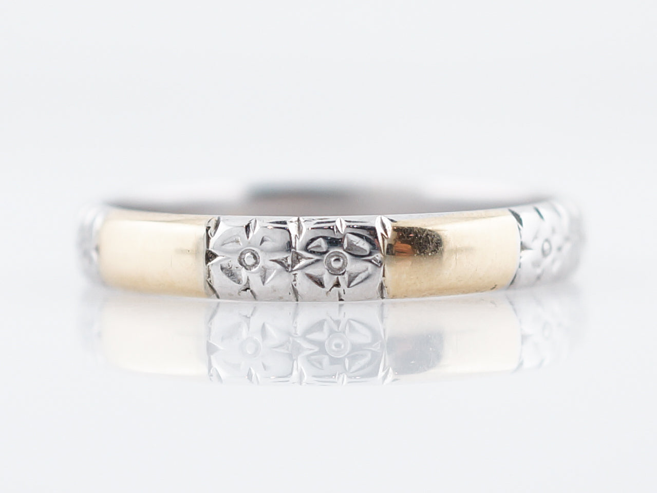 Done in both 14 karat yellow and white gold, this Retro (1940s) band was the epitome of late art deco, early Retro style. Smooth 14k yellow gold is interspersed with a 14k white gold orange blossom pattern. Both delicate and masculine at the same time, this band is a perfect alternative to a modern mens wedding band.