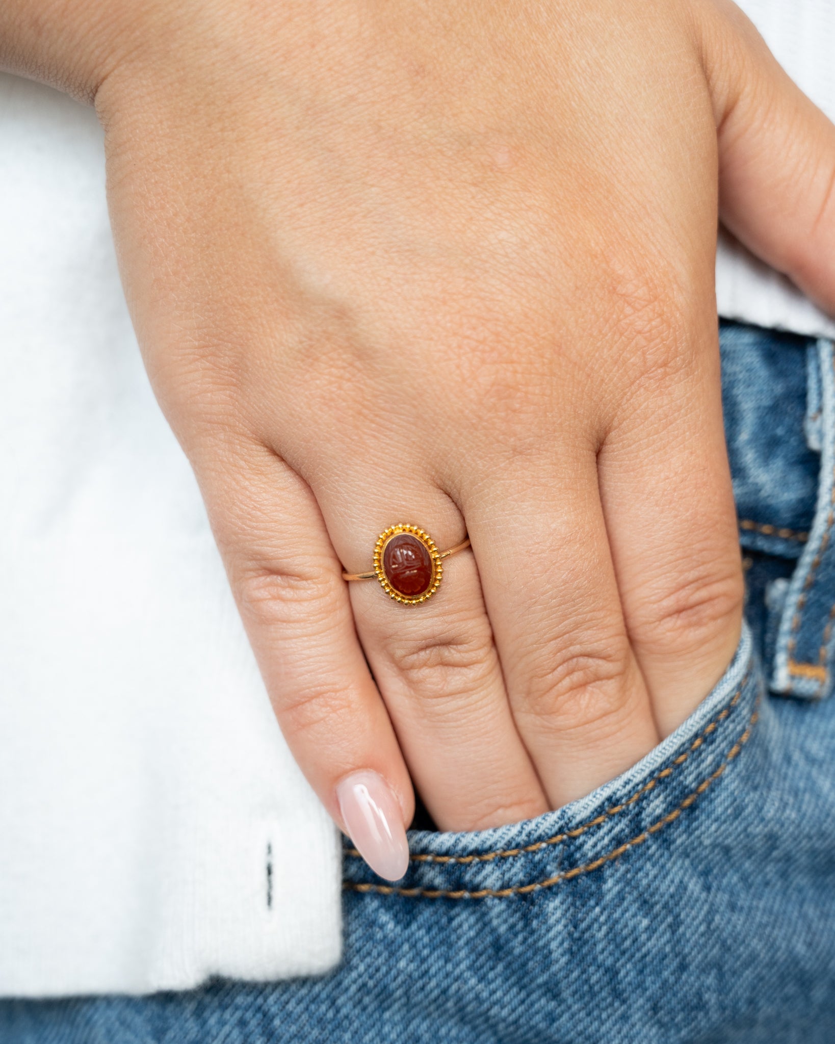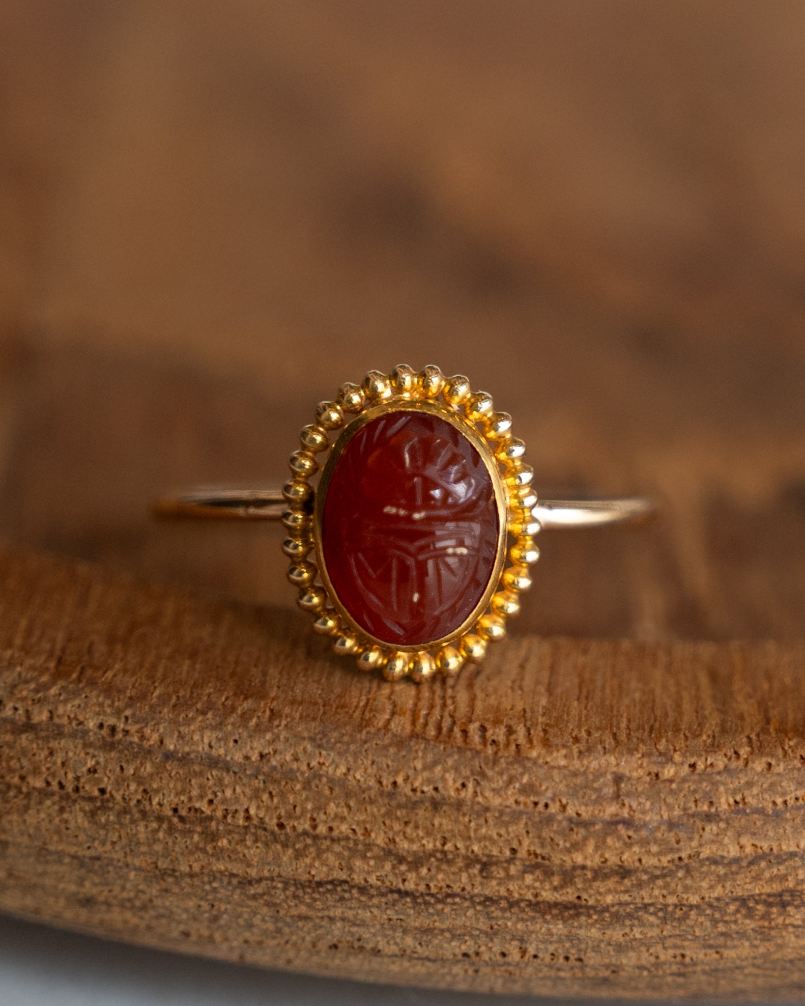 This antique Victorian-era 14 karat yellow gold ring features a carved carnelian scarab beetle that was originally part of a stick pin. The carnelian stone is bezel set to showcase the intricate scarab detailing while the antique beaded ring design adds texture throughout the band. This Victorian piece demonstrates the period's fascination with Egyptian motifs into wearable jewelry.