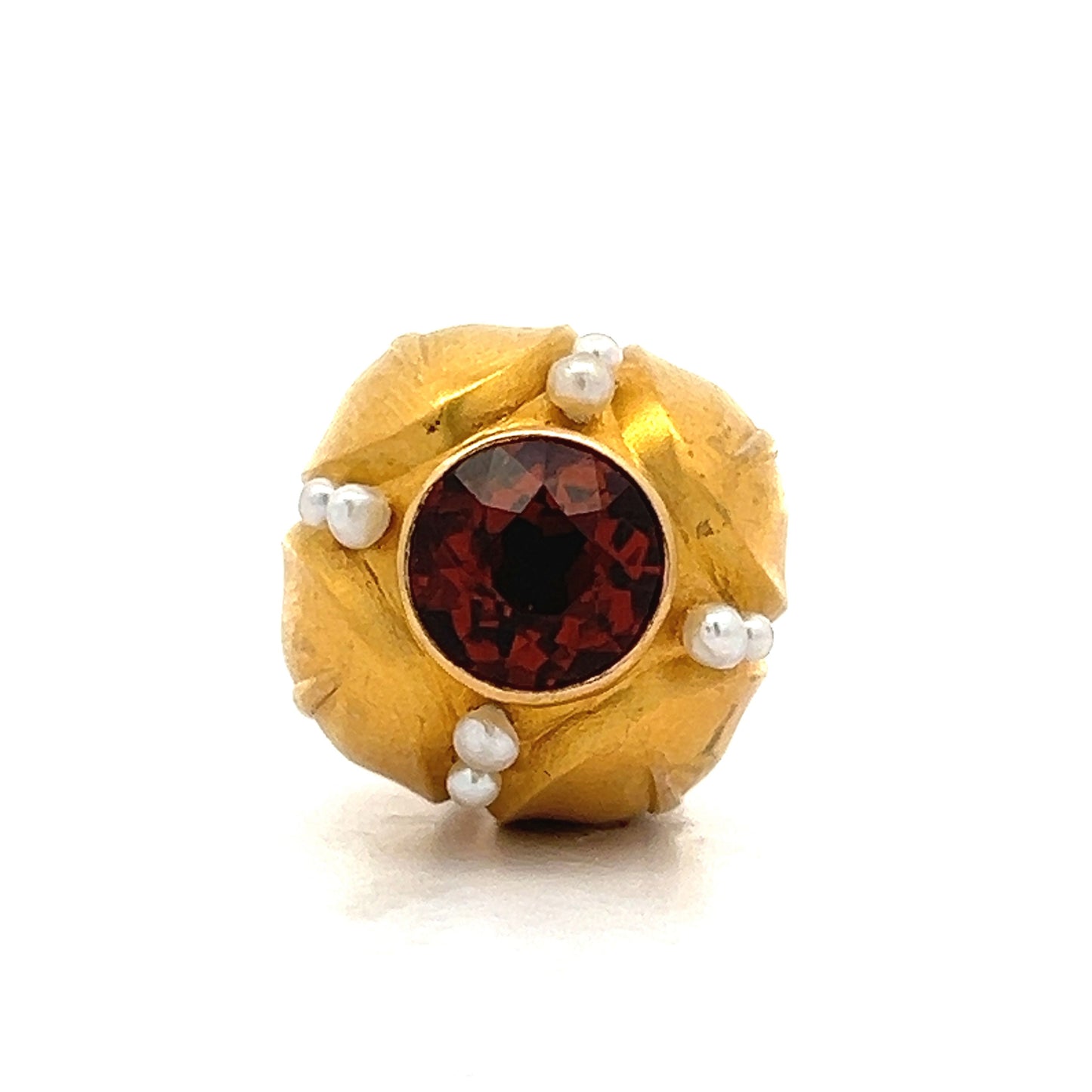 Crafted in 14 karat yellow gold, this necklace features a pendant with a bezel set citrine at the bottom, measuring 7.60 x 7.87 mm and weighing 2.00 carats. The round citrine adds a touch of warm color to the piece, while the brushed gold setting adds a unique texture. Eight (8) seed pearls are placed around the pendant, adding a touch of elegance and sophistication. These seed pearls, popular in Victorian era jewelry, give this necklace a romantic and feminine touch. Originally a Victorian hat pin, this necklace has been converted into a charming pendant. This necklace is truly a unique find!