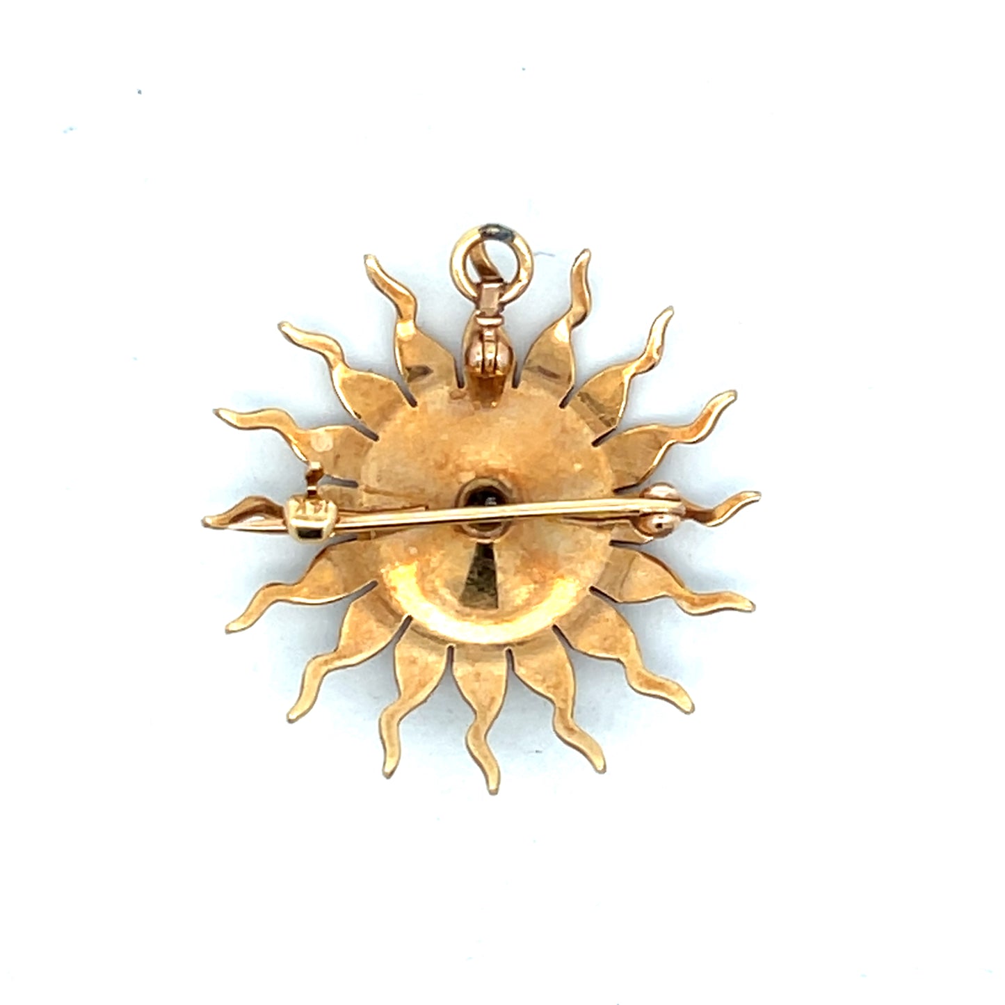 The pendant dates back to the Victorian period, showing the detailed craftsmanship typical of jewelry from that time. The combination of the yellow gold, diamond center, and pearl rays creates a distinctive sunburst pattern that resembles the actual sun.