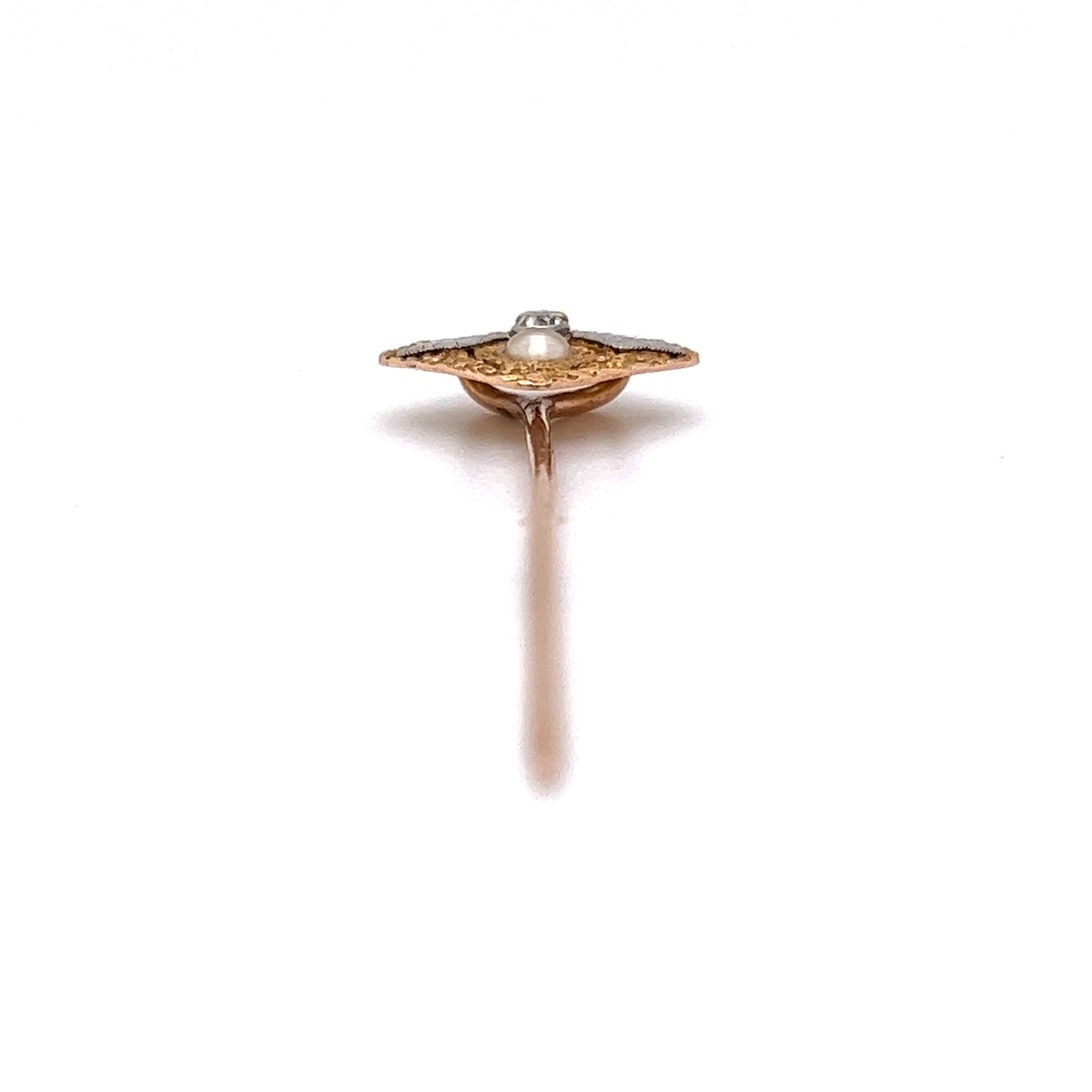 Antique Victorian Bee Pin in 14k Yellow Gold. This Victorian, two-toned bee pin features a .08 carat Old Mine cut diamond on a unique, 14 karat yellow gold setting. The bee’s body is made of a creamy, champagne-colored seed pearl and the head of the pin is embellished with a fascinating motif that spans into the bee's wings. Geometric and modern for its time, this Victorian pin measures 2.5” from top to bottom. Wear this work of art on the lapel of a blazer or through a scarf for a standout, fashionable look!